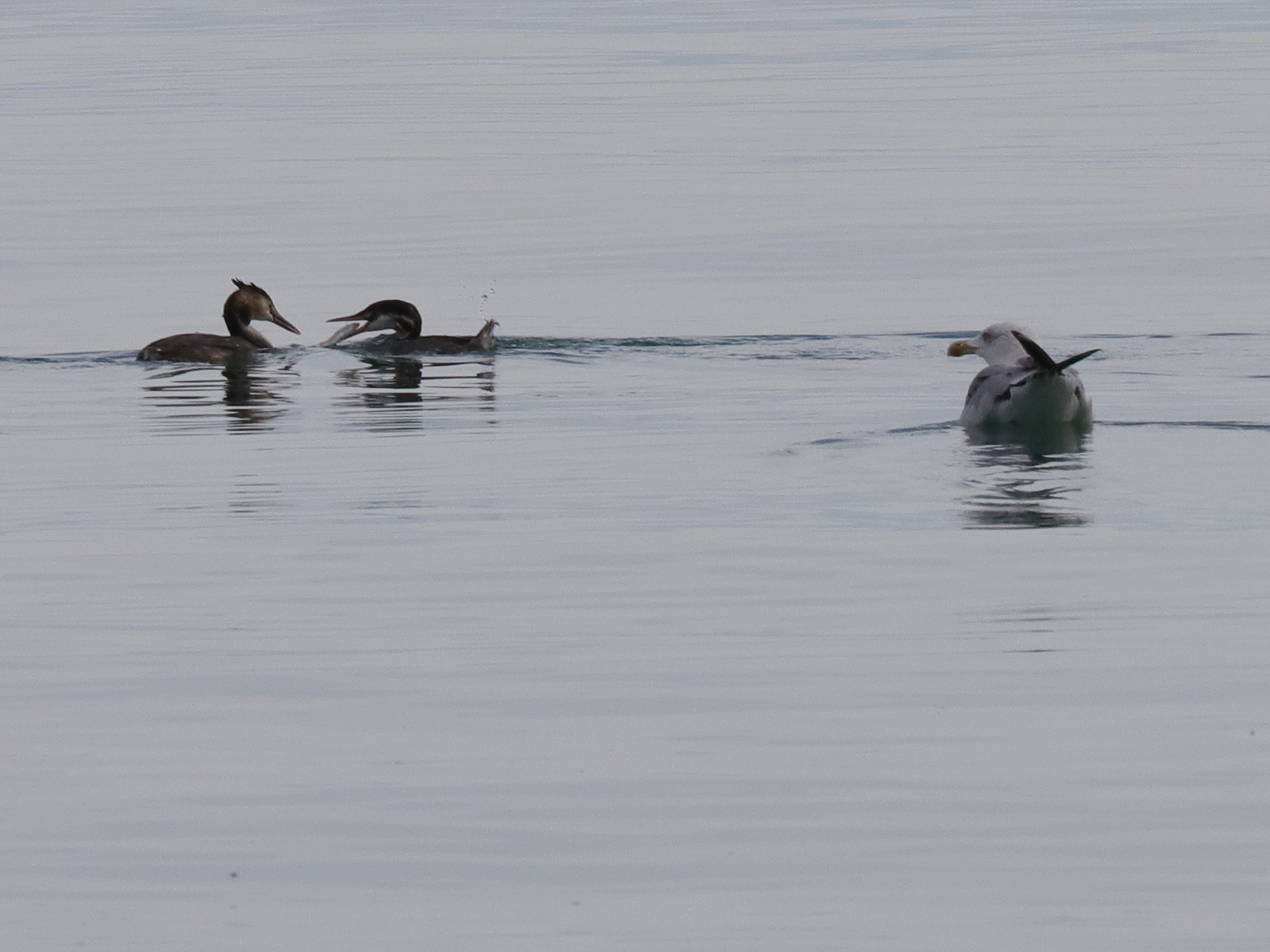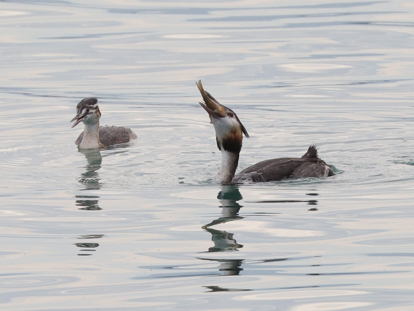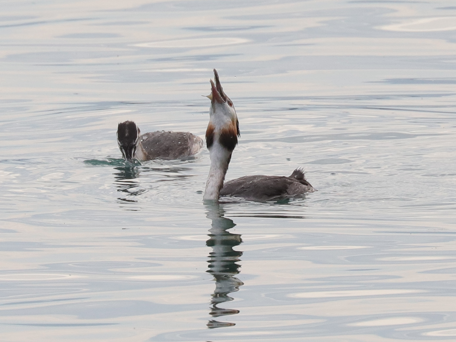 Les Grèbes huppés sommeillent le bec enfoncé dans les plumes, ce qui les fait ressembler à des bateaux militaires des années 1900. En passant, la langue doit bien aider lorsqu’ils ont un poisson dans le bec.
