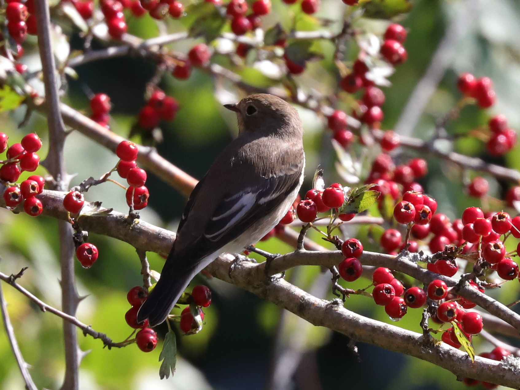 On pourrait croire que le Gobemouche noir va picorer de belles baies rouges. Mais non, il est strictement insectivore et virevolte en l’air pour capturer les moucherons qu’il a repéré.