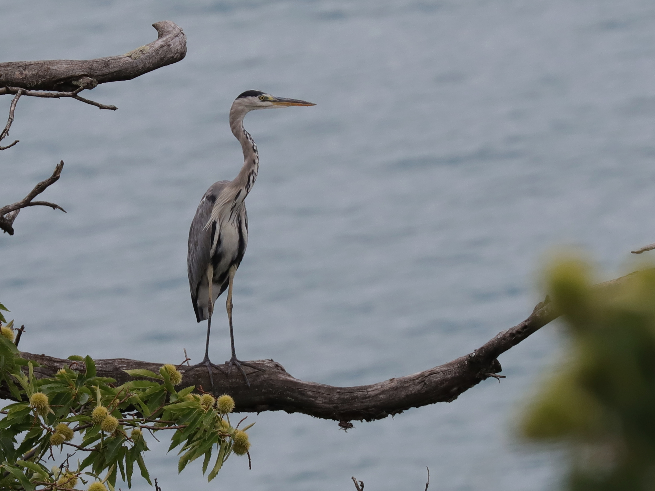 Un Héron cendré a choisi un vieux châtaignier comme perchoir temporaire.