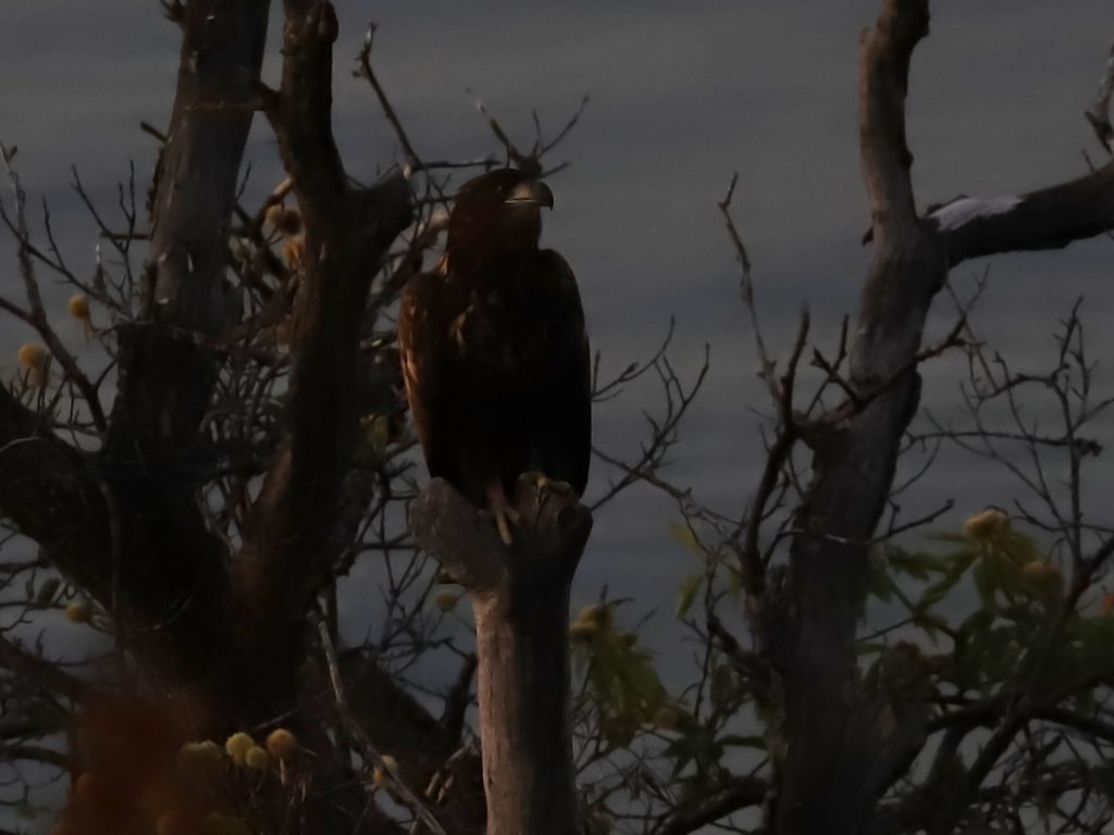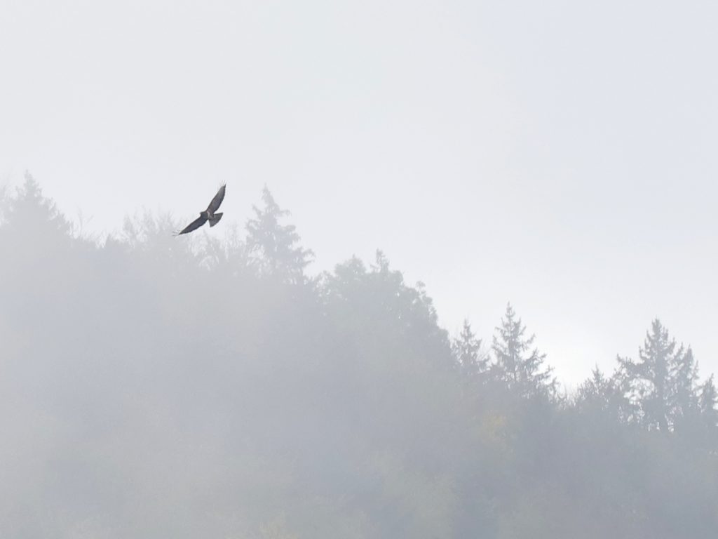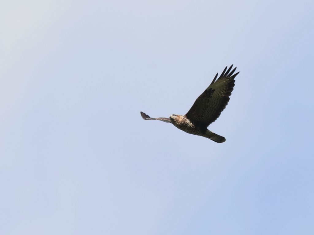 Correction du 1er nov : Ce rapace est une Buse variable, que j’ai pris pour une Bondrée par l’absence de barre alaire claire et l’absence de zone claire sur la poitrine. La Bondrée apivore voyage seule aussi. Les effectifs sont plus réduits que ceux du Milan royal, ce qui peut aussi expliquer cet isolement.
