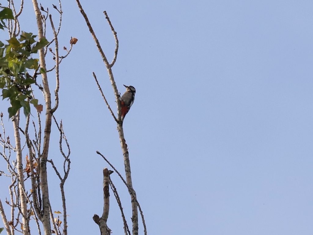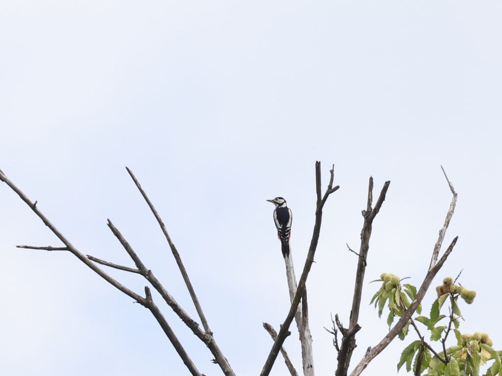 Un Pic épeiche prospecte les plus hautes branches d’un arbre.