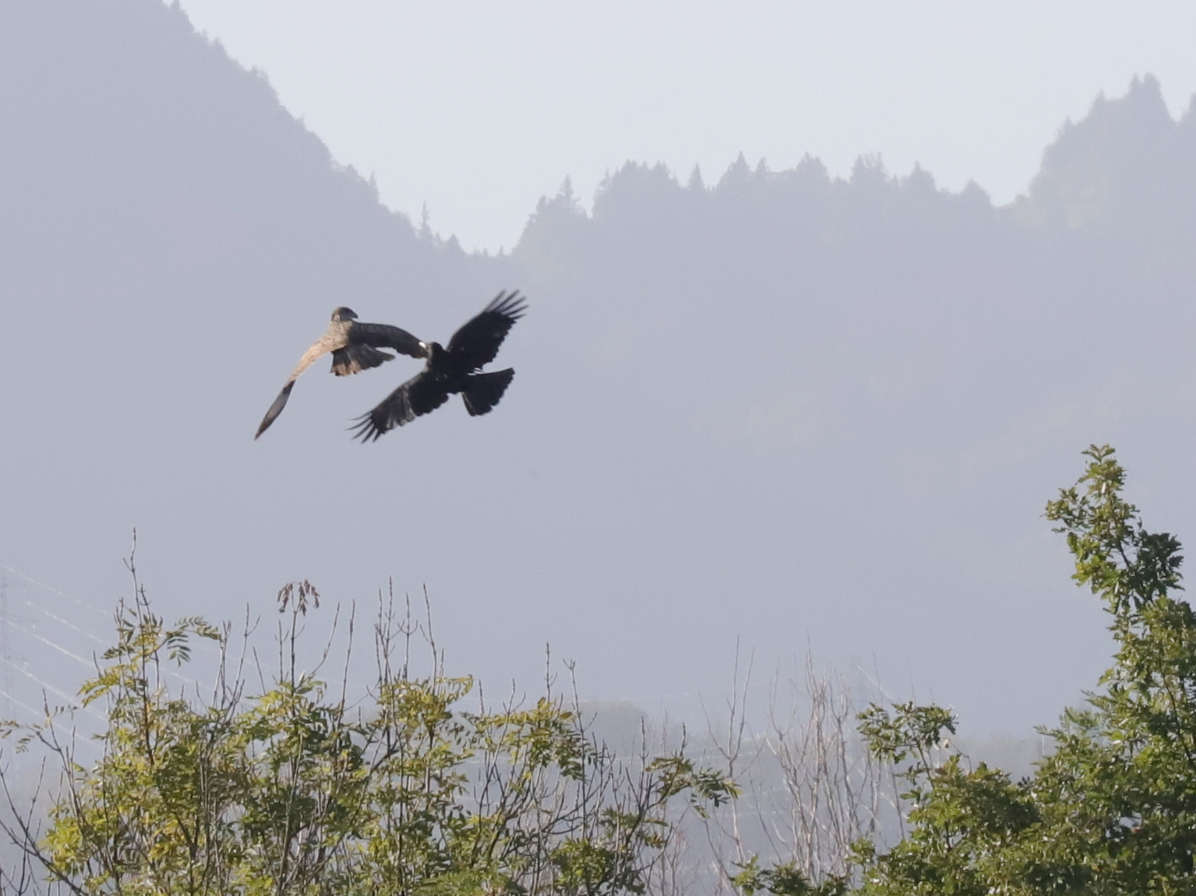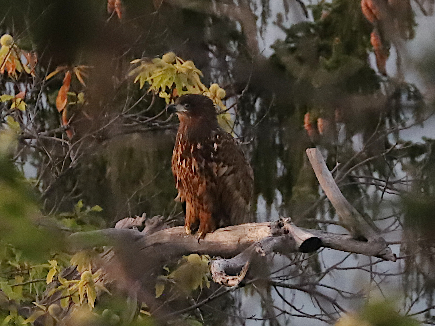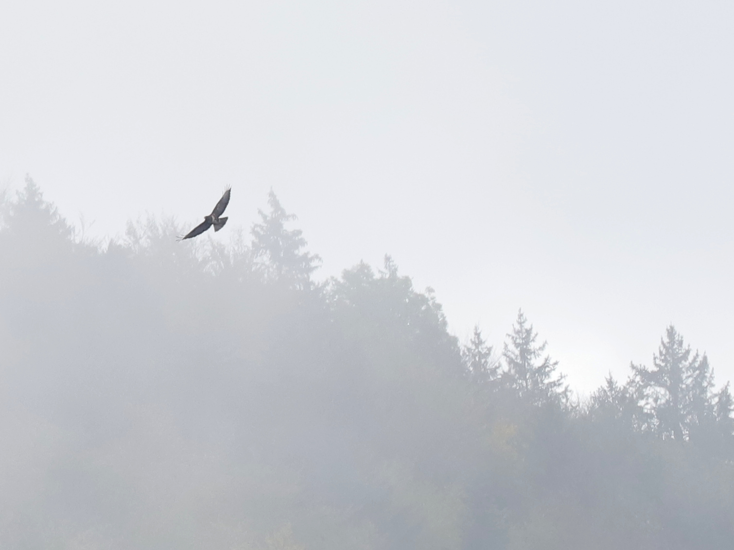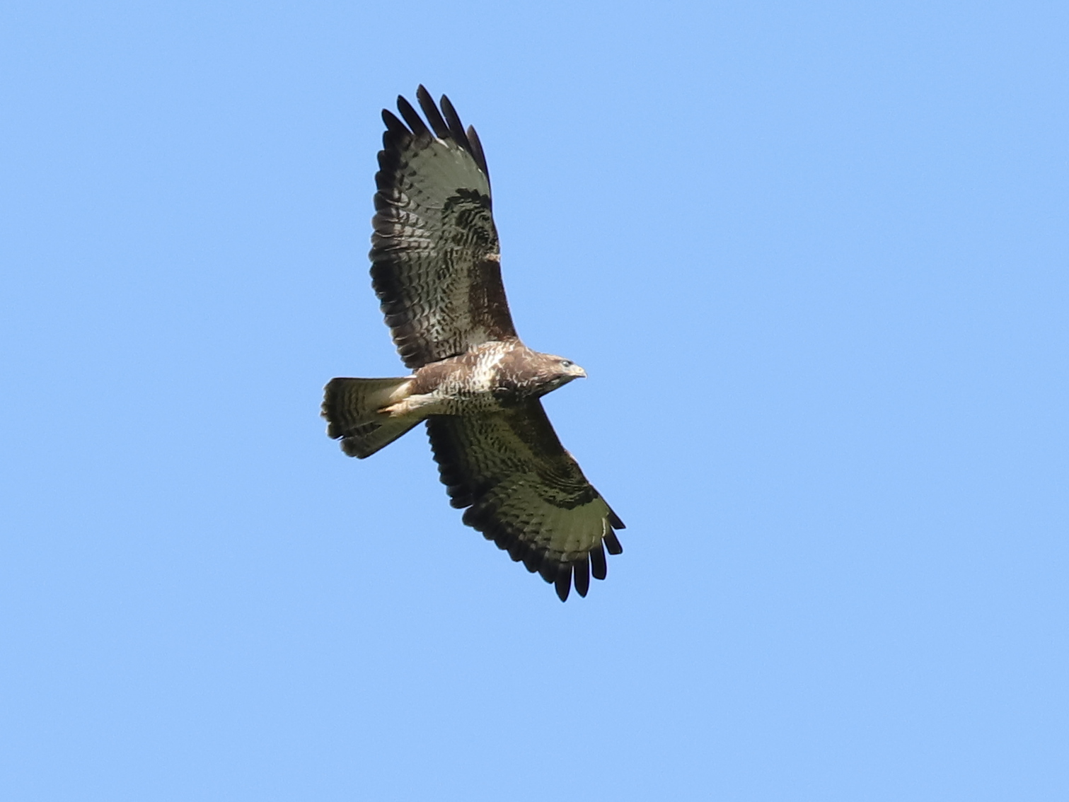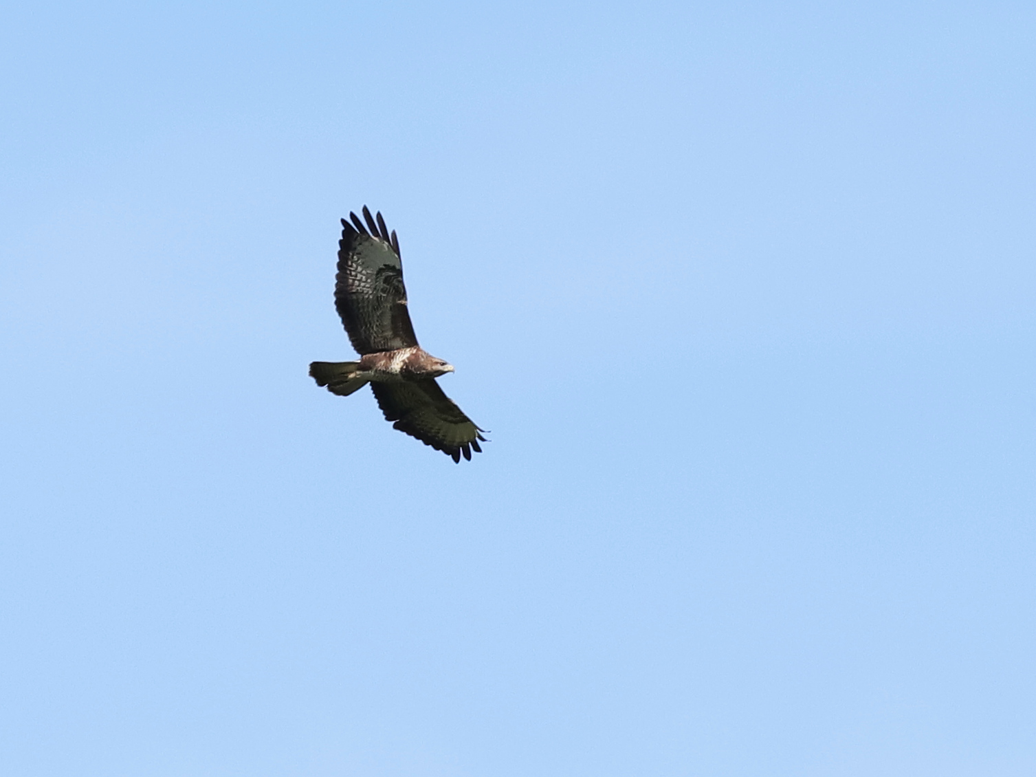 Correction du 1er nov : Ce rapace est une Buse variable, que j’ai pris pour une Bondrée par l’absence de barre alaire claire et l’absence de zone claire sur la poitrine. La Bondrée apivore voyage seule aussi. Les effectifs sont plus réduits que ceux du Milan royal, ce qui peut aussi expliquer cet isolement.