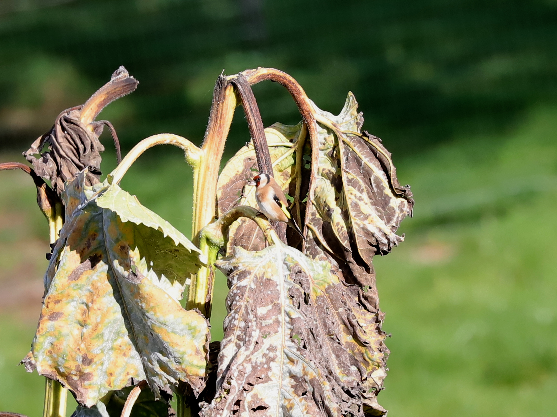Quelques Chardonnerets élégants explorent ce qui reste dans un potager, dont des tournesols flétris.
