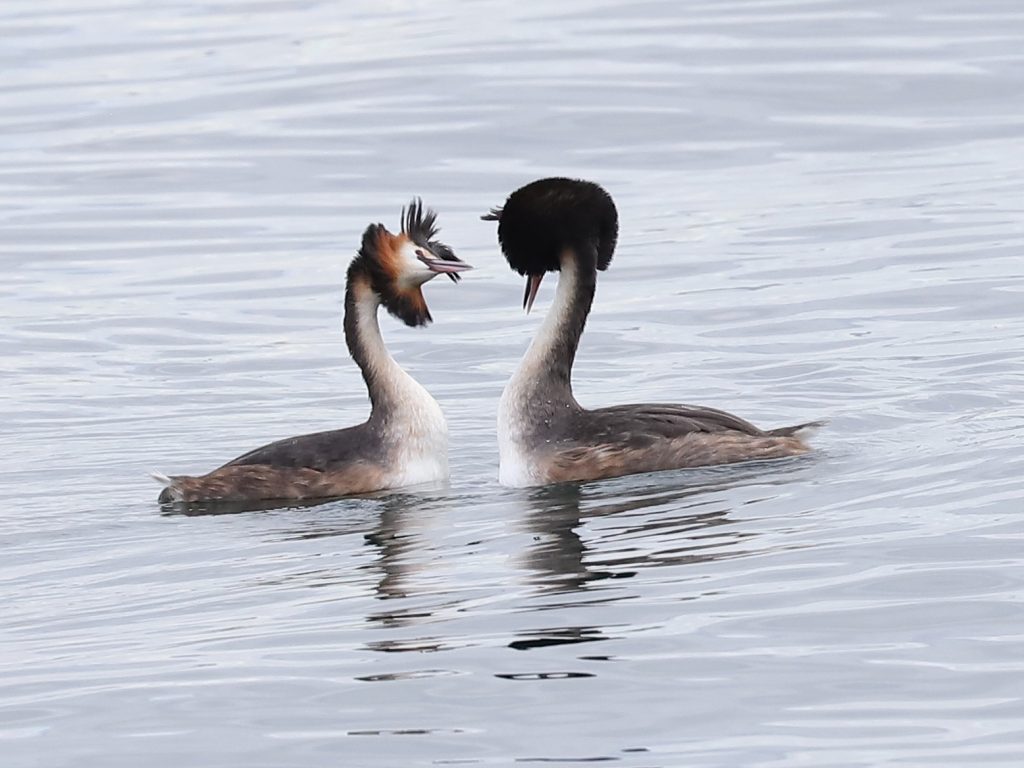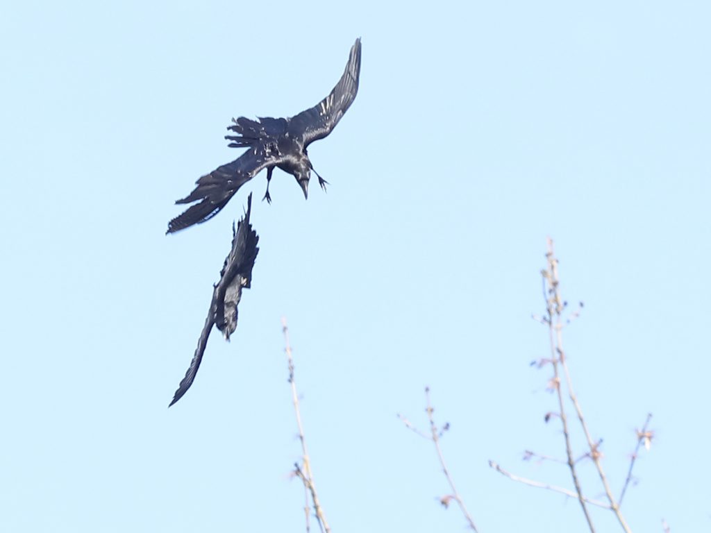 Les Grands corbeaux, dont je pensais les vols nuptiaux terminés, se sont livrés encore à de splendides exhibitions dignes de la Patrouille de France, panaches de fumée en moins.Vol synchronisé à deux, plongés et piqués et surtout des pirouettes menant deux oiseaux presque en face à face depuis très haut dans le ciel jusqu’à la limite des arbres.