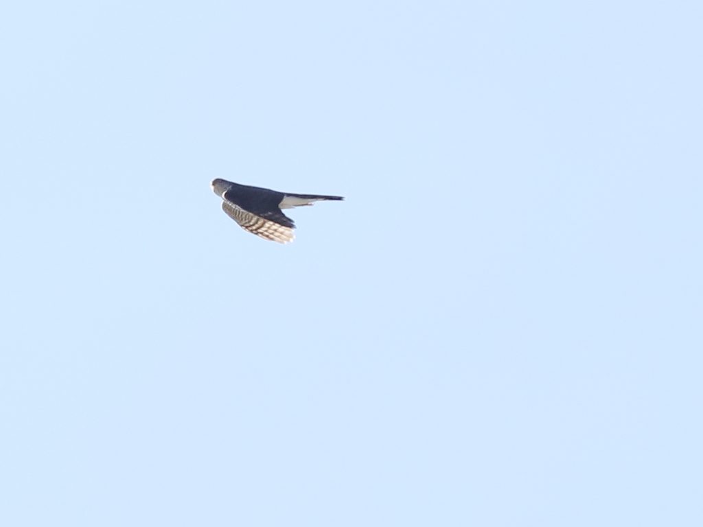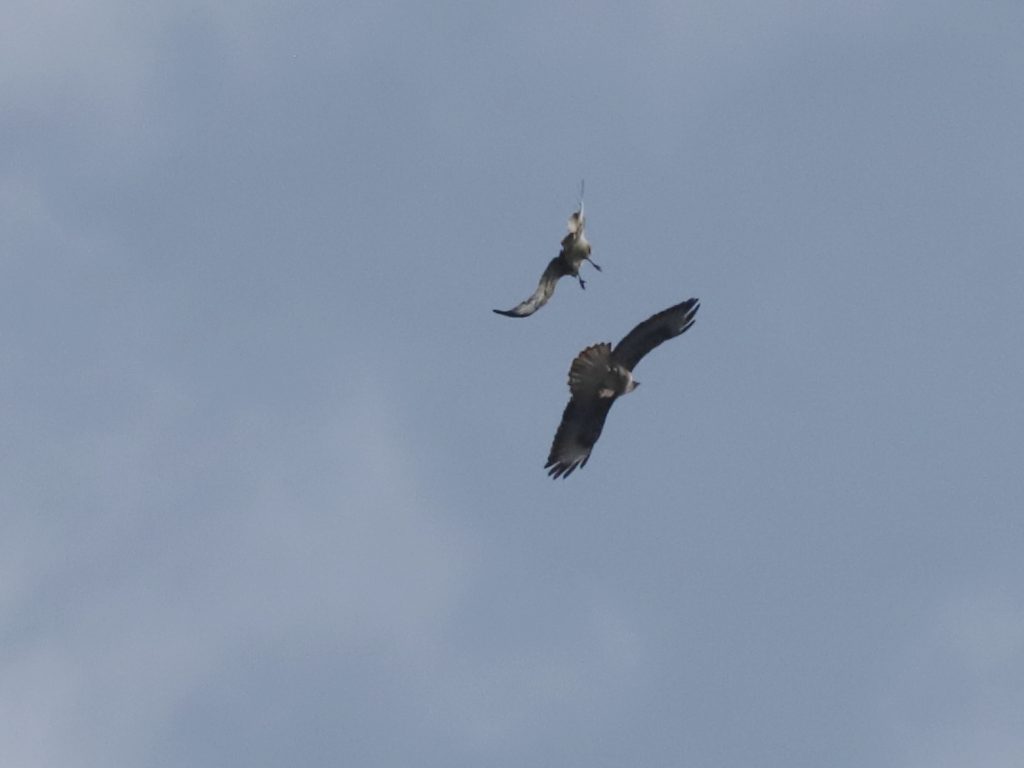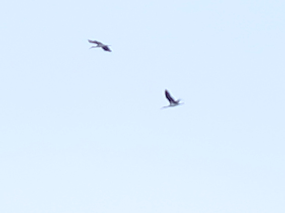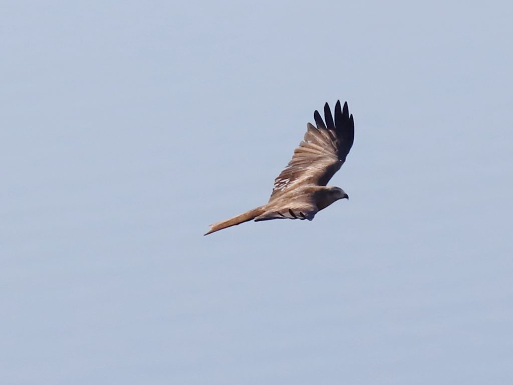 en premier, vu de très loin, un Busard Saint Martin, mâle, reconnaissable à l’extrémité noire des ailes et le bord de fuite des ailes noir également.