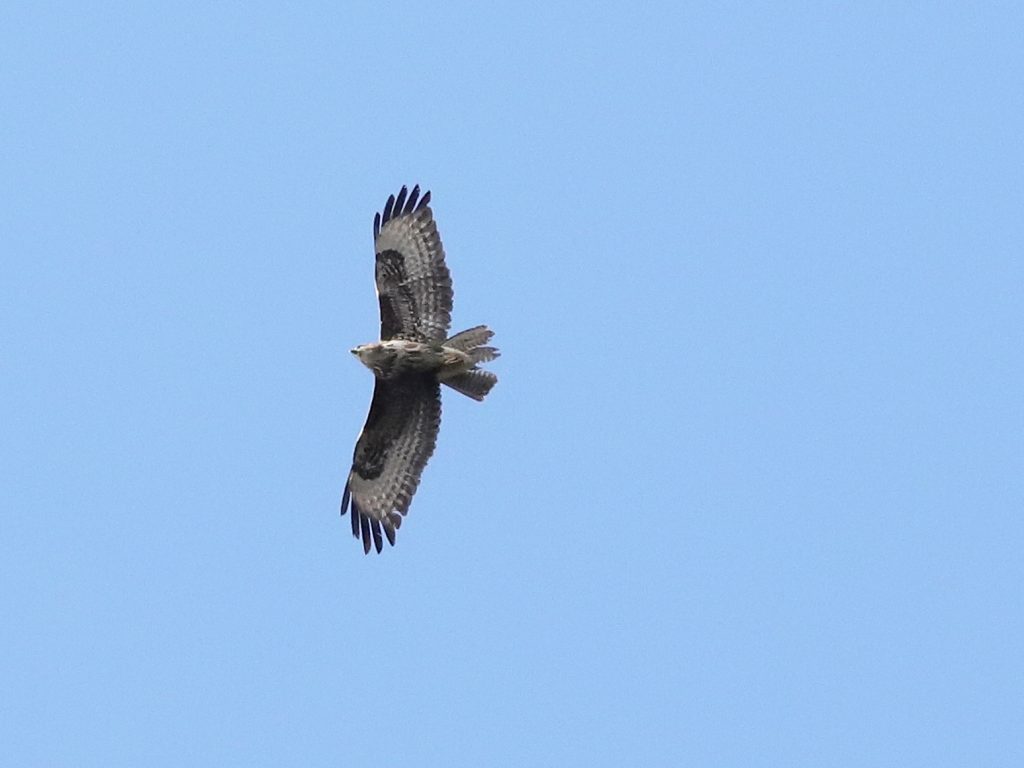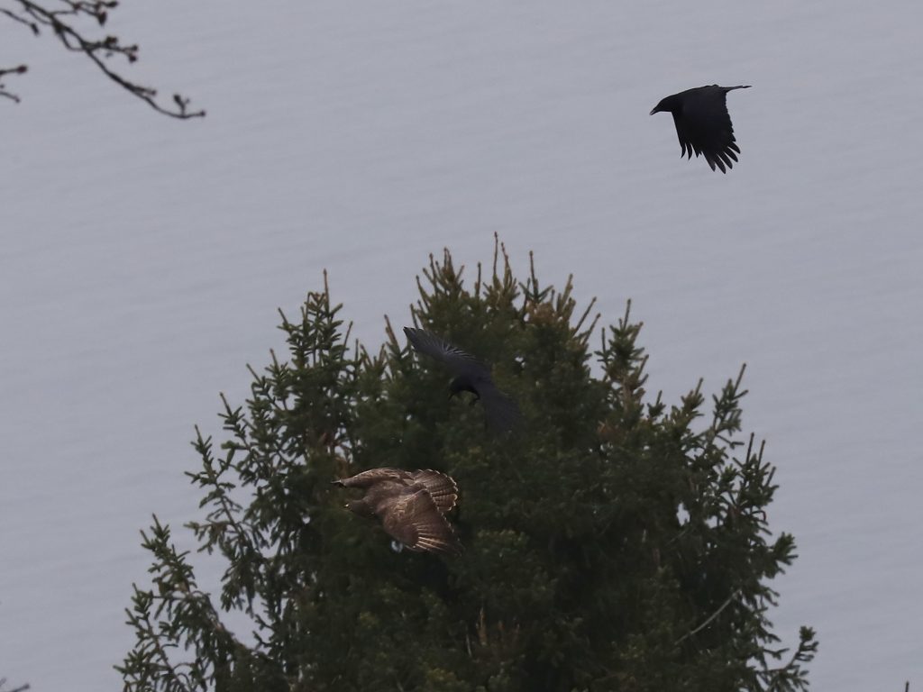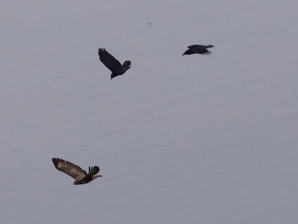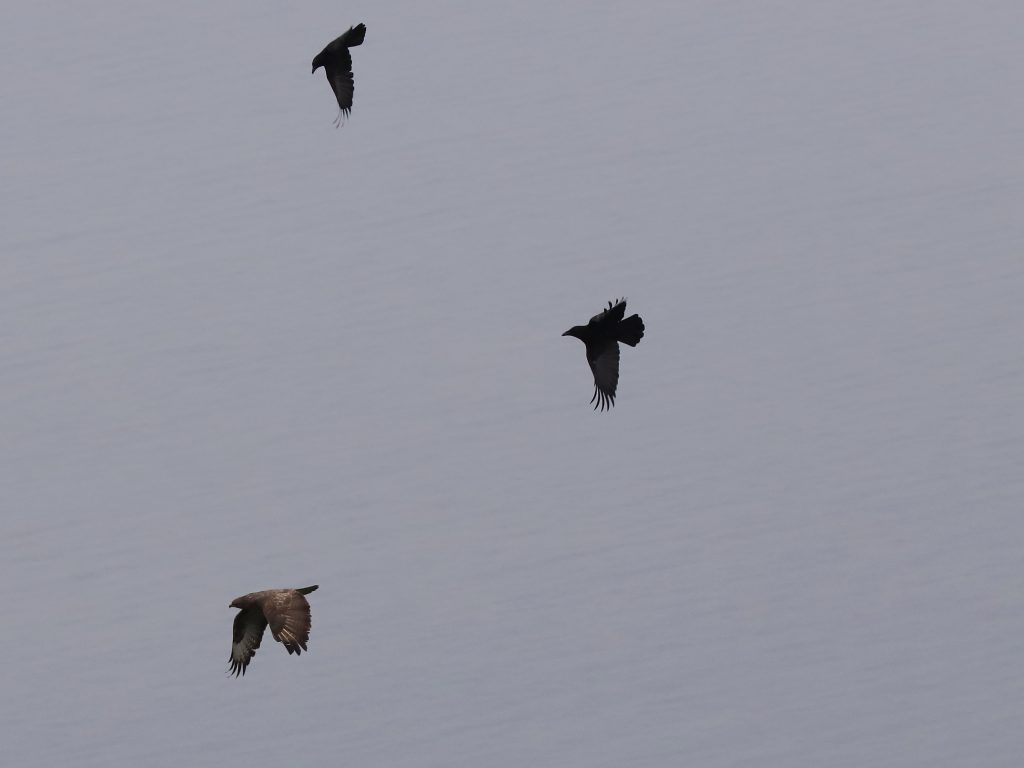 J’ai pu saisir au vol un Grand corbeau et une Buse variable, ce qui montre bien que ces deux oiseaux ont à peu près la même taille. Puis un Grand corbeau a bien voulu me survoler d’assez près pour un portrait dans de bonnes conditions.