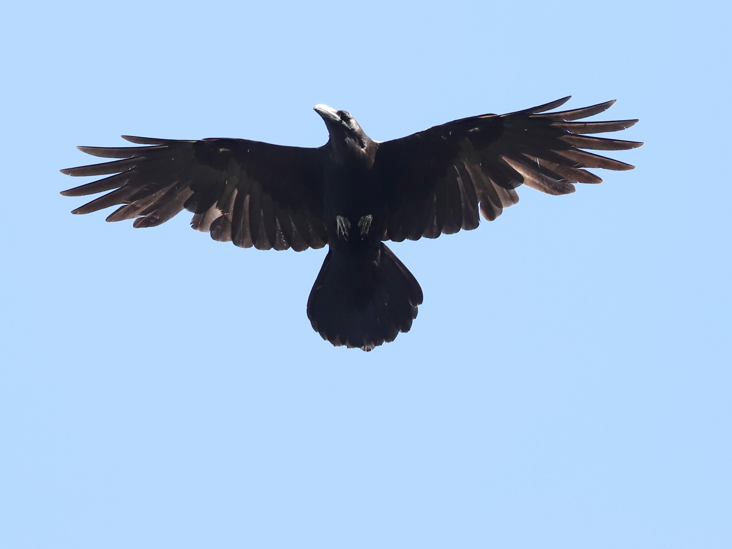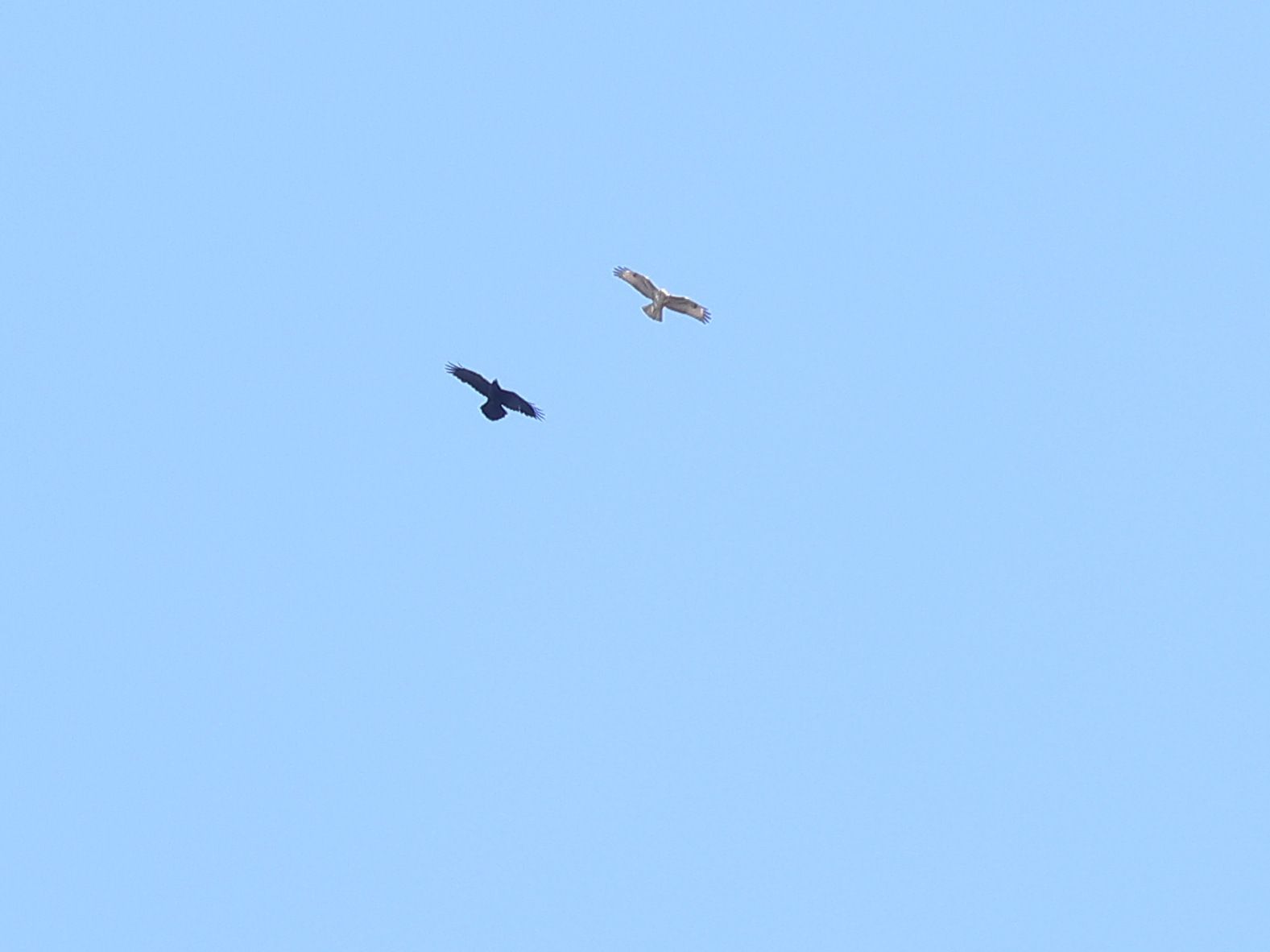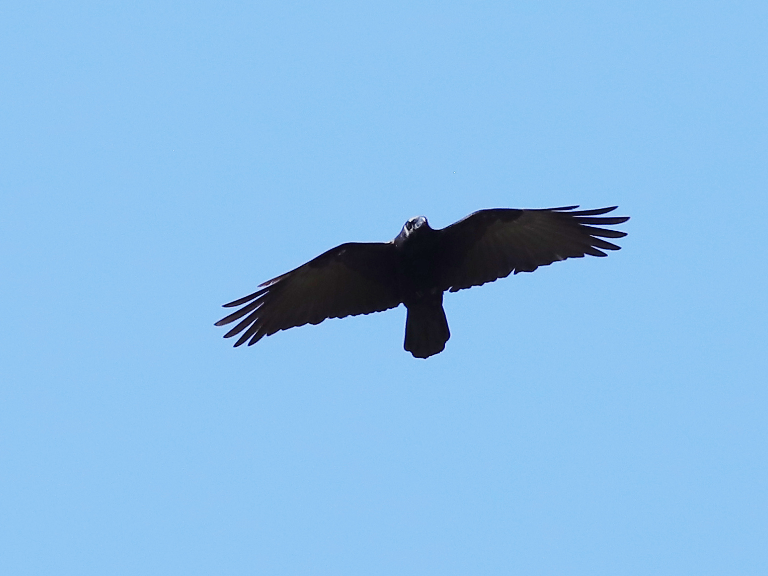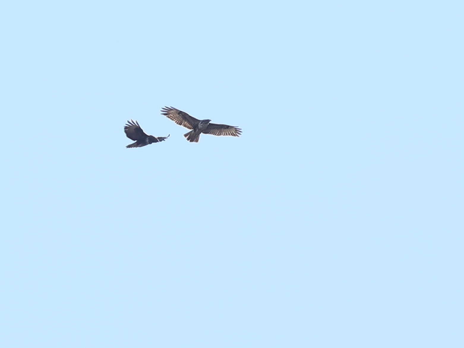 J’ai pu saisir au vol un Grand corbeau et une Buse variable, ce qui montre bien que ces deux oiseaux ont à peu près la même taille. Puis un Grand corbeau a bien voulu me survoler d’assez près pour un portrait dans de bonnes conditions.