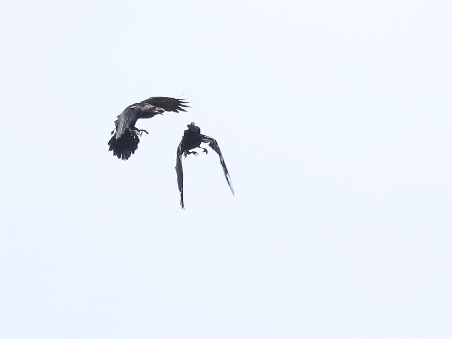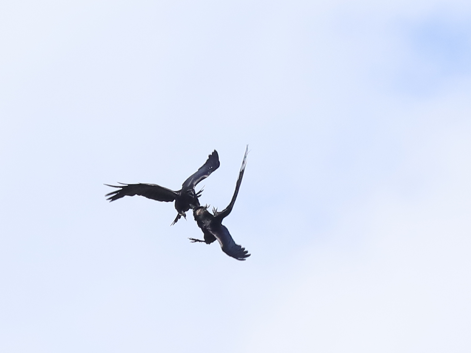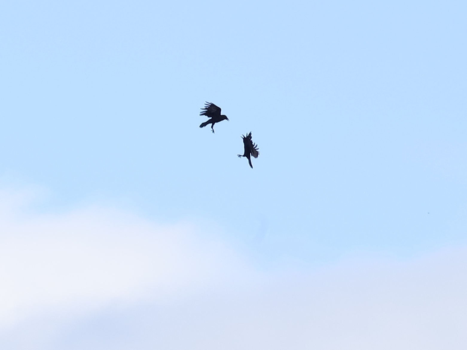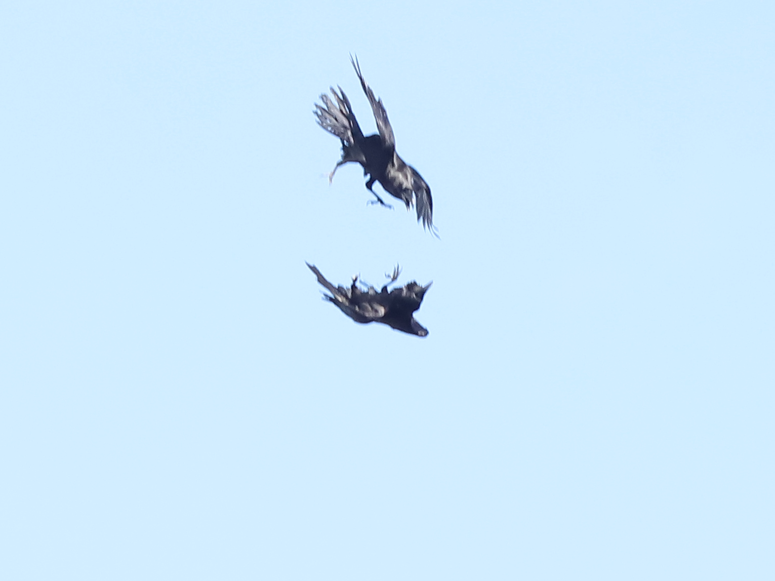 Les Grands corbeaux, dont je pensais les vols nuptiaux terminés, se sont livrés encore à de splendides exhibitions dignes de la Patrouille de France, panaches de fumée en moins.Vol synchronisé à deux, plongés et piqués et surtout des pirouettes menant deux oiseaux presque en face à face depuis très haut dans le ciel jusqu’à la limite des arbres.
