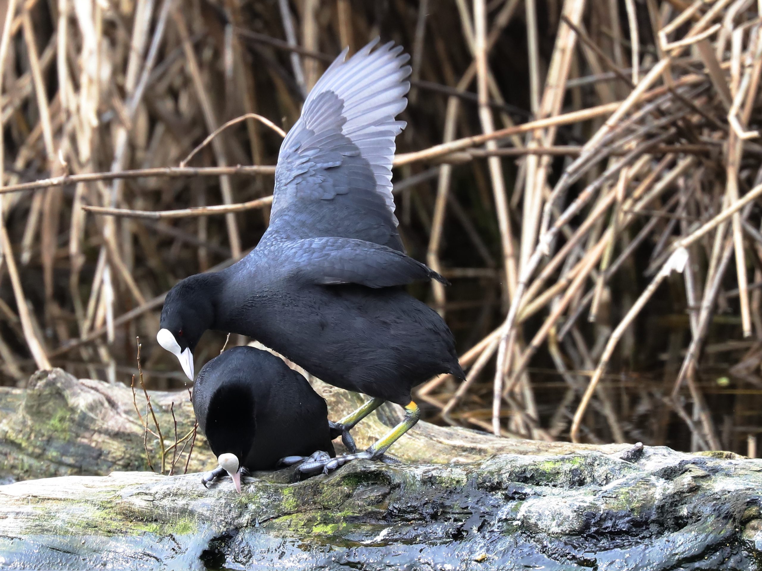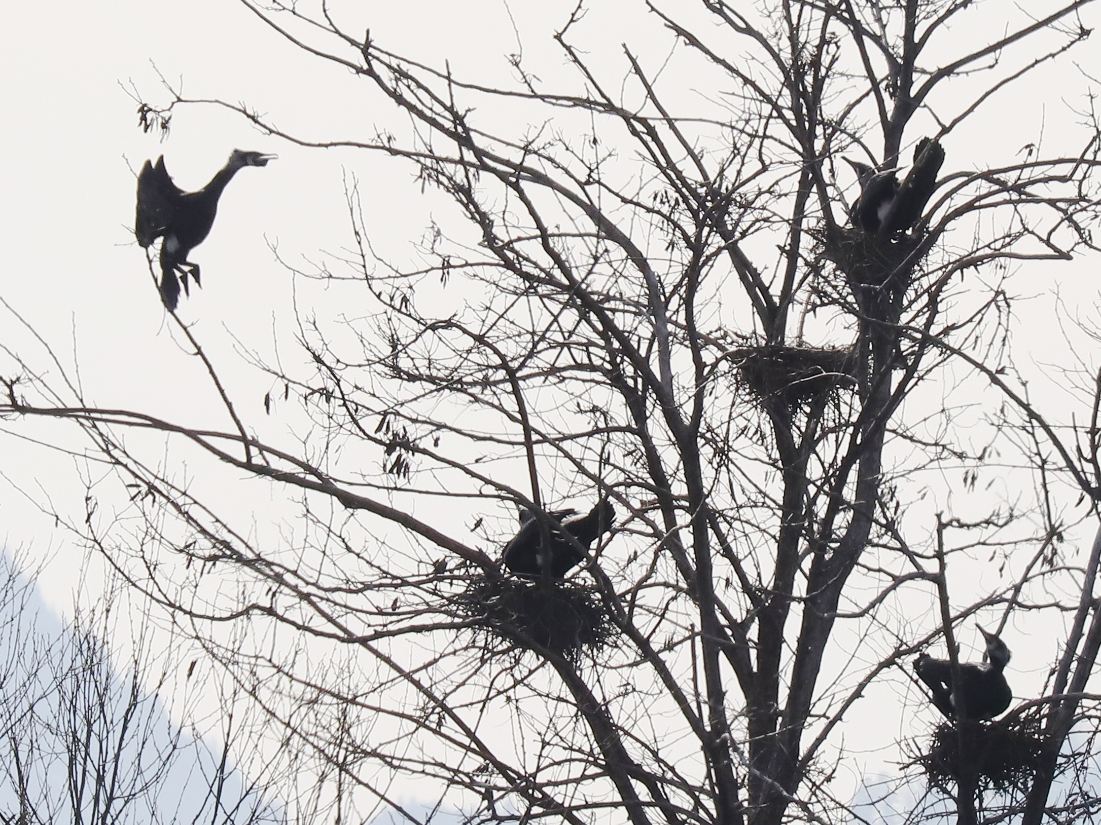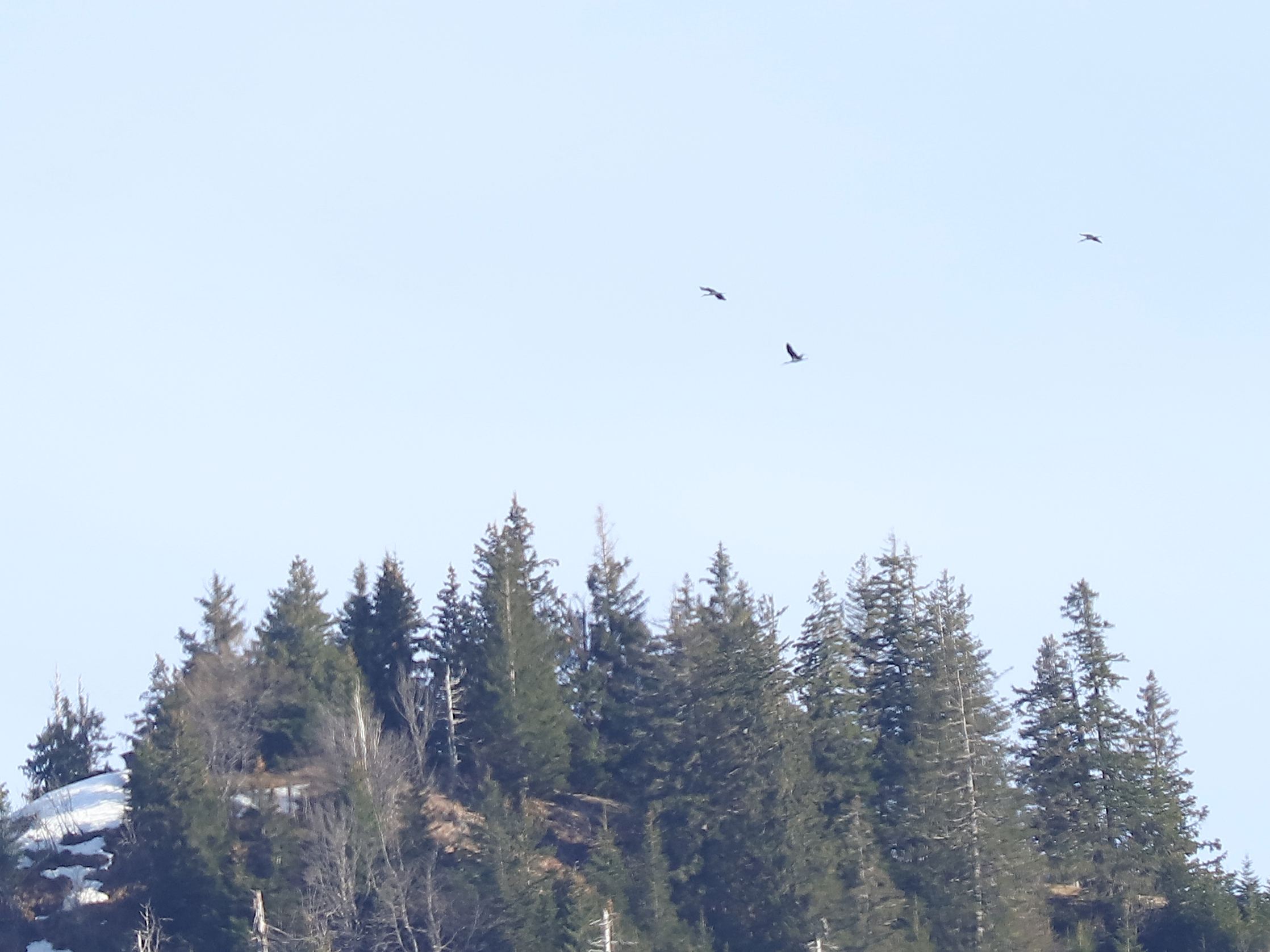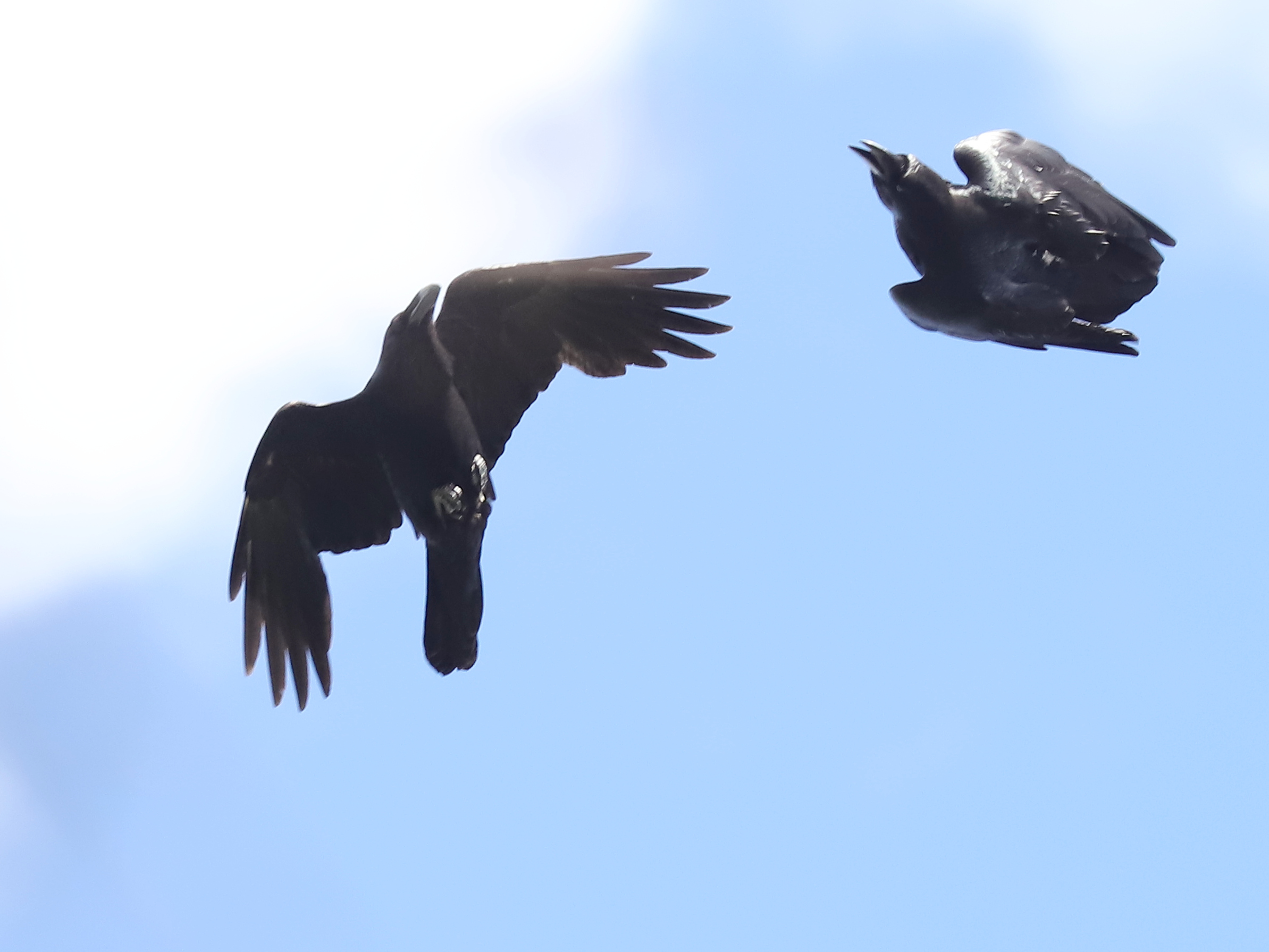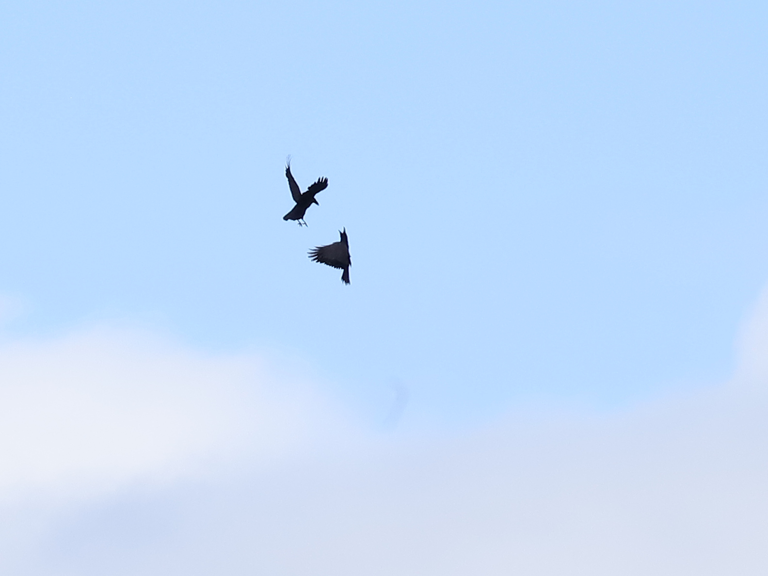 Les Grands corbeaux, dont je pensais les vols nuptiaux terminés, se sont livrés encore à de splendides exhibitions dignes de la Patrouille de France, panaches de fumée en moins.Vol synchronisé à deux, plongés et piqués et surtout des pirouettes menant deux oiseaux presque en face à face depuis très haut dans le ciel jusqu’à la limite des arbres.
