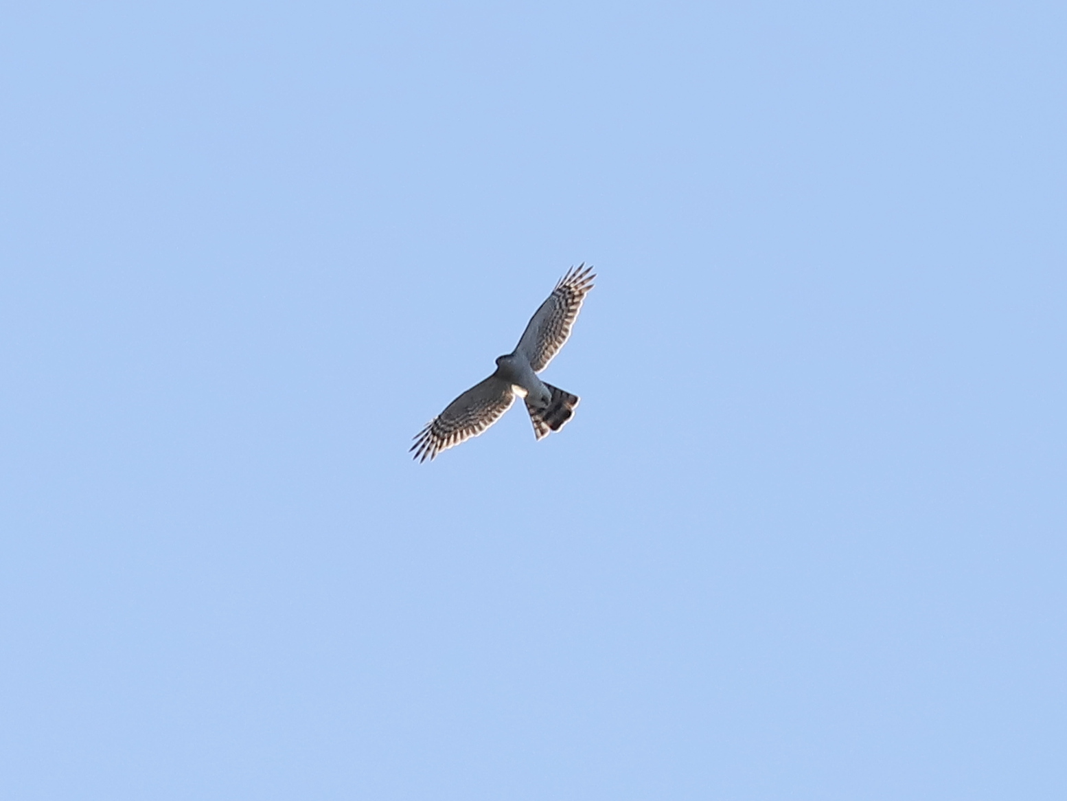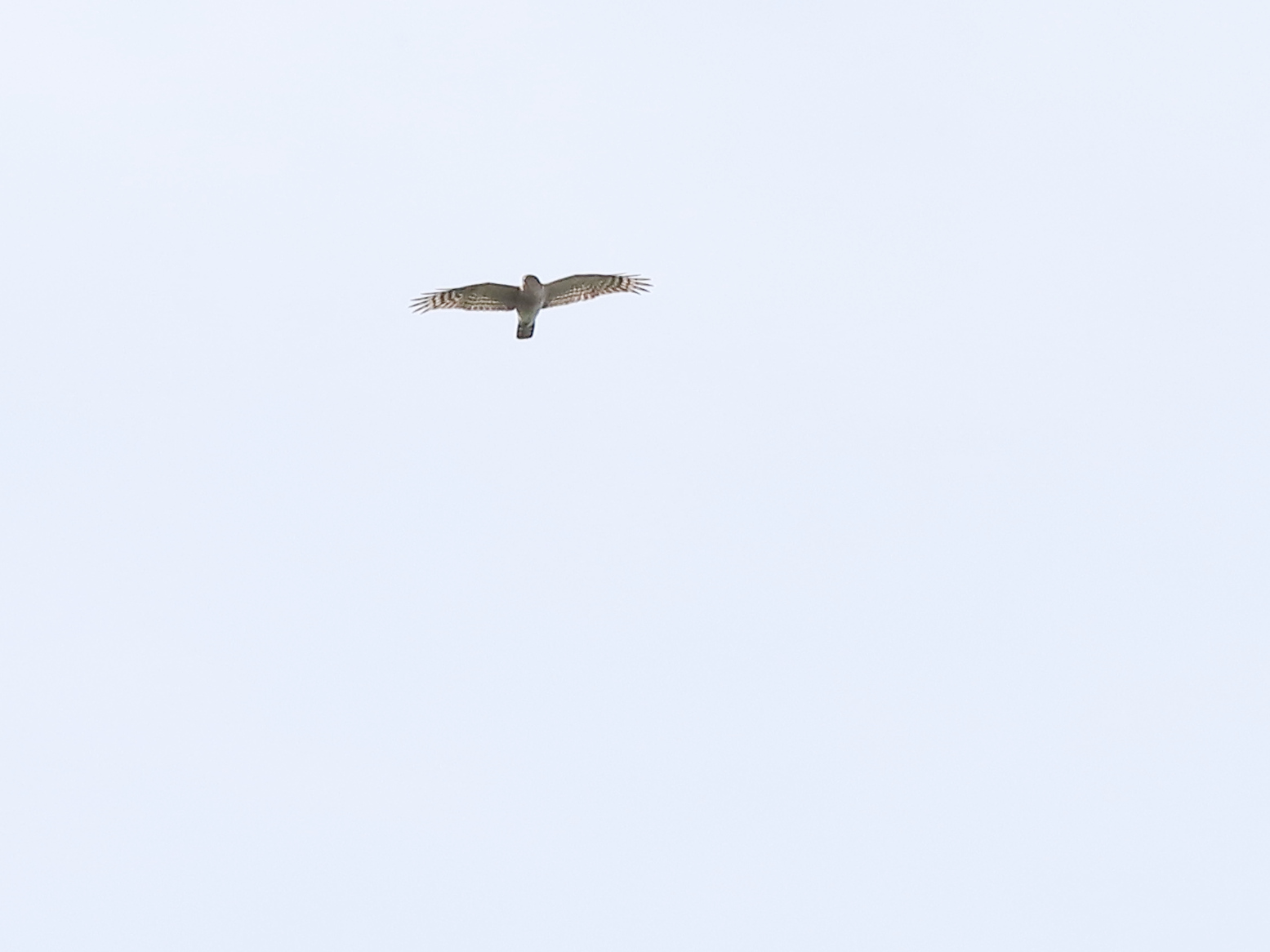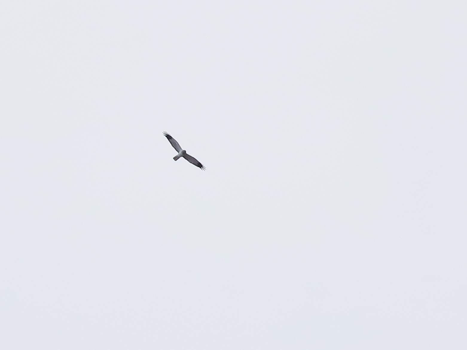 en premier, vu de très loin, un Busard Saint Martin, mâle, reconnaissable à l’extrémité noire des ailes et le bord de fuite des ailes noir également.