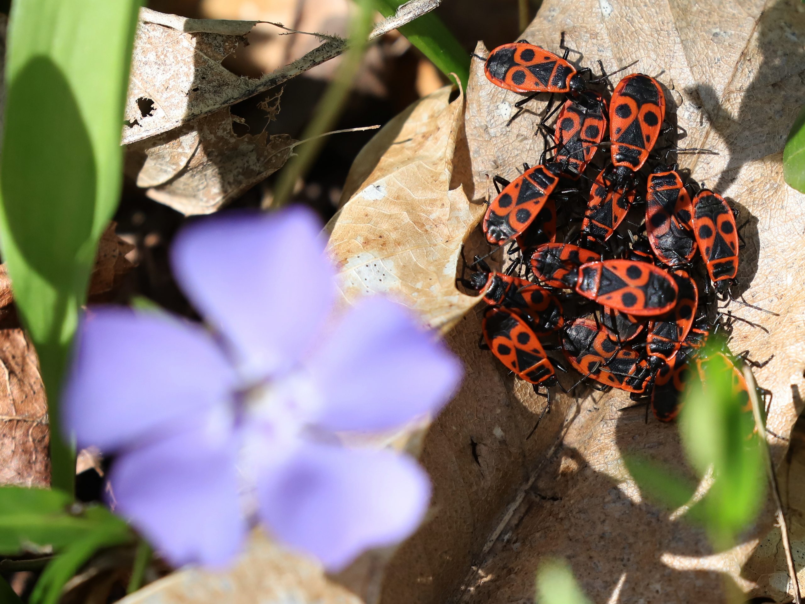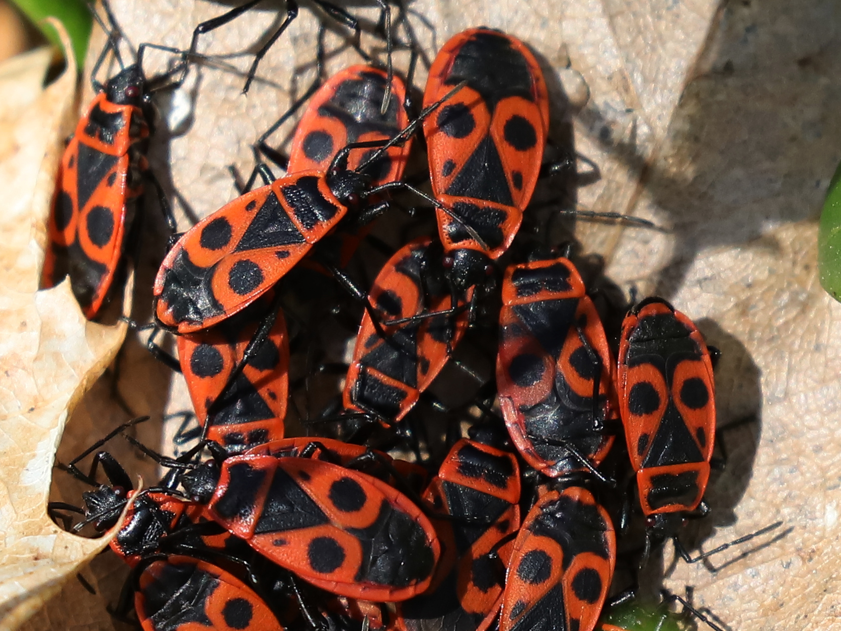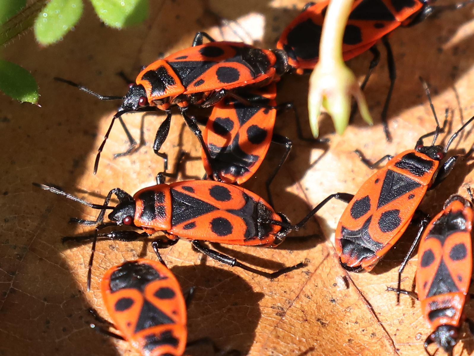 Parmi les punaises qui reprennent une intense activité, il y a les Gendarmes, aussi appelés Cherche-midi ou Suisse. L’excellent guide « Les Petites Bêtes » des éditions La Salamandre fait remarquer que les motifs de cette punaise vue la tête en bas rappellent un masque africain.