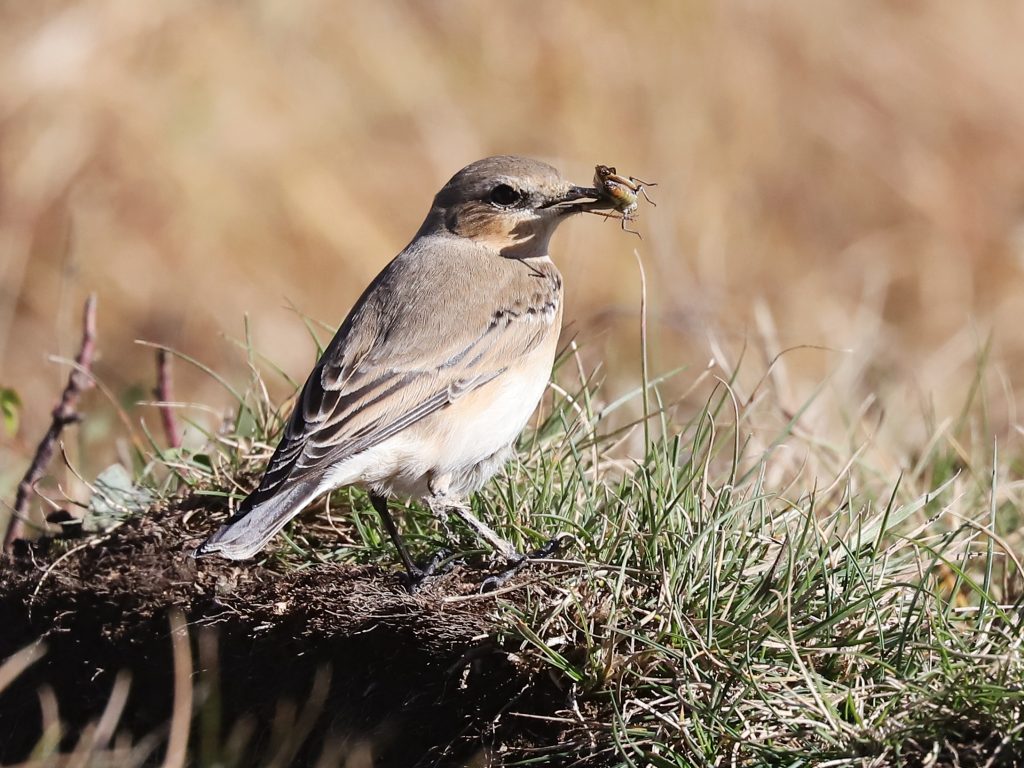 … dont profitent divers oiseaux comme le Traquet motteux. Une fois qu’il a capturé une sauterelle, il secoue vigoureusement la tête, ce qui semble arracher l’extrémité des pattes et probablement les ailes. Il n’y a plus qu’à avaler !
