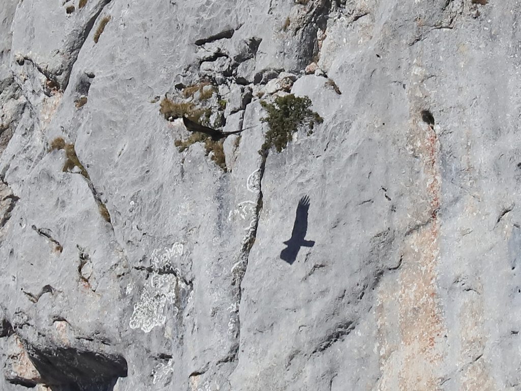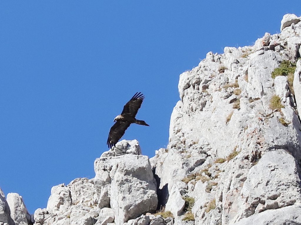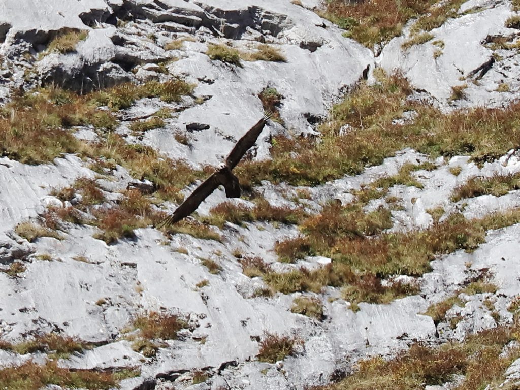 Un peu plus tard, c’est un Gypaète barbu qui est apparu à son tour. La couleur sombre des ailes et du corps indiquent que l’oiseau n’est pas adulte, stade atteint en sixième année. Entre la couleur du corps, celle de la tête et l’état des rémiges, je crois que c’est un oiseau de 3è année. En troisième photo, il y a peut-être un serpent dans les serres – proie inhabituelle pour un gypaète – mais la distance ne permet pas d’en être certain.