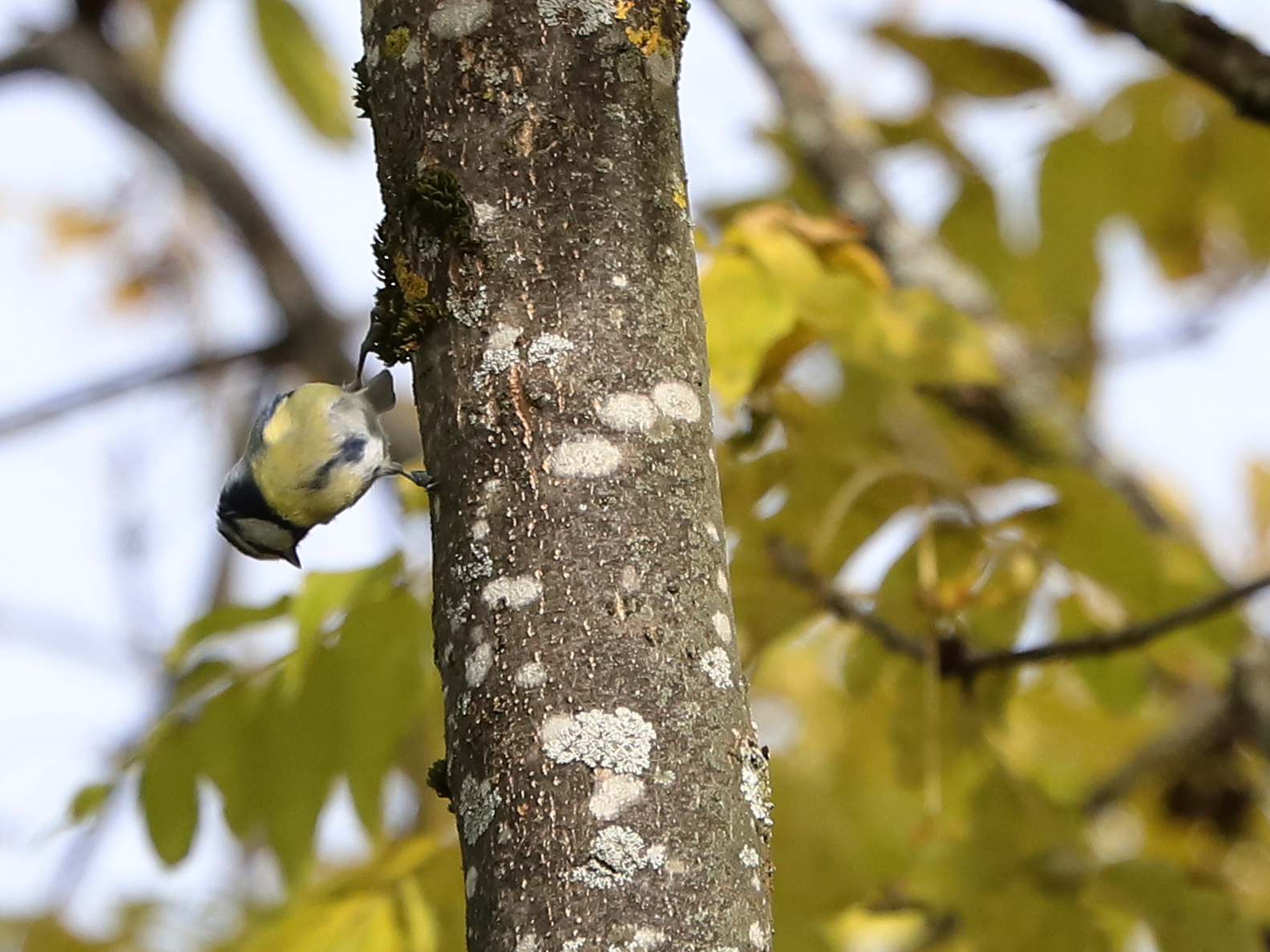 Les Mésanges bleues sont de véritables acrobates quand il s’agit de prospecter les arbres pour trouver des insectes.