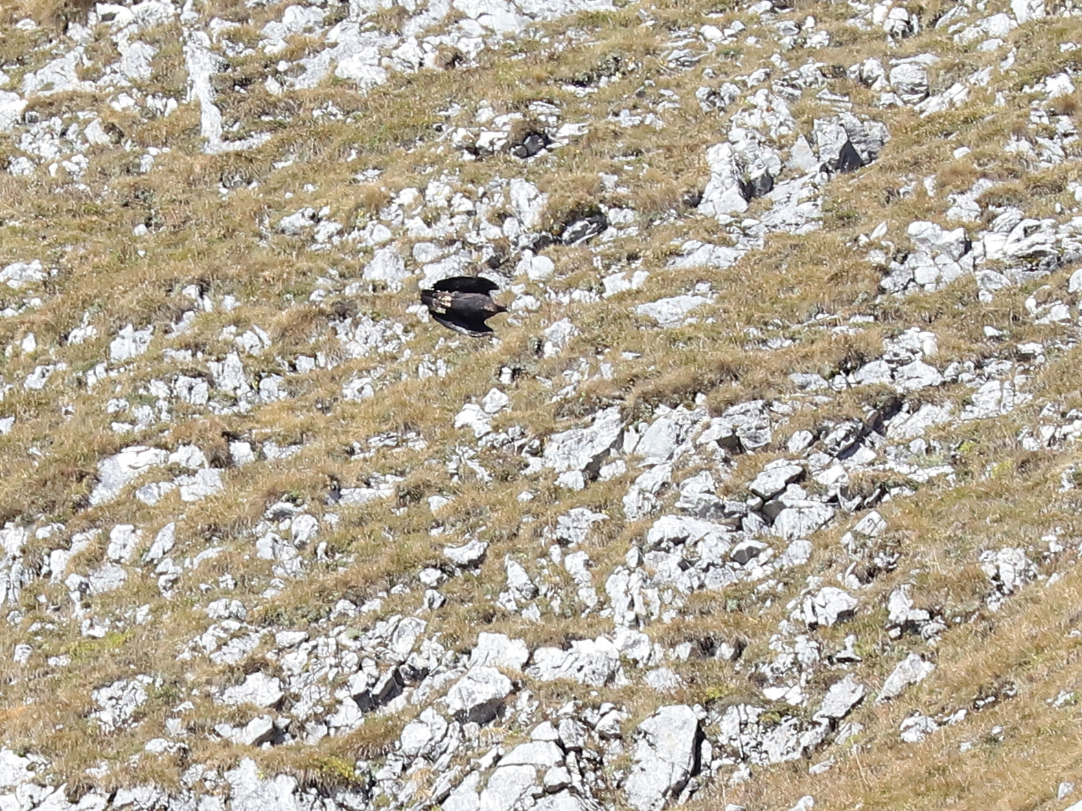 Un peu plus tard, c’est un Gypaète barbu qui est apparu à son tour. La couleur sombre des ailes et du corps indiquent que l’oiseau n’est pas adulte, stade atteint en sixième année. Entre la couleur du corps, celle de la tête et l’état des rémiges, je crois que c’est un oiseau de 3è année. En troisième photo, il y a peut-être un serpent dans les serres – proie inhabituelle pour un gypaète – mais la distance ne permet pas d’en être certain.