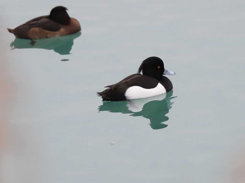 Un Fuligule morillon mâle, la femelle est en arrière et sieste tranquillement.