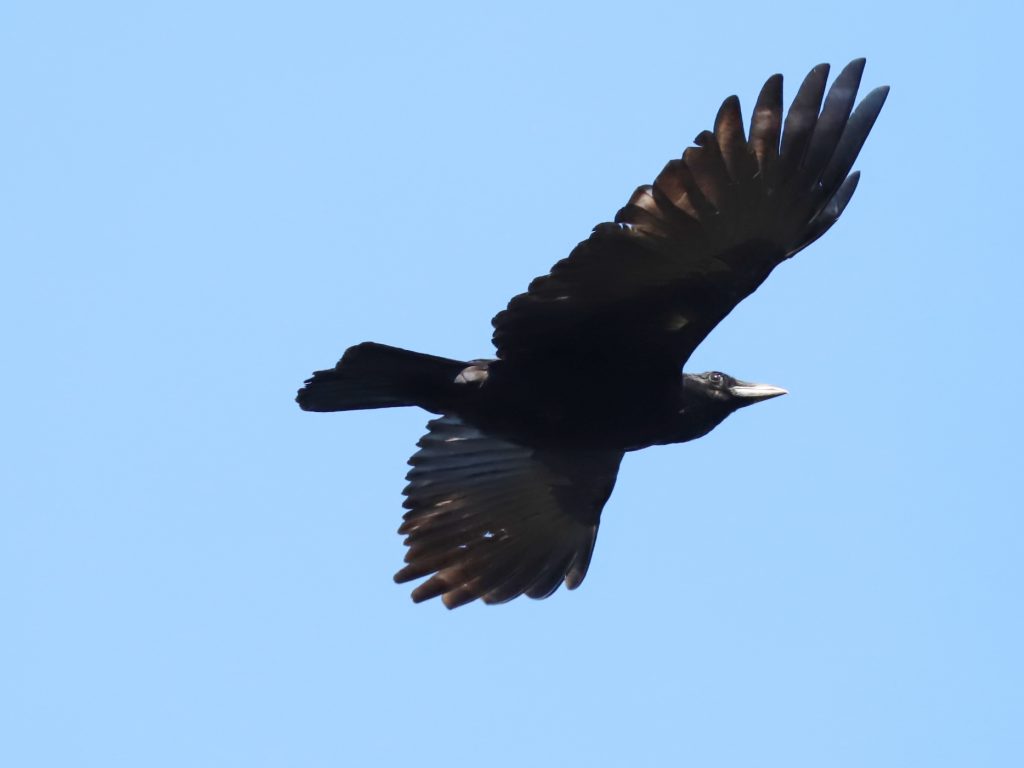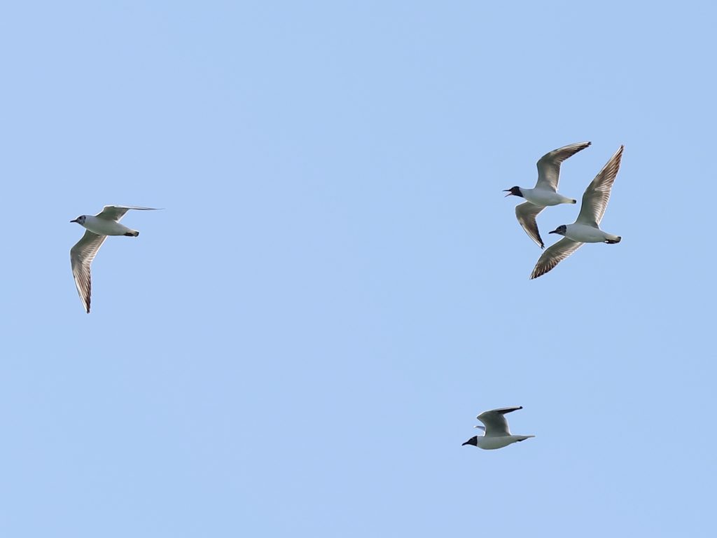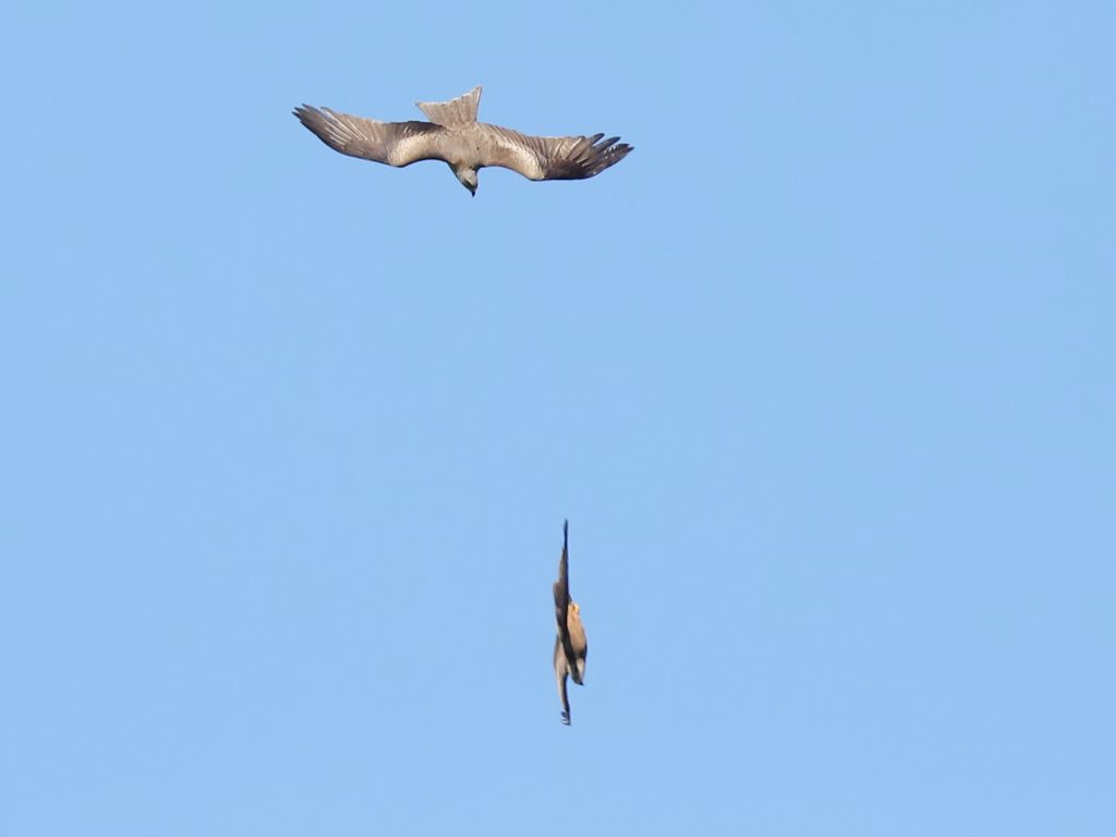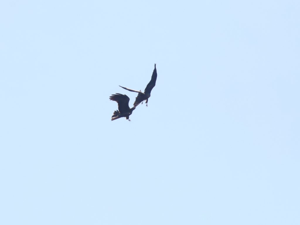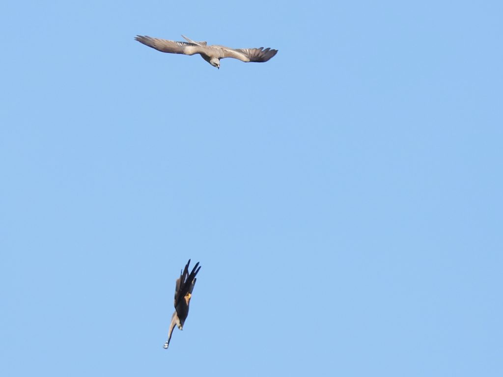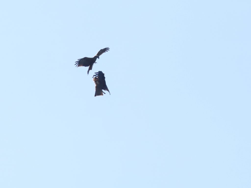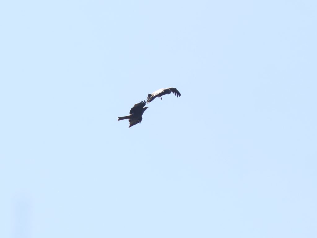 Pour terminer, voici la curiosité de la semaine. Trois corvidés sont passés, en cerclant dans un thermique. Vue la distance je n’en suis pas certain, mais le bec clair m’oriente vers le Corbeau freux Corvus frugilegus, que je n’avais encore jamais vu à Lugrin. Soudain, un autre oiseau s’est joint à la spirale, un Faucon crécerelle Falco tinnunculus. Encore plus soudainement, tout le monde a disparu.