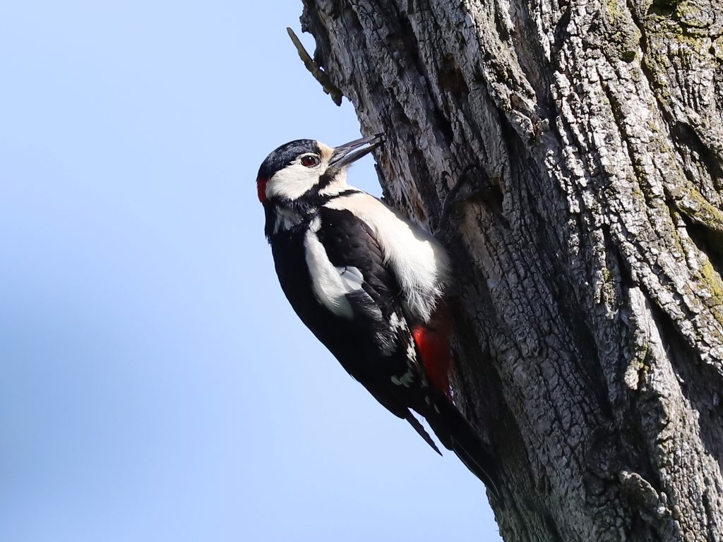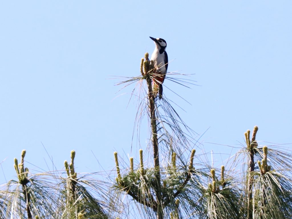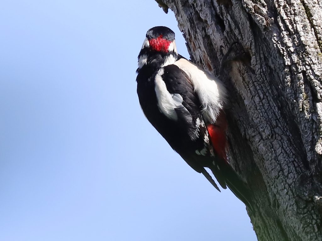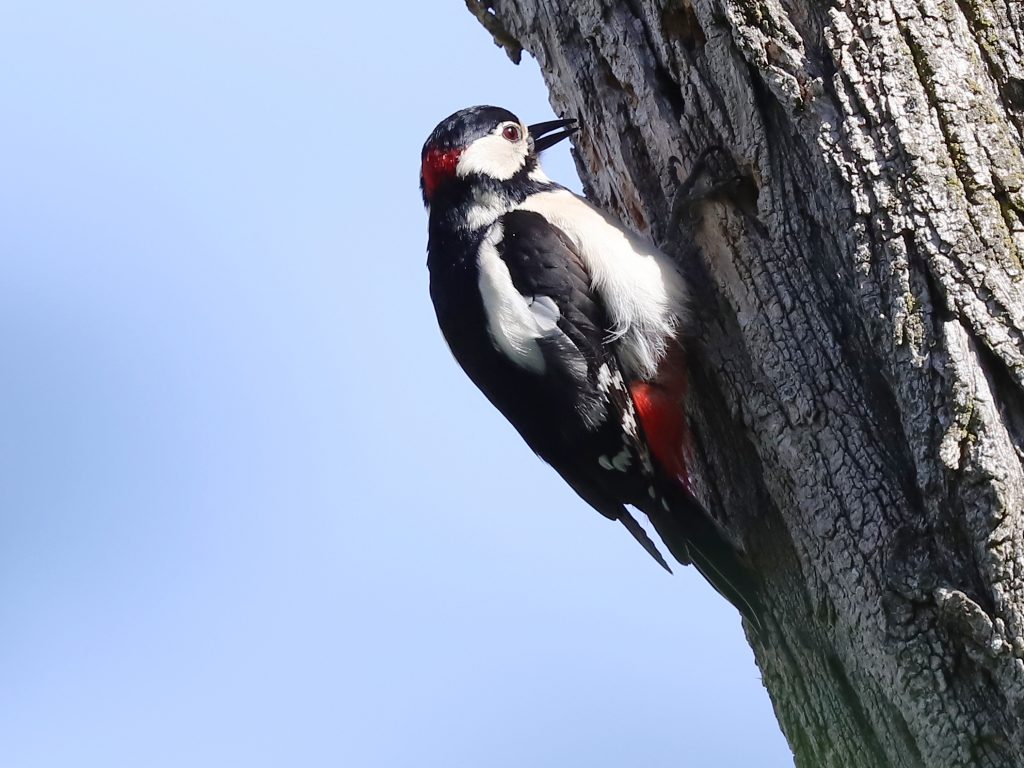 Le Pic épeiche Dendrocopos major, femelle à la nuque noire, parcourt les branches malade à la recherche de larves.
