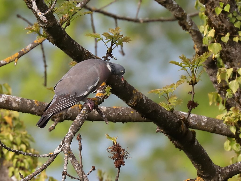 Le Pigeon ramier Columba palumbus, aussi granivore, se cantonne à son habitat de toujours, les bois.