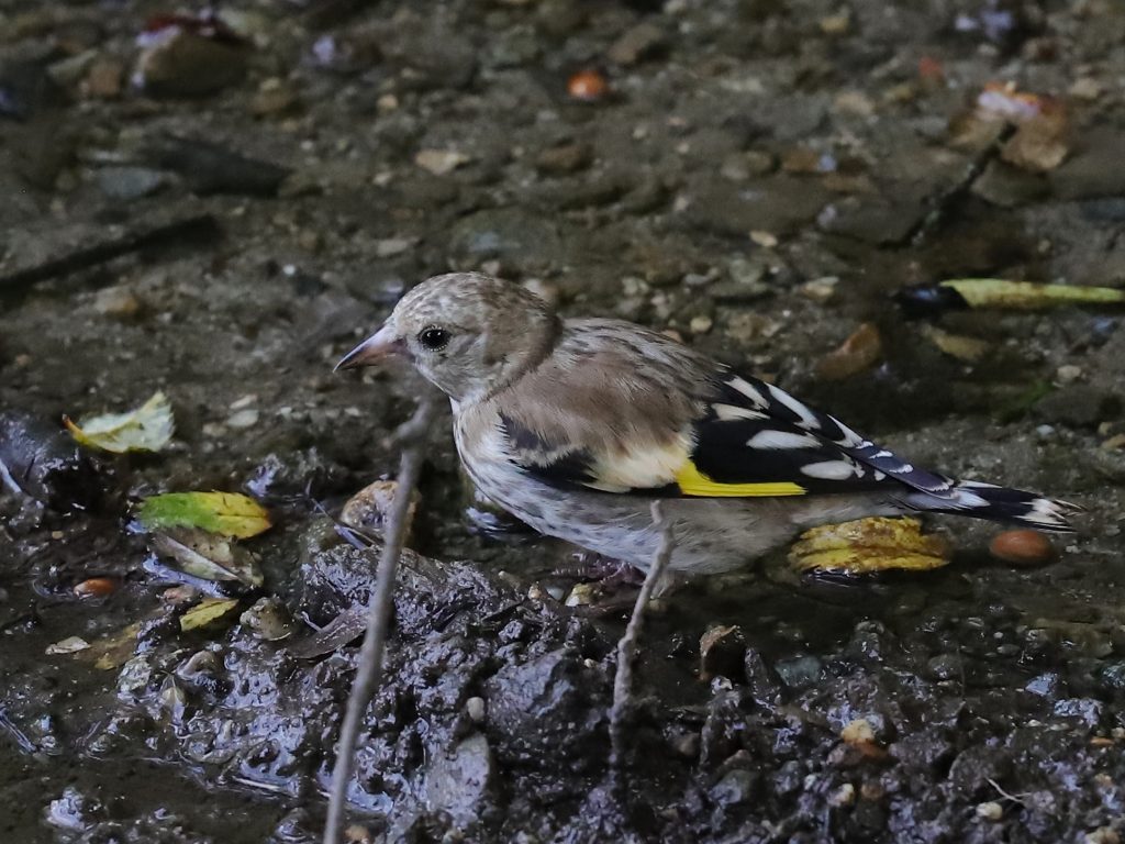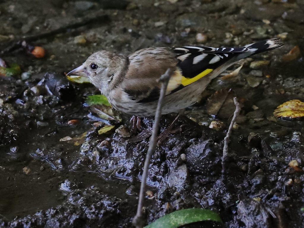 … une femelle de Fauvette à tête noire Sylvia atricapilla, qui semble montrer comment faire à un jeune Chardonneret élégant Carduelis carduelis qui se jette à l’eau avec enthousiasme …