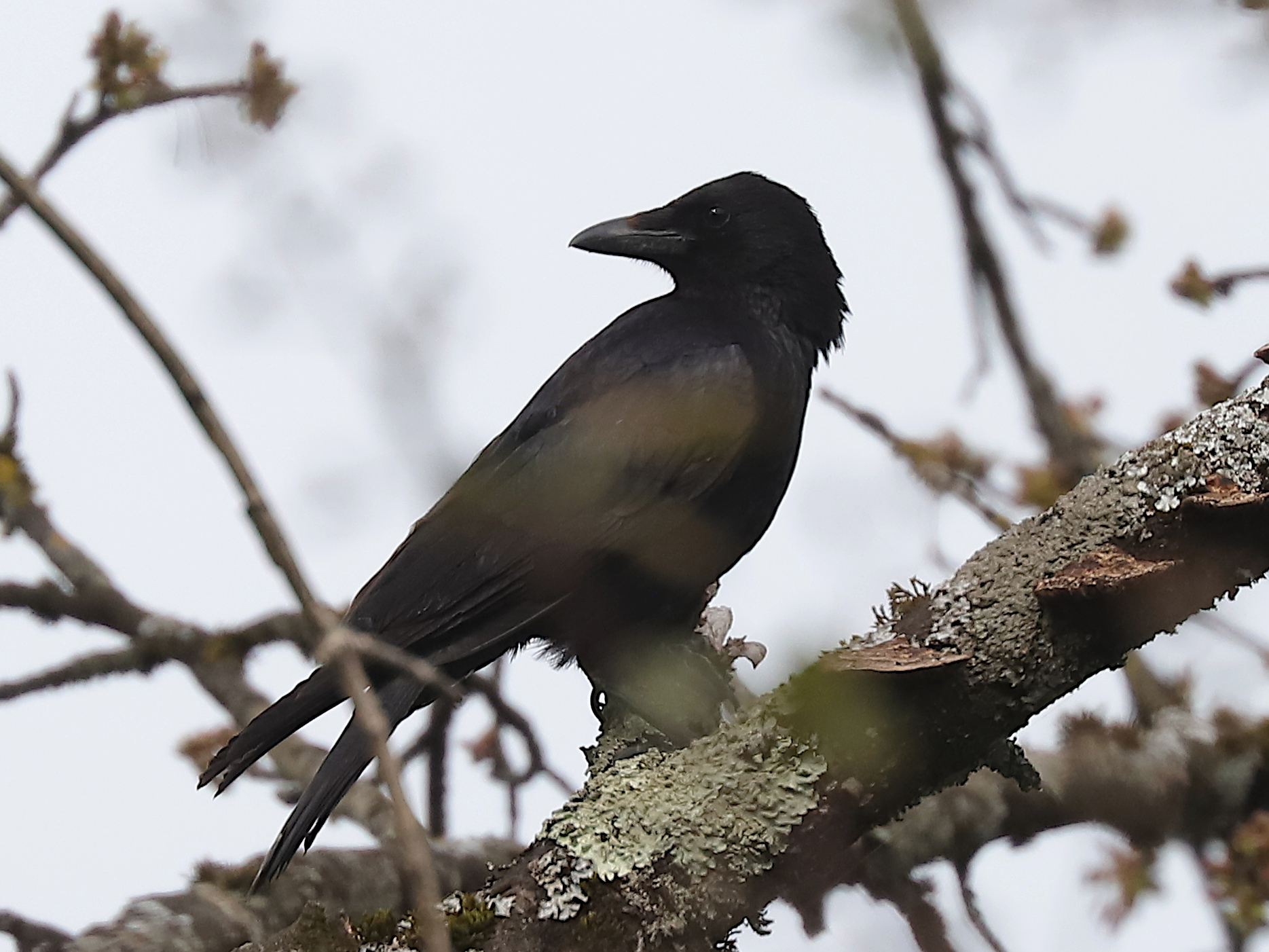 Avec un bec fort mais moins massif, ce sont les Corneilles noires Corvus corone, printanière sur un cerisier ou lacustre qui mange des algues sur les galets.