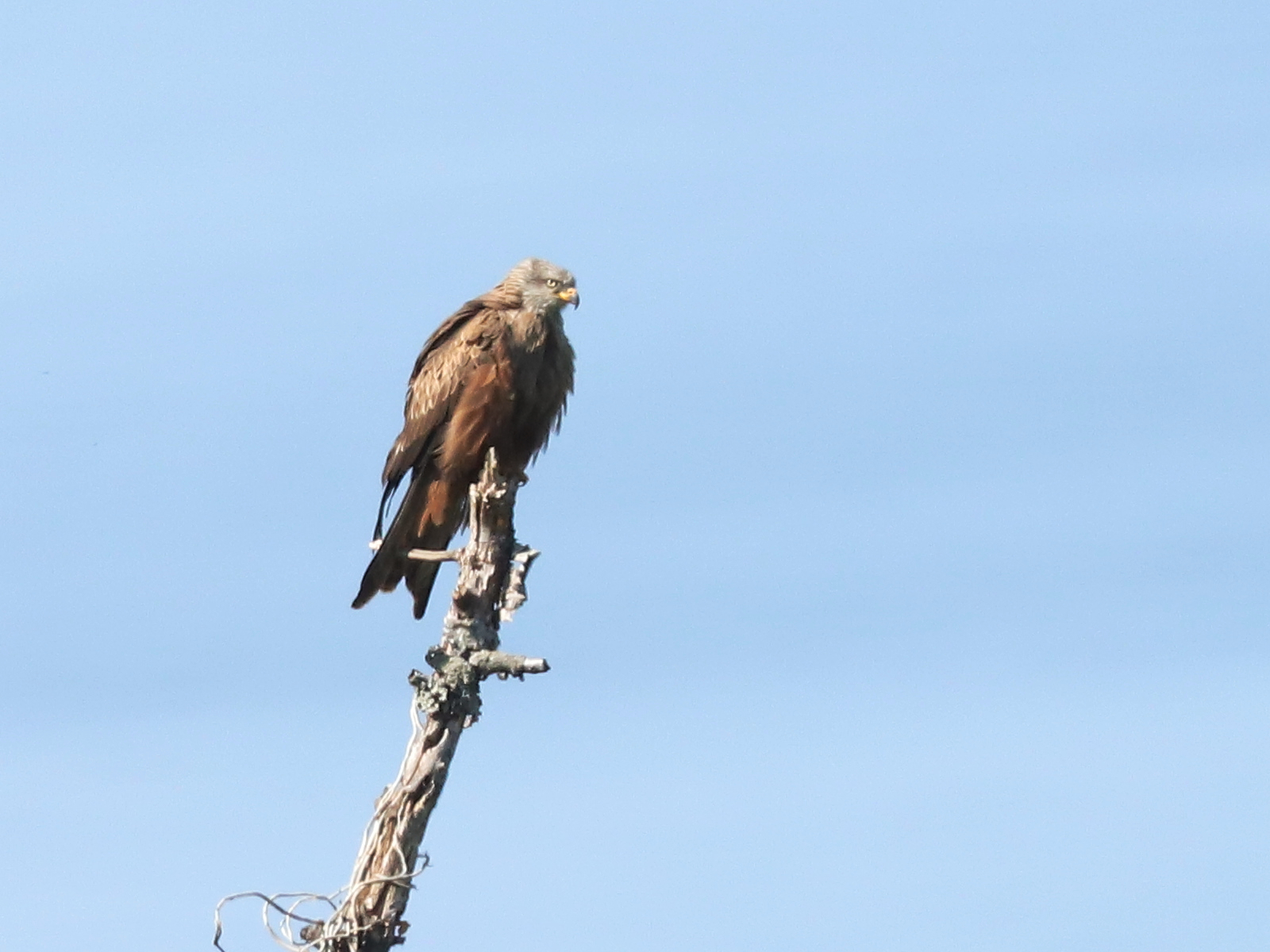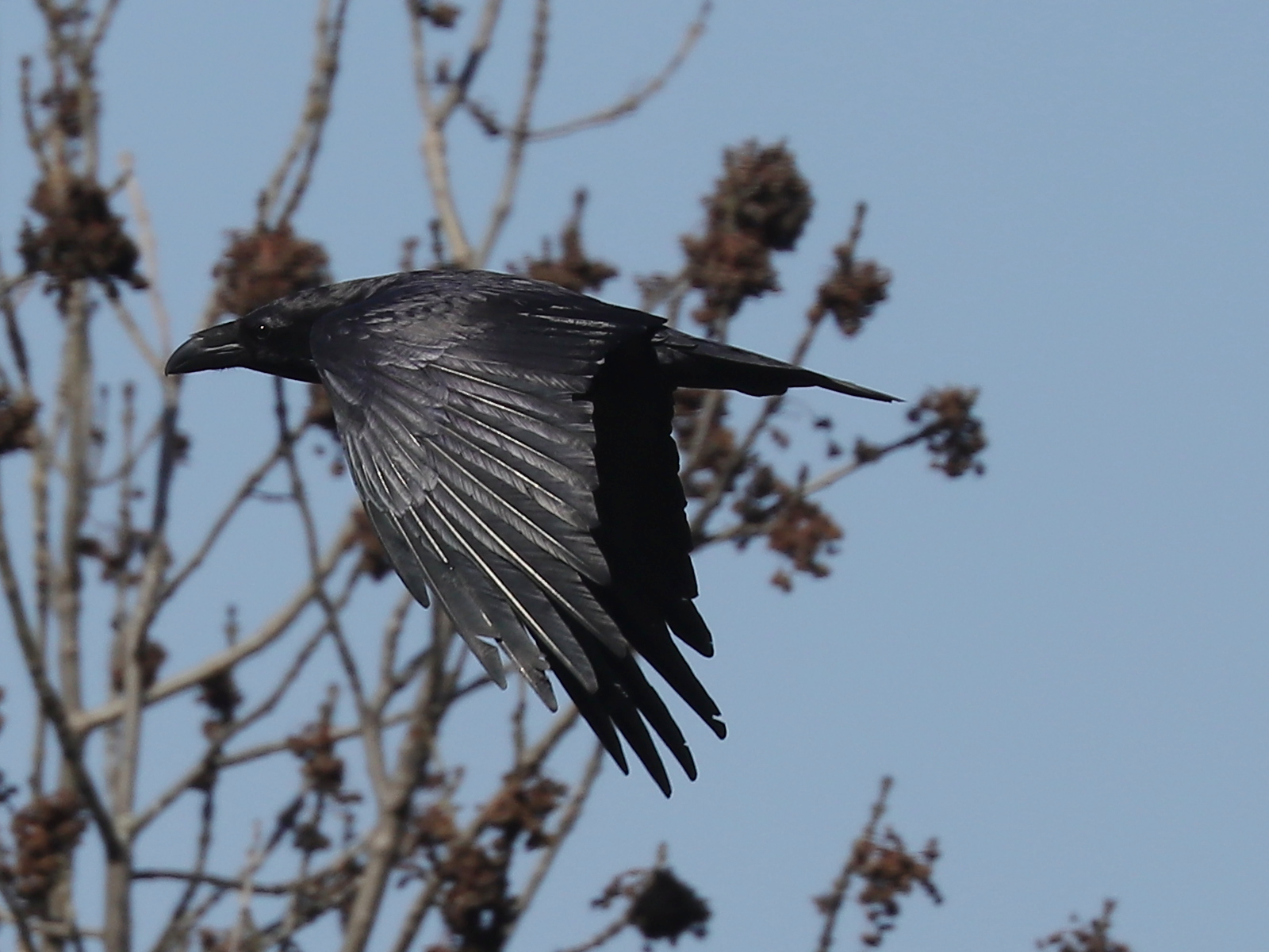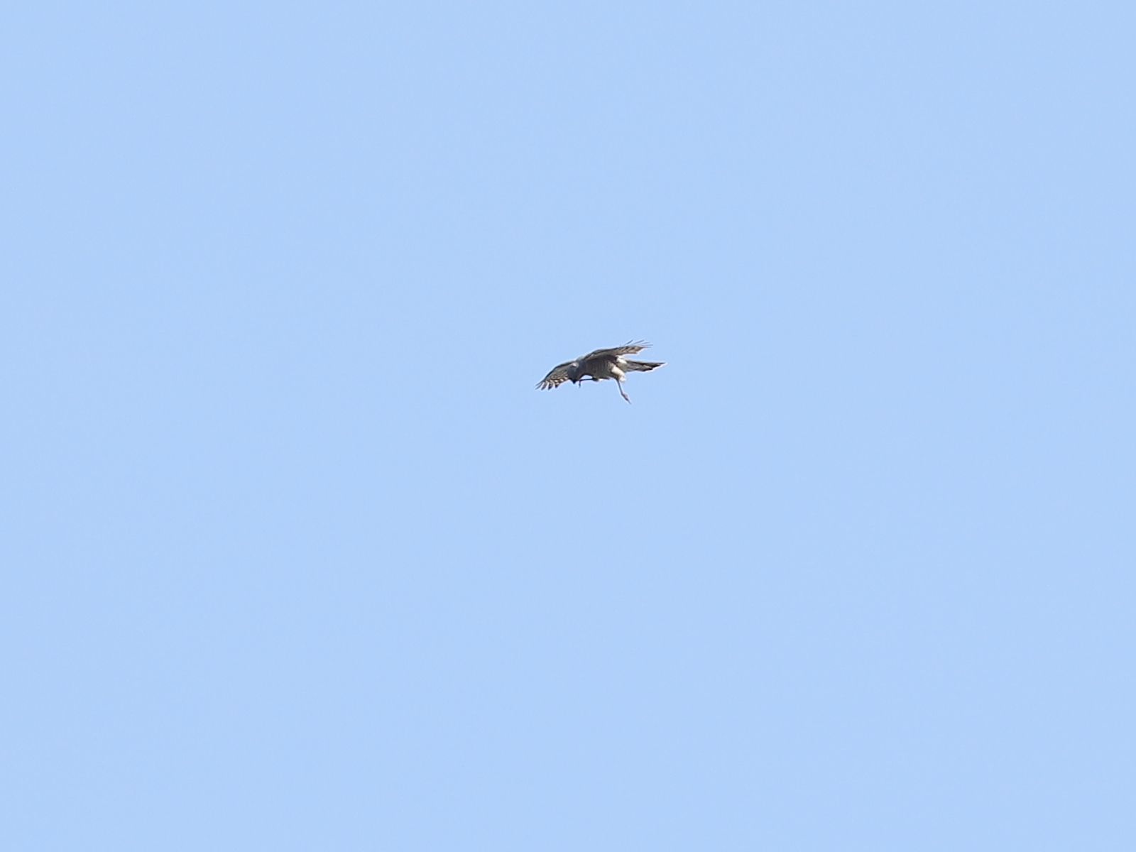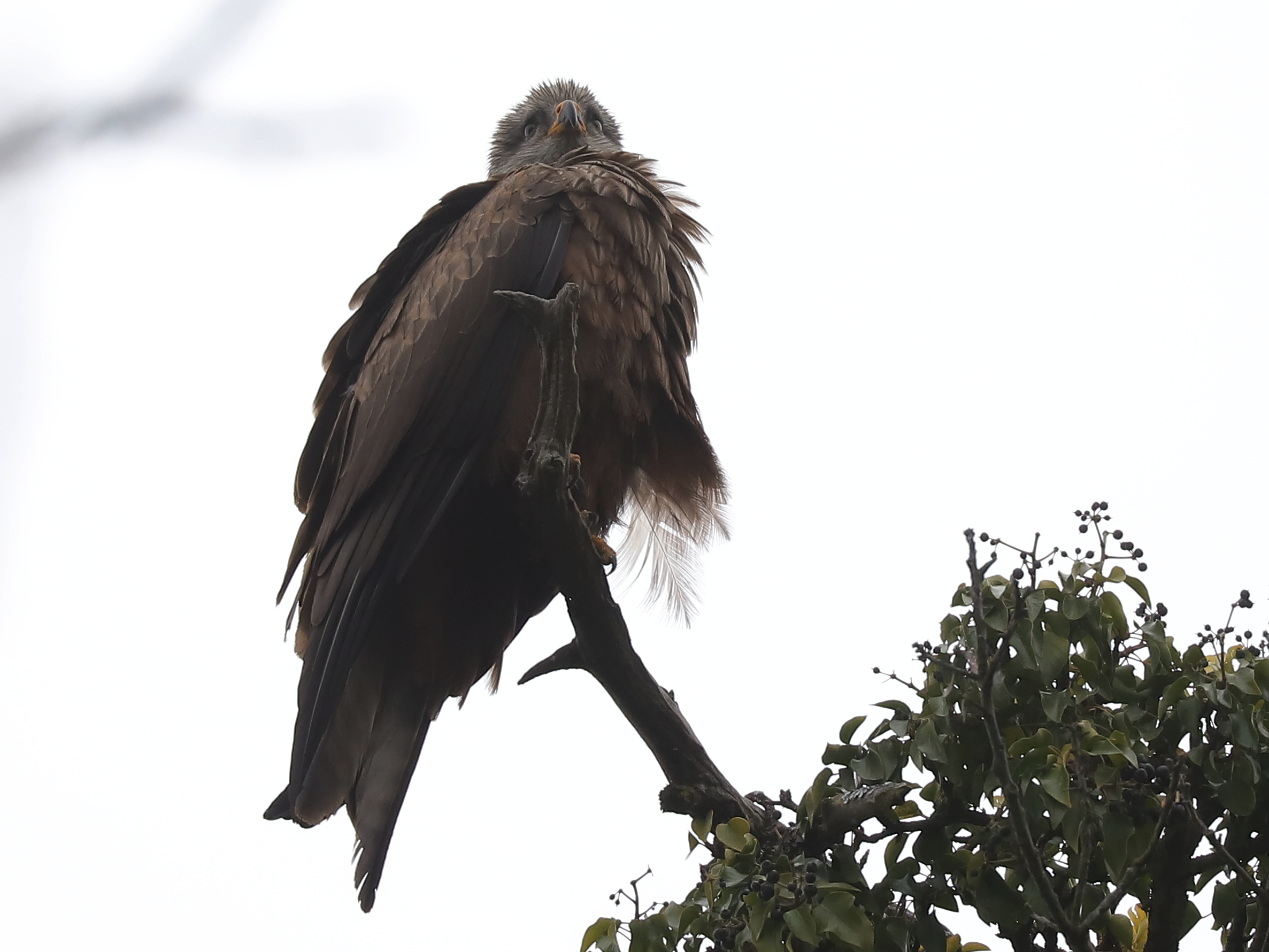 J’ai été surpris de trouver un Grand corbeau Corvus corax en train de picorer des baies de lierre. Le bec et la silhouette avec la queue en losange sont caractéristiques, même si ces détails sont difficiles à voir lorsqu’il cercle avec un Milan noir au premier plan.