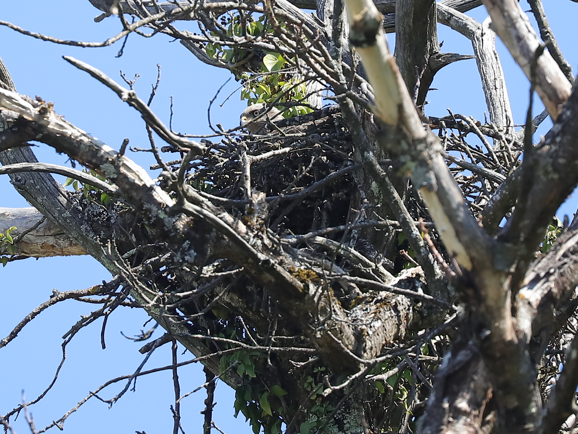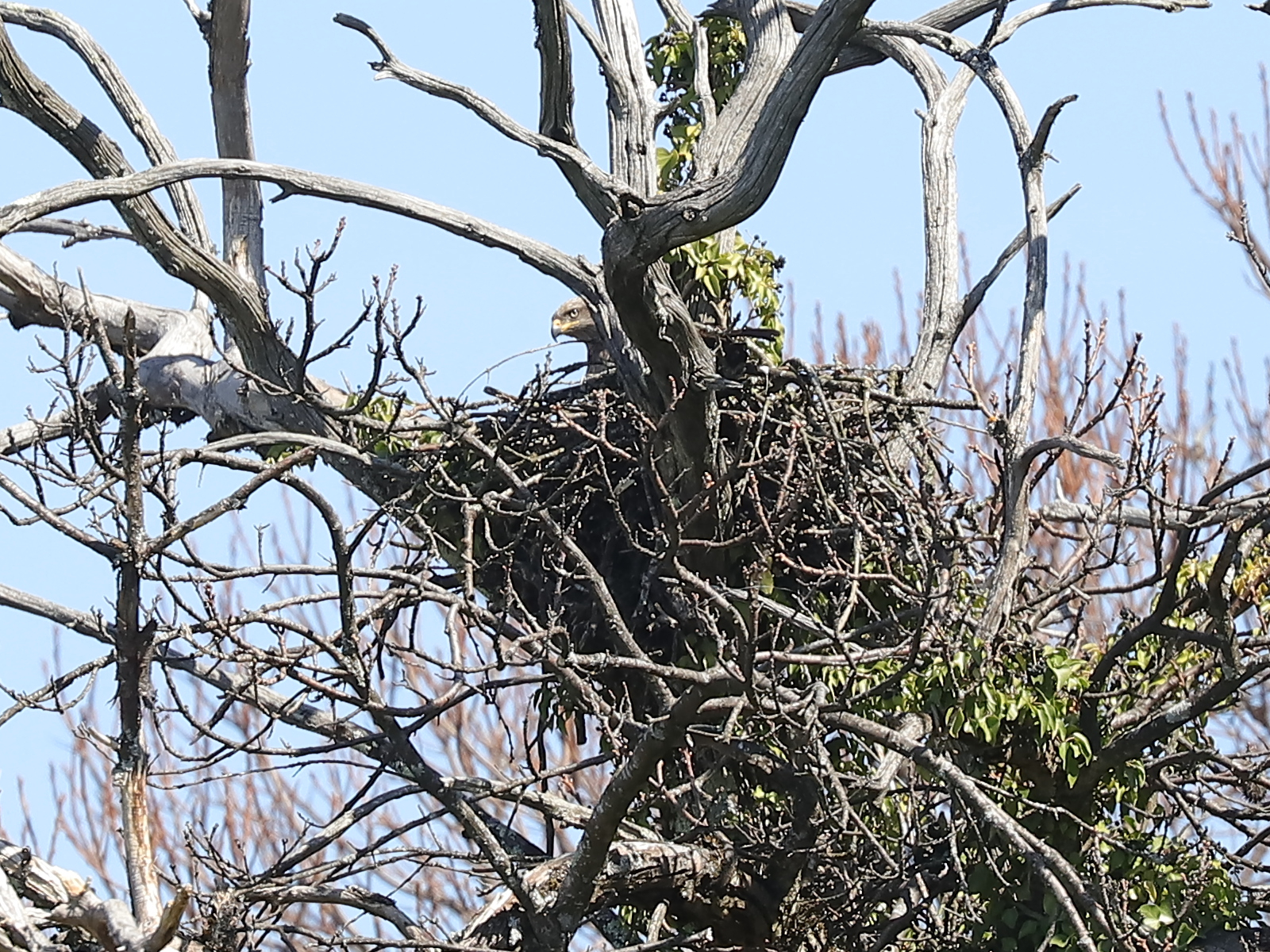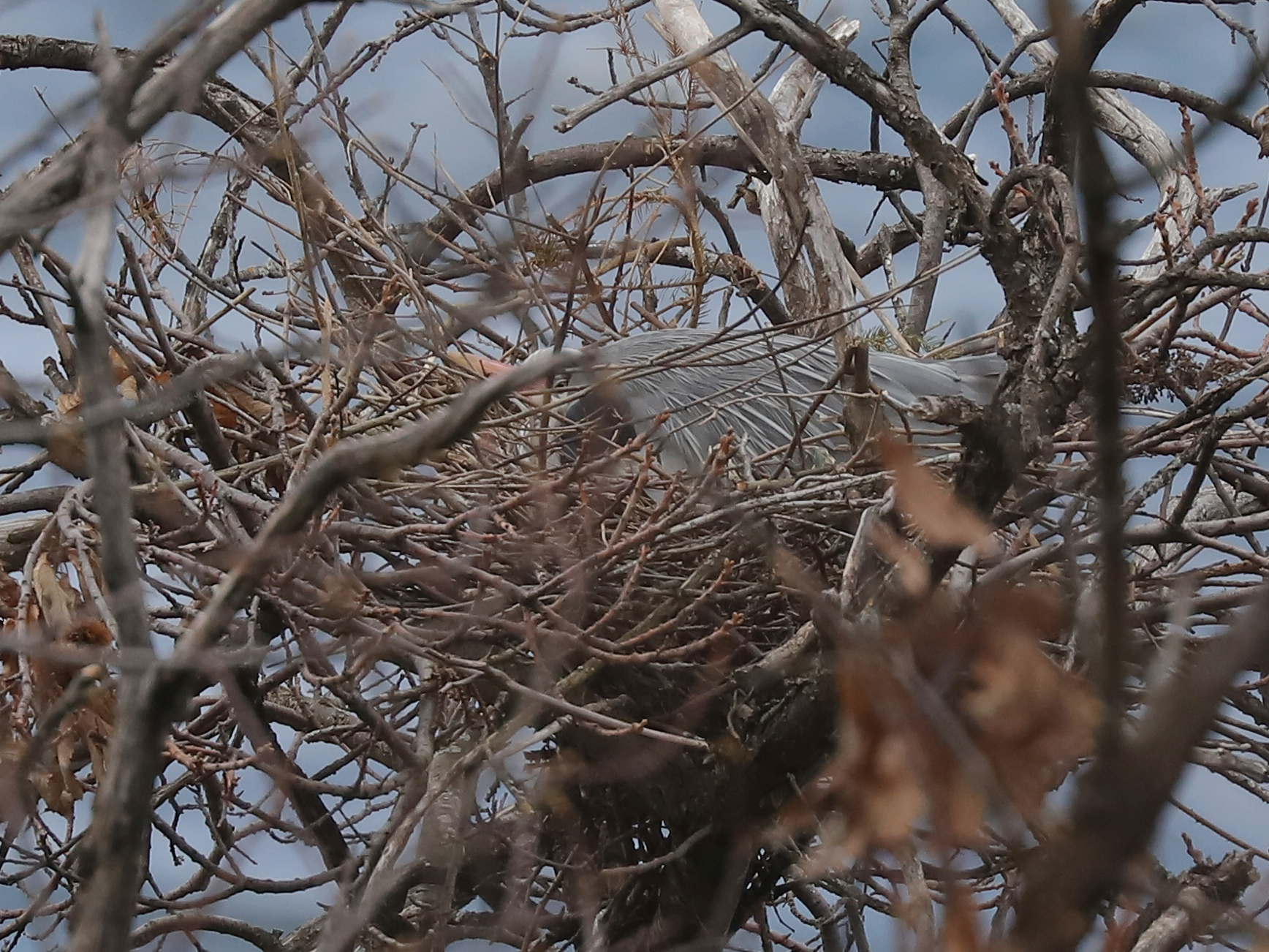 La semaine dernière, j’avais émis des doutes sur les chances que pouvait avoir un nid en plein dans l’axe de la bise. Il y a eu des journées de vent soutenu voire tempétueux mais il y a encore un Héron cendré Ardea cinerea qui couve. il sera invisible dans quelques jour, dès que les feuilles seront ouvertes.