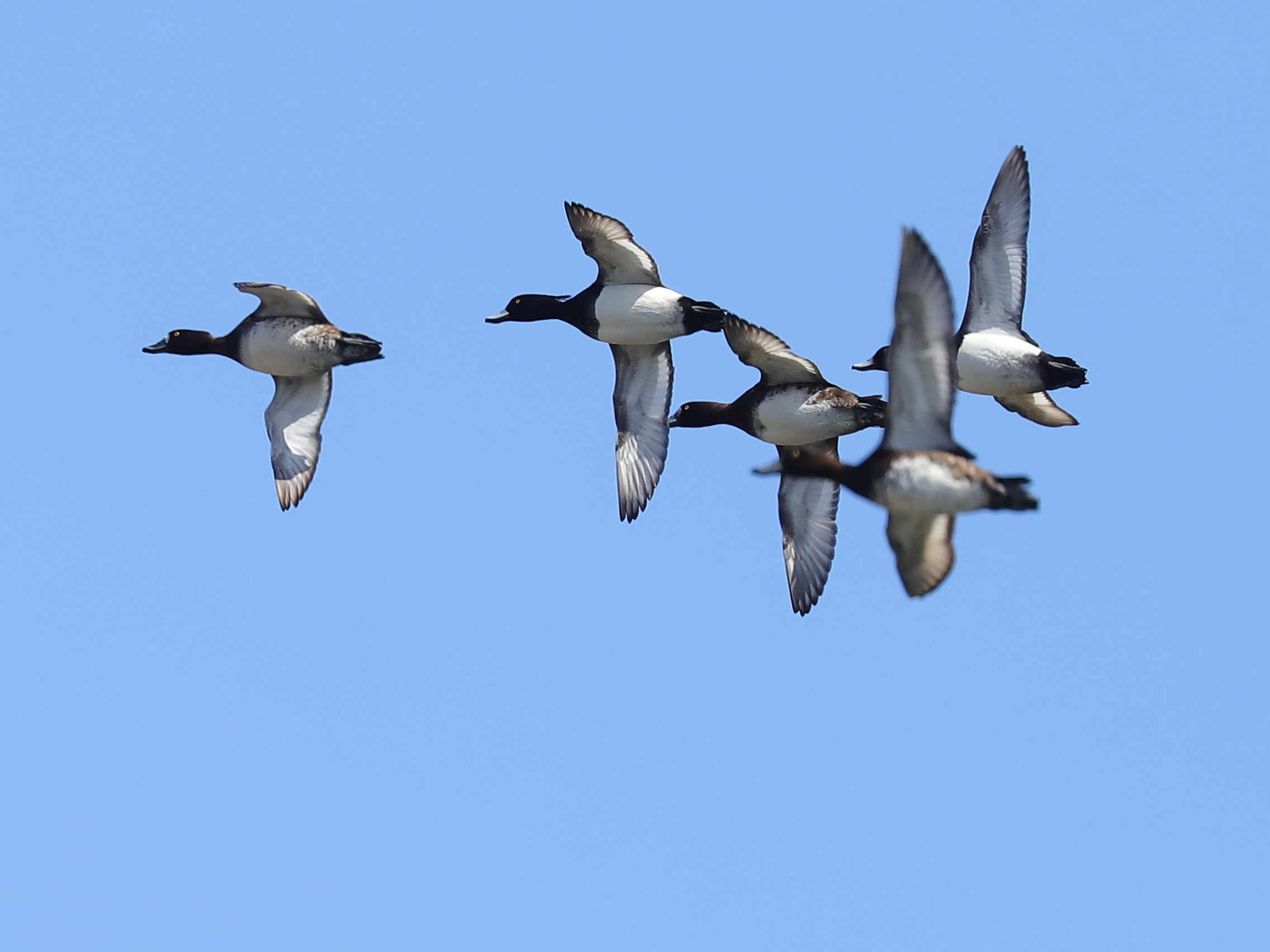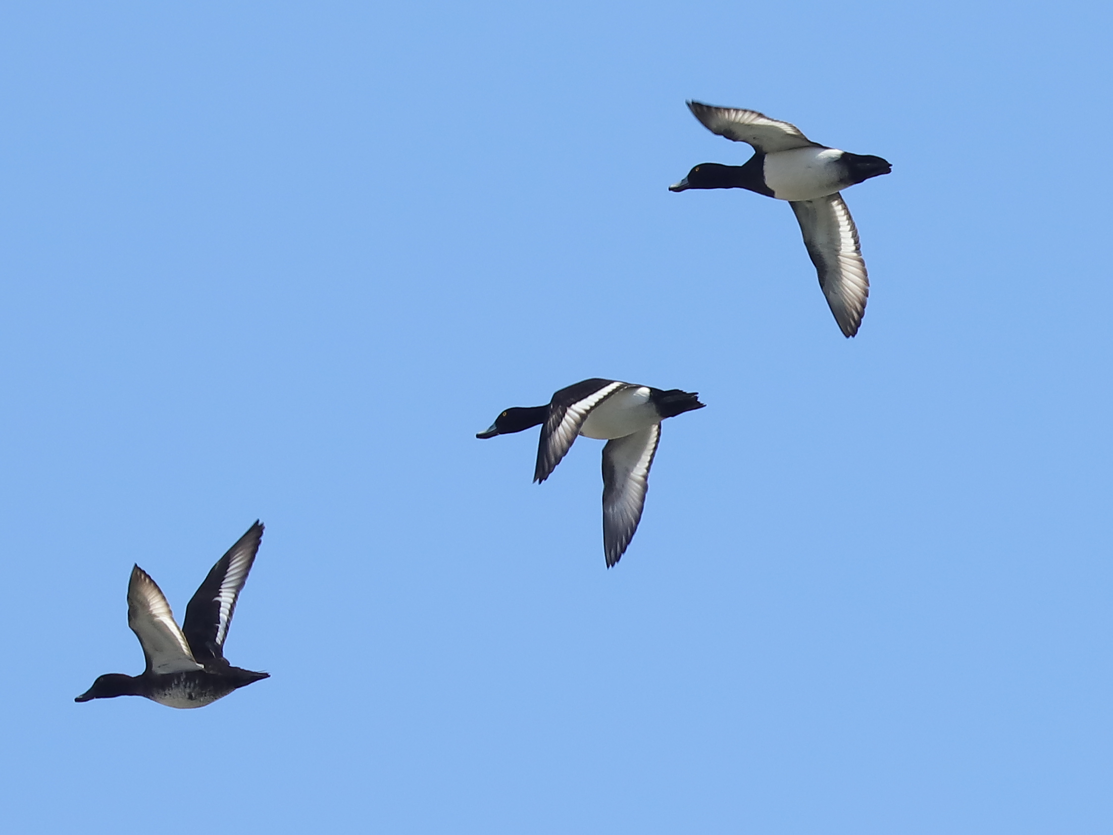 Les Fuligules morillons Aythya fuligula, que je présente souvent posés sur l’eau, sont des canards assez jolis aussi en vol. Les mâles ont le ventre blanc pur et les femelles sont tachetées à hauteur des cuisses.