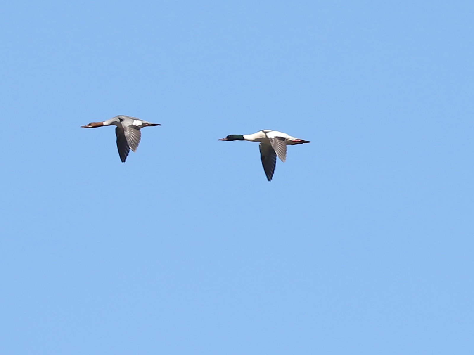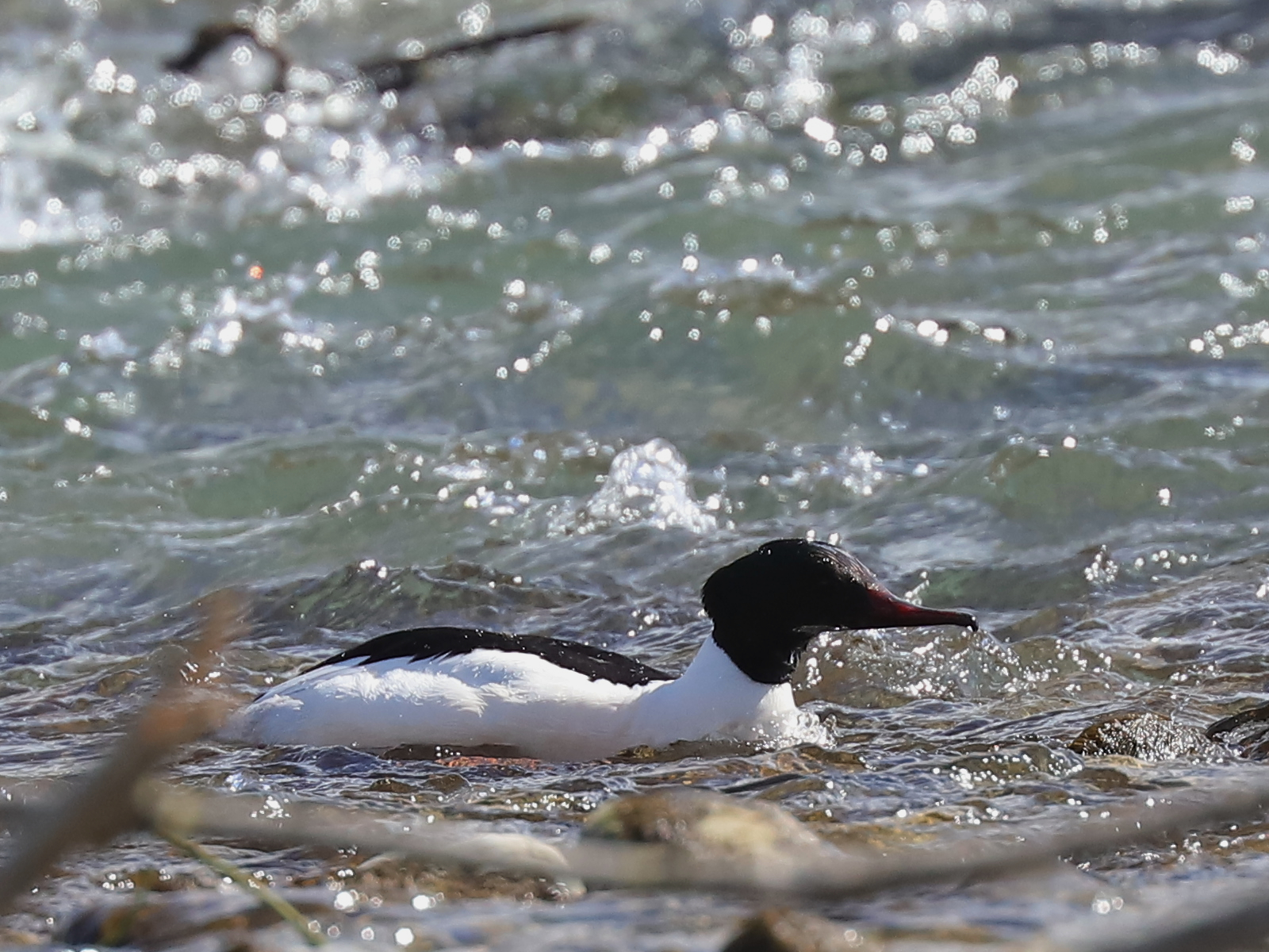 Un mâle de Harle bièvre Mergus merganser remonte le courant de la Dranse pendant qu’un autre suit une femelle en vol.