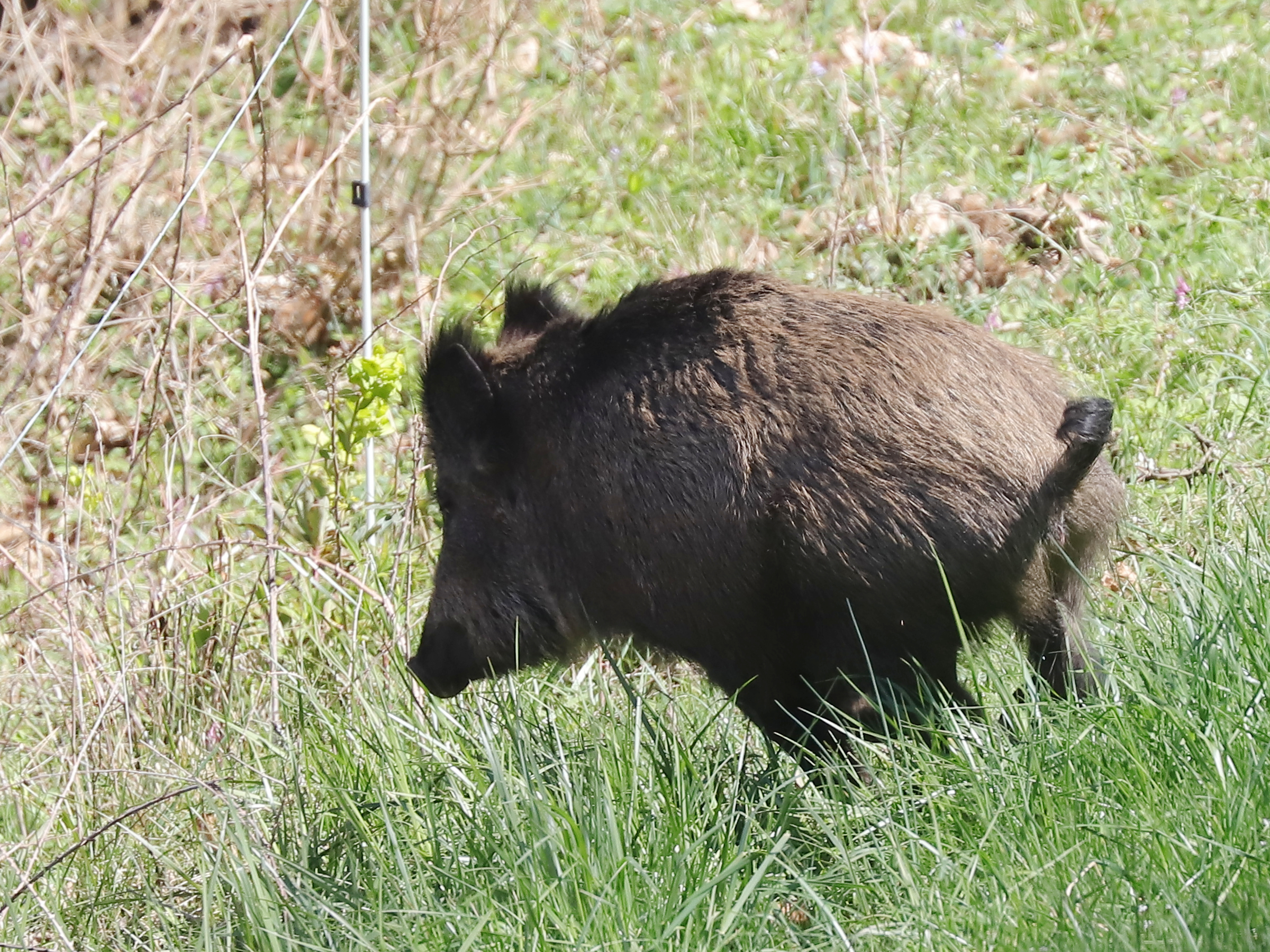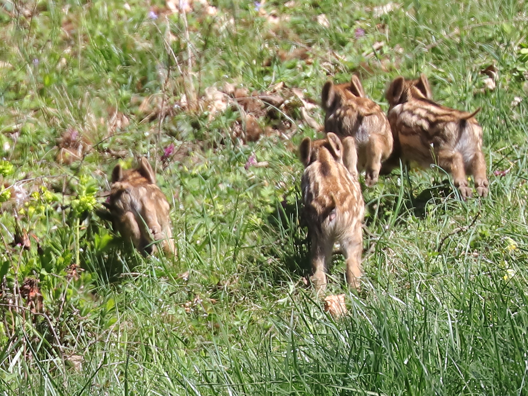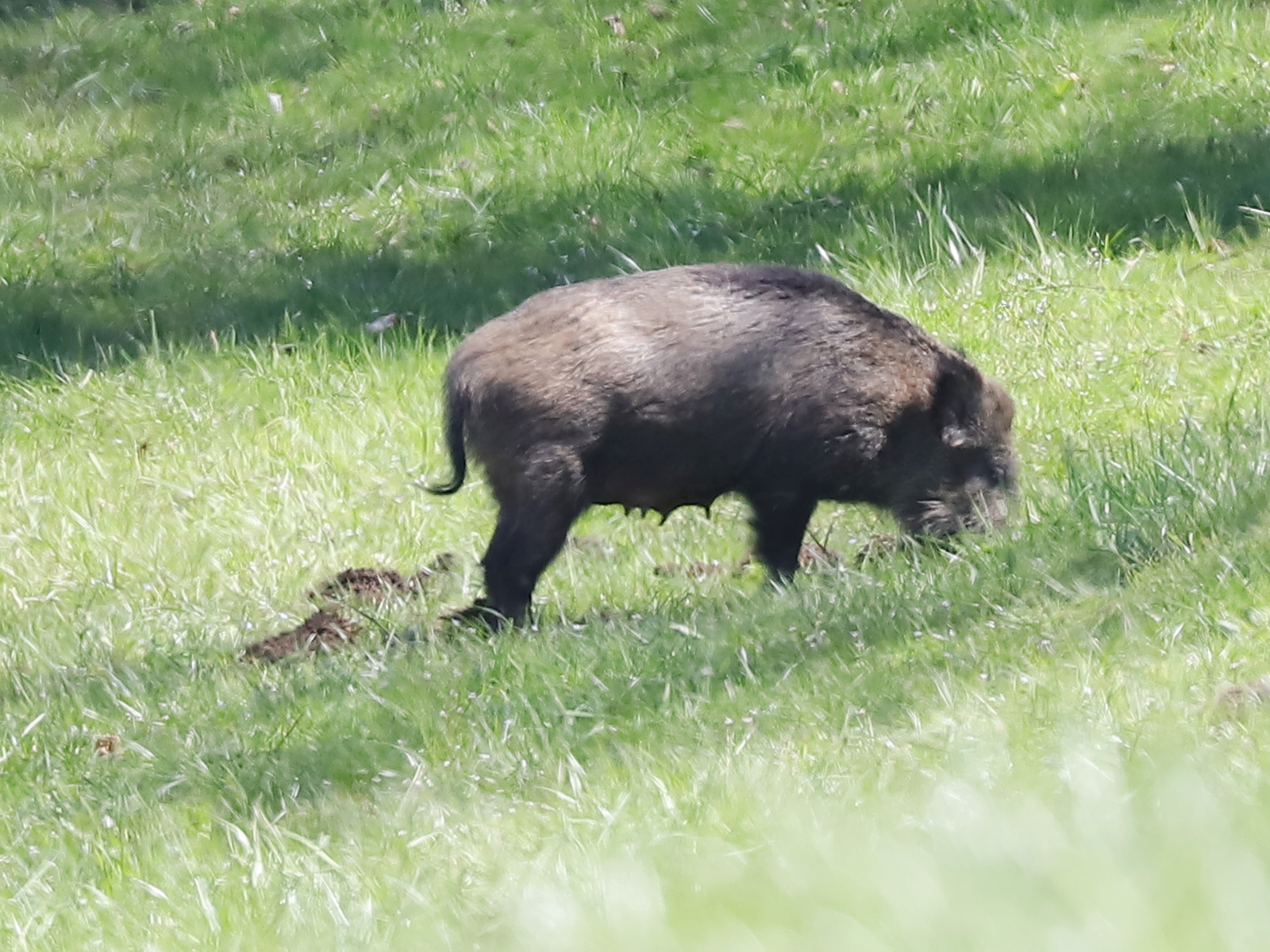 Une laie allaitante Sus scrofa fouissait tranquillement dans un pré, vers 14h. Entre la première et la dernière photo 17 minutes se sont écoulées, c’est donc en toute quiétude que la bête s’est nourrie avant de se rendre compte de ma présence, d’appeler ses 6 à 8 petits et de disparaître dans les fourrés.