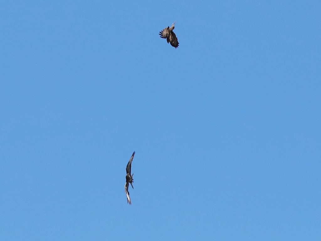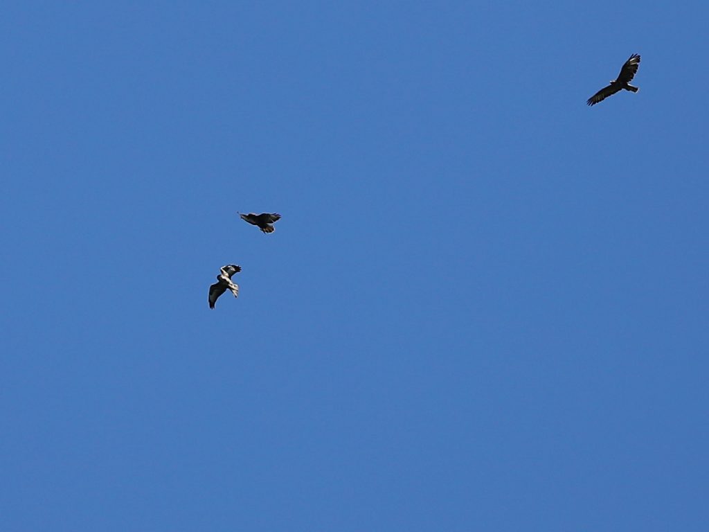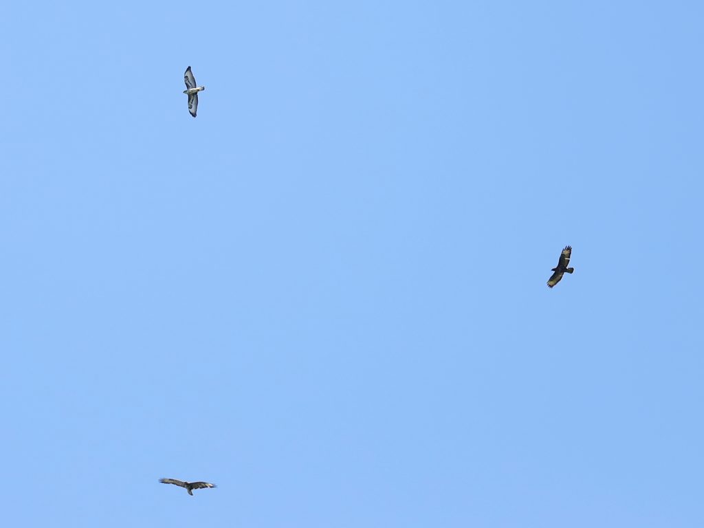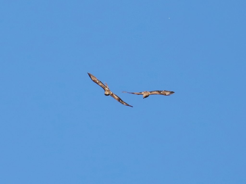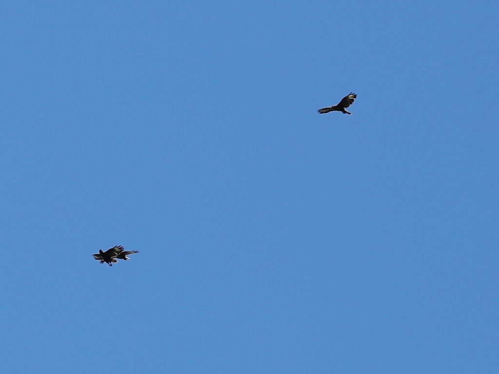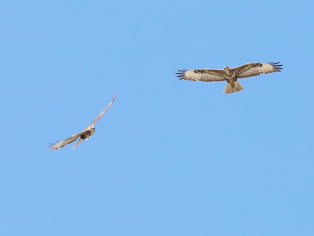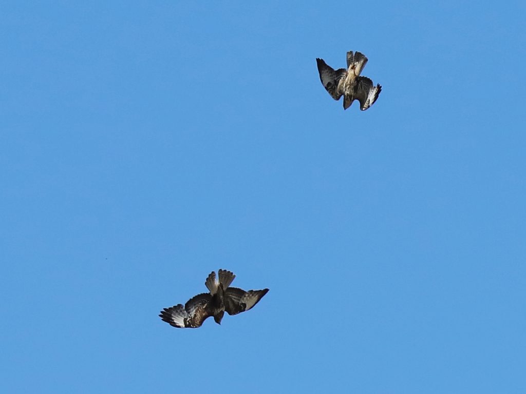 Du côté des Buses variables Buteo buteo, j’ai assisté à une joute aérienne de deux oiseaux aux caractéristiques juvéniles puisqu’ils n’ont pas de barre sombre terminale sur la queue.