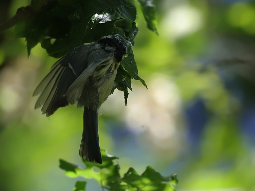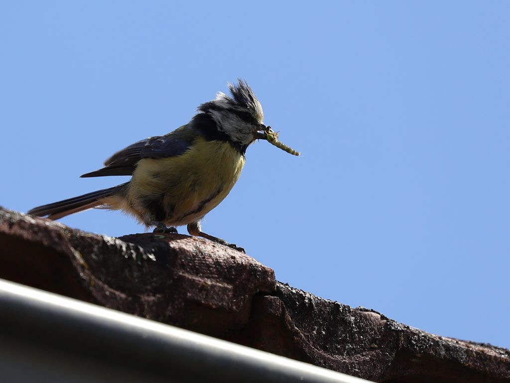 En parlant de ponte, chez bon nombre d’oiseaux, non seulement la ponte a eu lieu mais la couvaison est aussi terminée. Il y a dans un des nichoirs fixés au murs chez moi, une nichée de Mésanges charbonnières Parus major. Le mâle – bandeau pectoral noir épais – et la femelle – bandeau pectoral fin et discontinu – se relayent à un rythme soutenu pour calmer les appels des affamés. Régime riche en protéines : araignées, chenilles et larves diverses, le tout prélevé dans mes arbres fruitiers, merci.