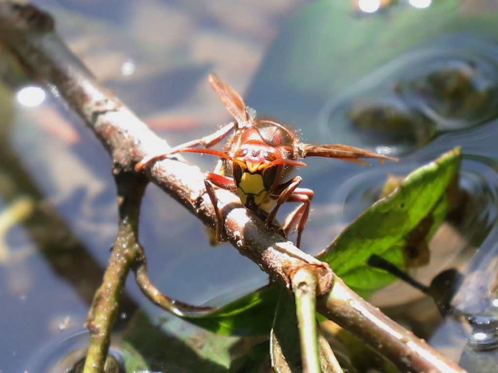 Un Frelon européen Vespa crabro est venu boire au bord d’une mare. Je l’ai trouvé un peu alourdi après. Comme quoi il faut boire avec modération !