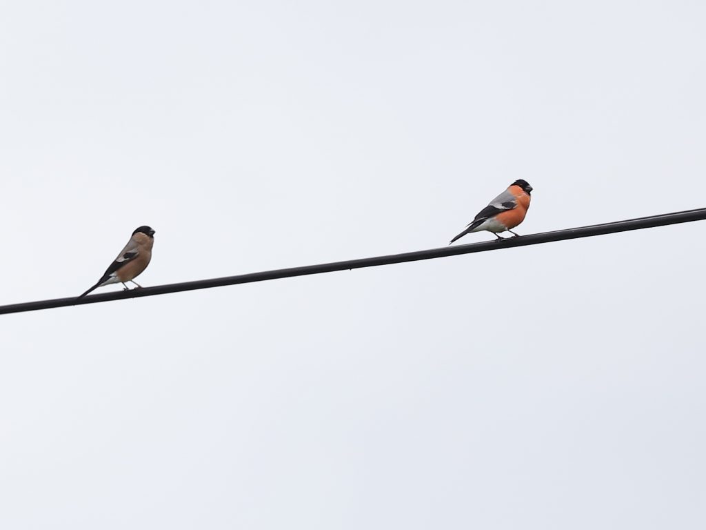 … une paire de Bouvreuils pivoine Pyrrhula pyrrhula, rarement visibles perchés sur un câble car ce sont des oiseaux vivant plutôt dans les bois …