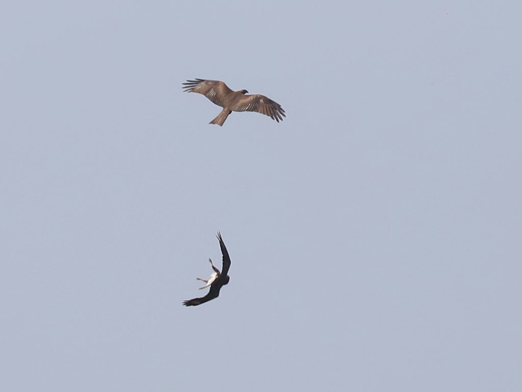 Voilà les rapaces dont les effectifs diminuent de jour en jour, au fur et à mesure des départs en migration. Ce sont les Milans noirs Milvus migrans, celui-ci est adulte qui semble porter un oisillon dans les serres …
