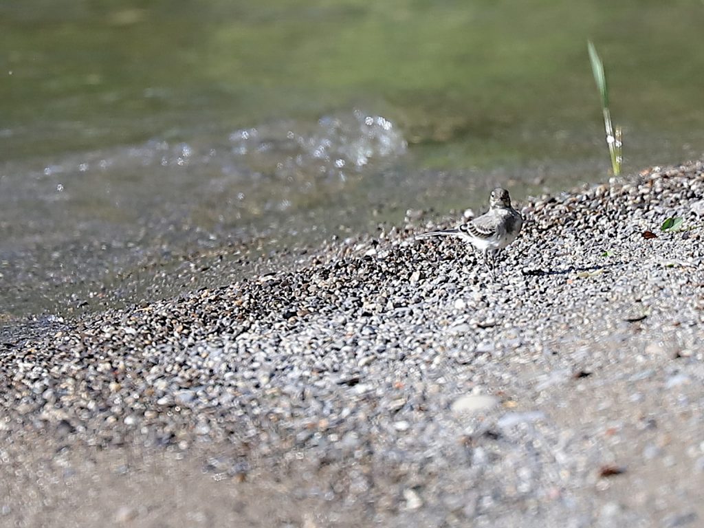 Au bord du lac, c’est une jeune Bergeronnette grise Motacilla alba qui picore les insectes sur la rive.