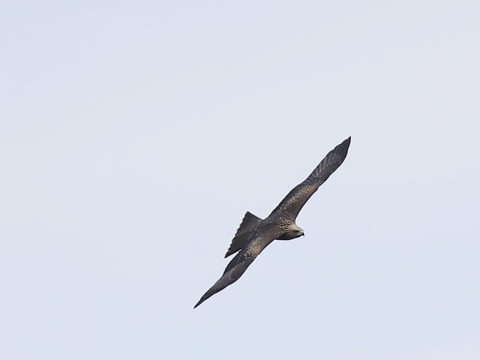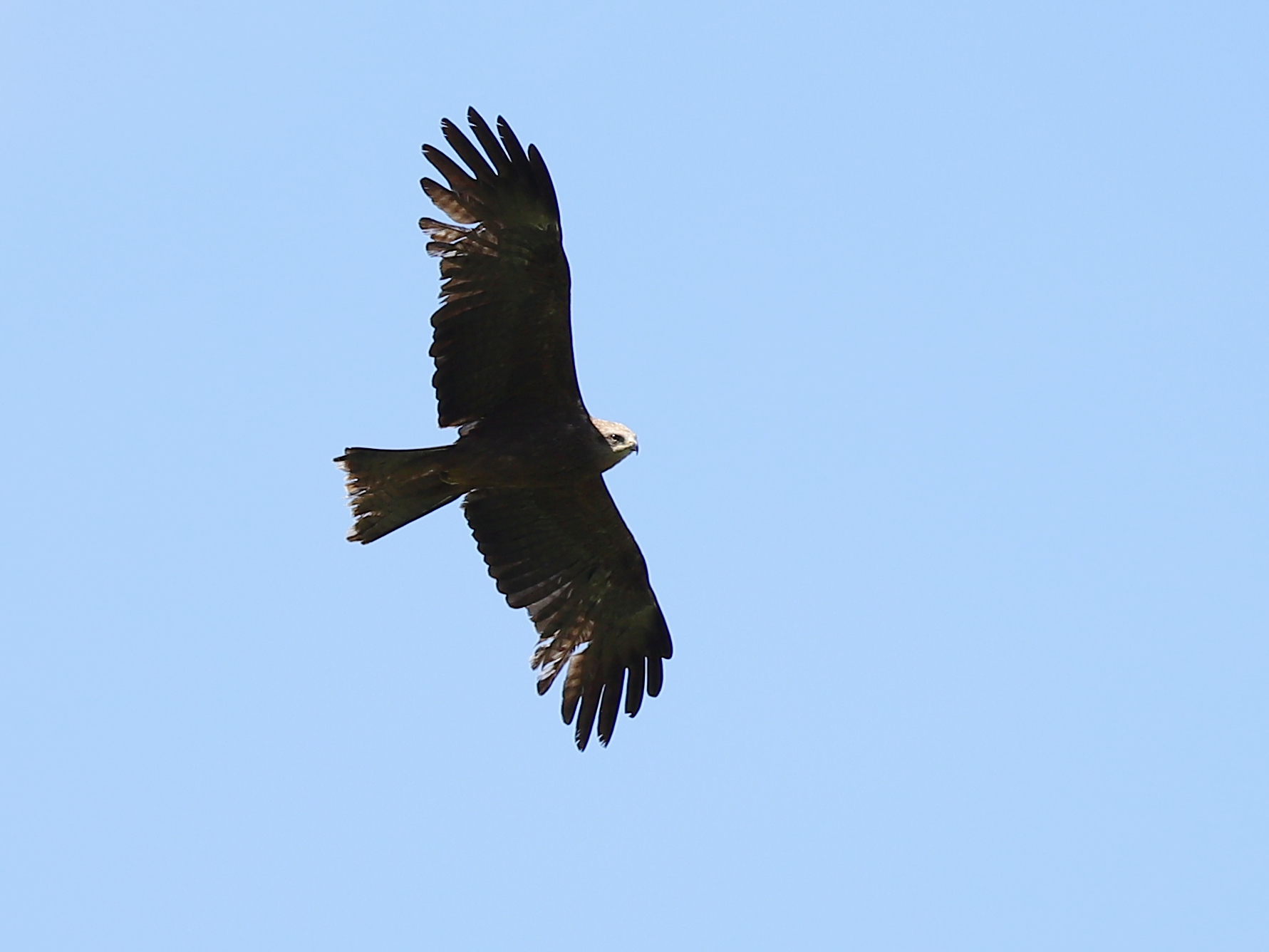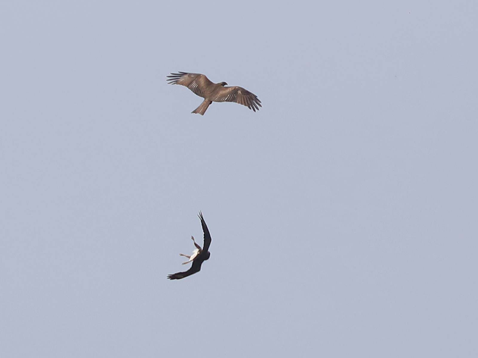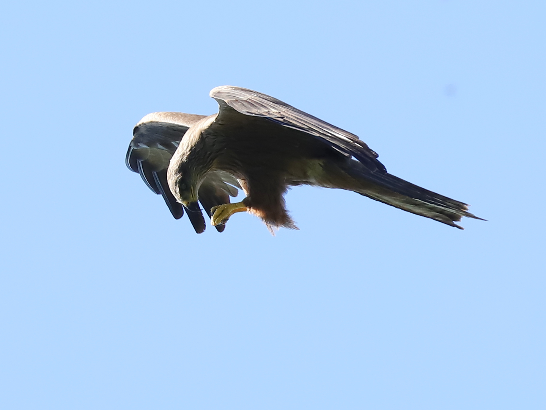 Voilà les rapaces dont les effectifs diminuent de jour en jour, au fur et à mesure des départs en migration. Ce sont les Milans noirs Milvus migrans, celui-ci est adulte qui semble porter un oisillon dans les serres …