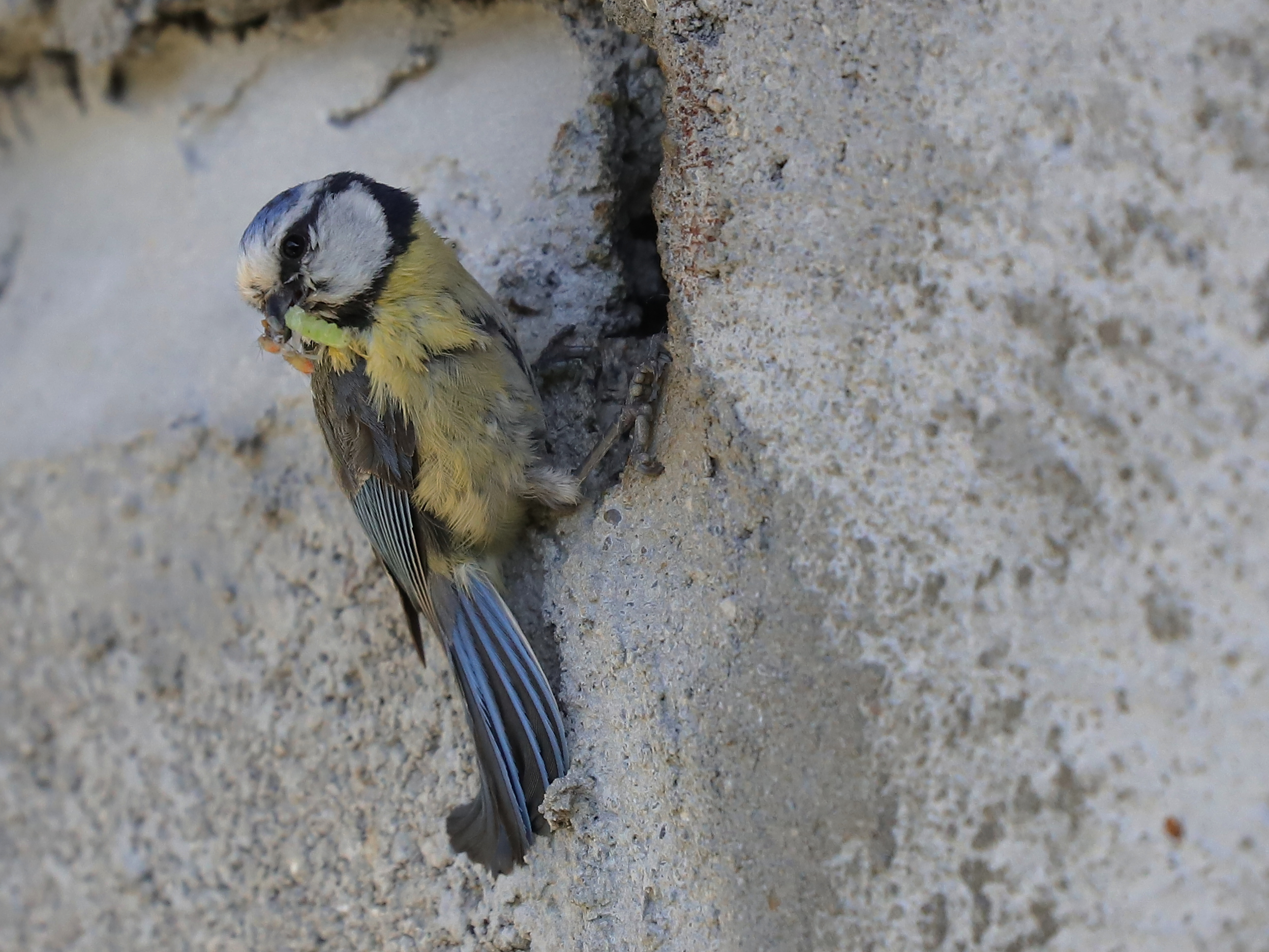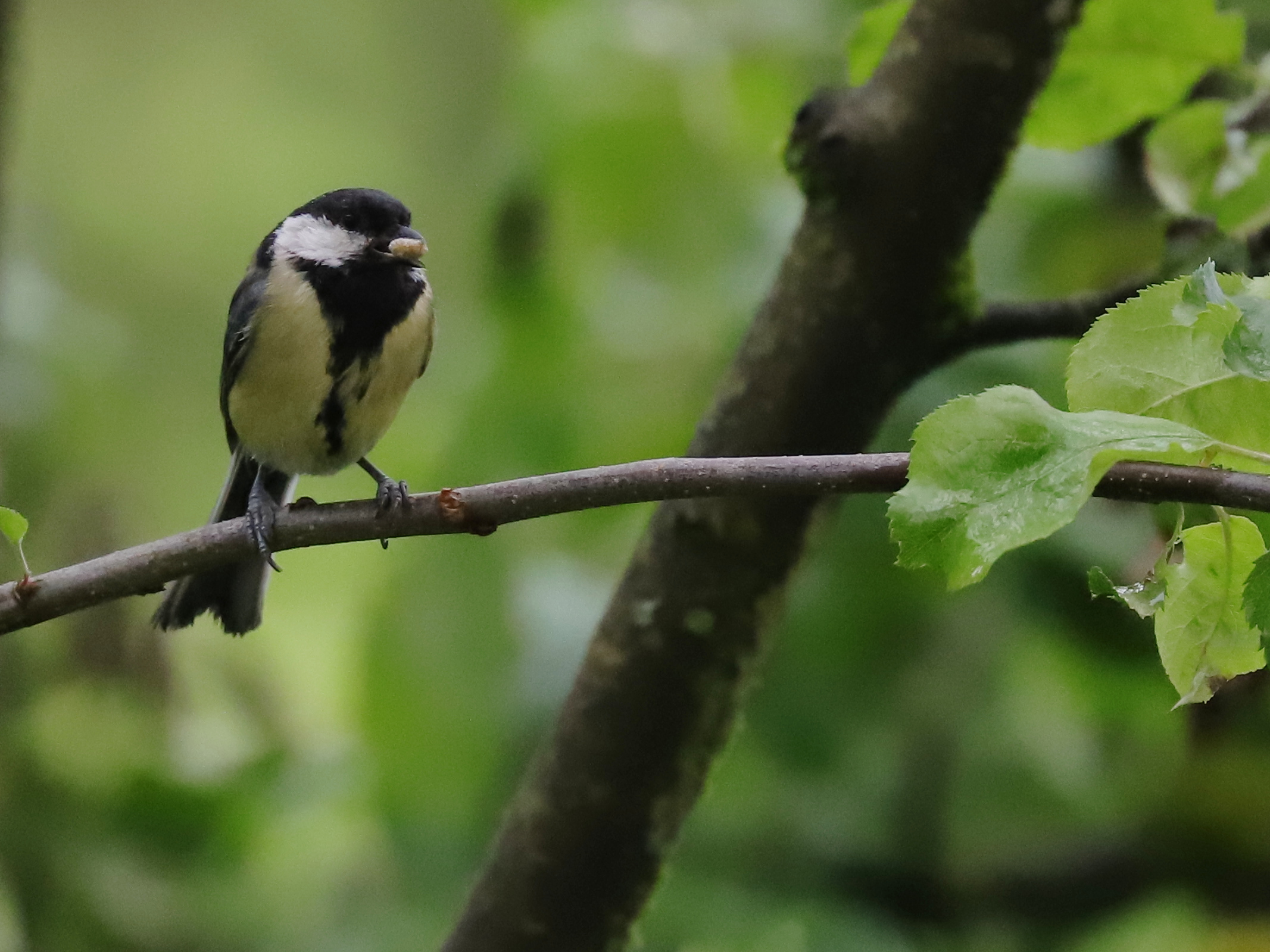 En parlant de ponte, chez bon nombre d’oiseaux, non seulement la ponte a eu lieu mais la couvaison est aussi terminée. Il y a dans un des nichoirs fixés au murs chez moi, une nichée de Mésanges charbonnières Parus major. Le mâle – bandeau pectoral noir épais – et la femelle – bandeau pectoral fin et discontinu – se relayent à un rythme soutenu pour calmer les appels des affamés. Régime riche en protéines : araignées, chenilles et larves diverses, le tout prélevé dans mes arbres fruitiers, merci.