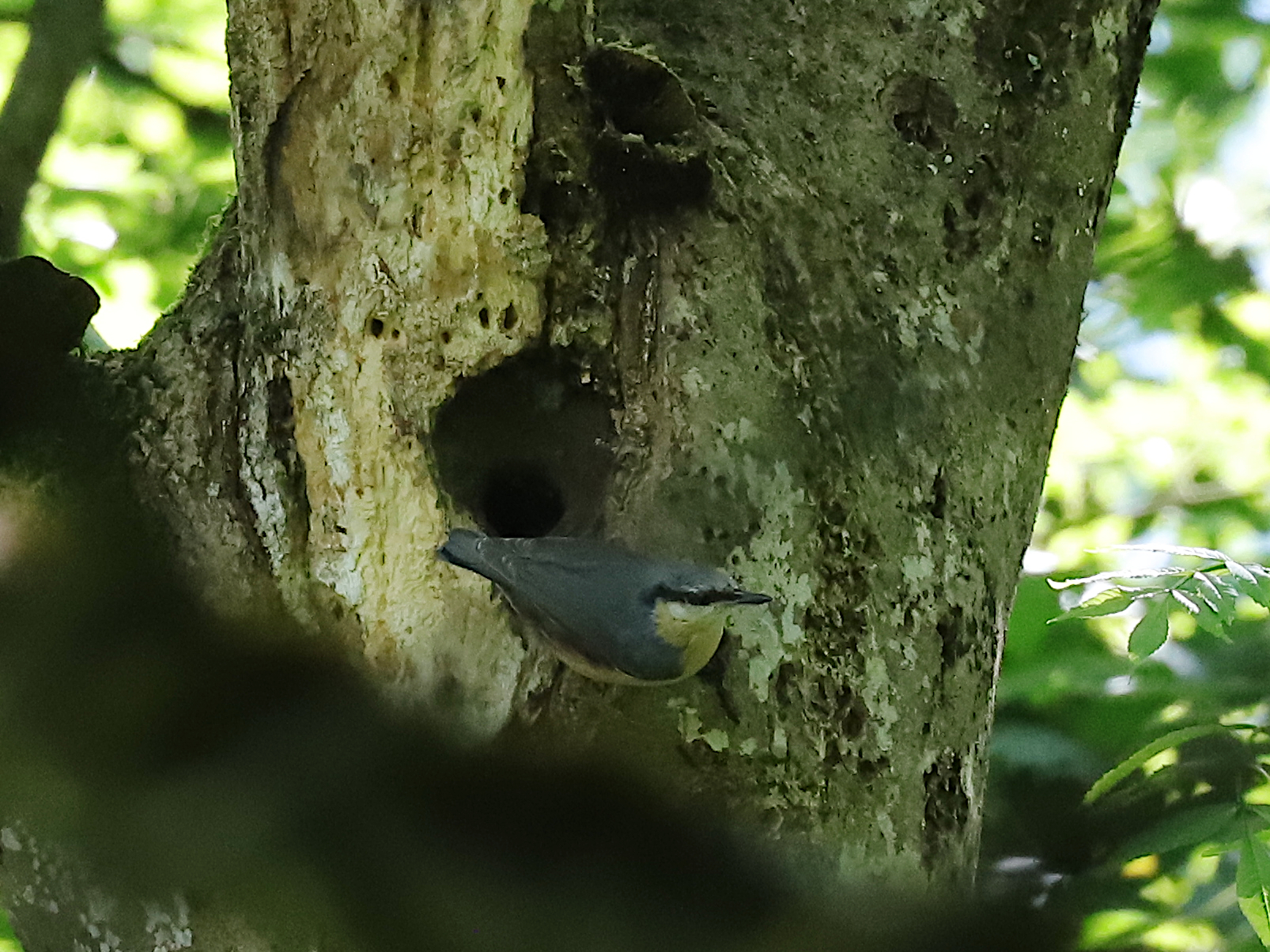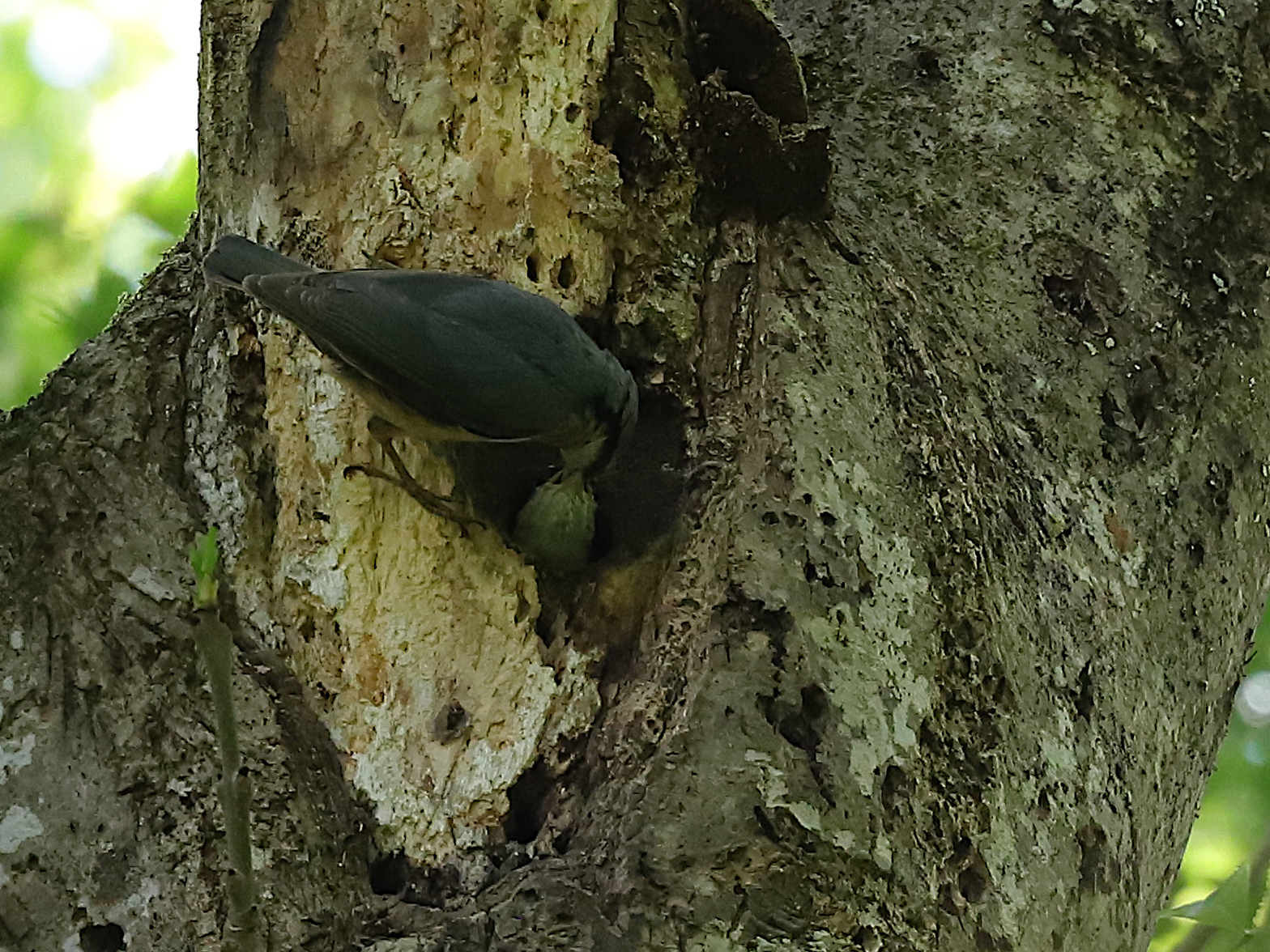 Voici une nichée de Sittelle torchepot Sitta europaea, où on voit un oisillon venir chercher sa becquée. On peut voir aussi que le trou, une ancienne loge de pic, a été maçonné avec de la boue pour s’ajuster à la taille de l’oiseau. C’est de là que viendrait le nom de « torchepot » car l’oiseau fait un torchis de paille et de terre.