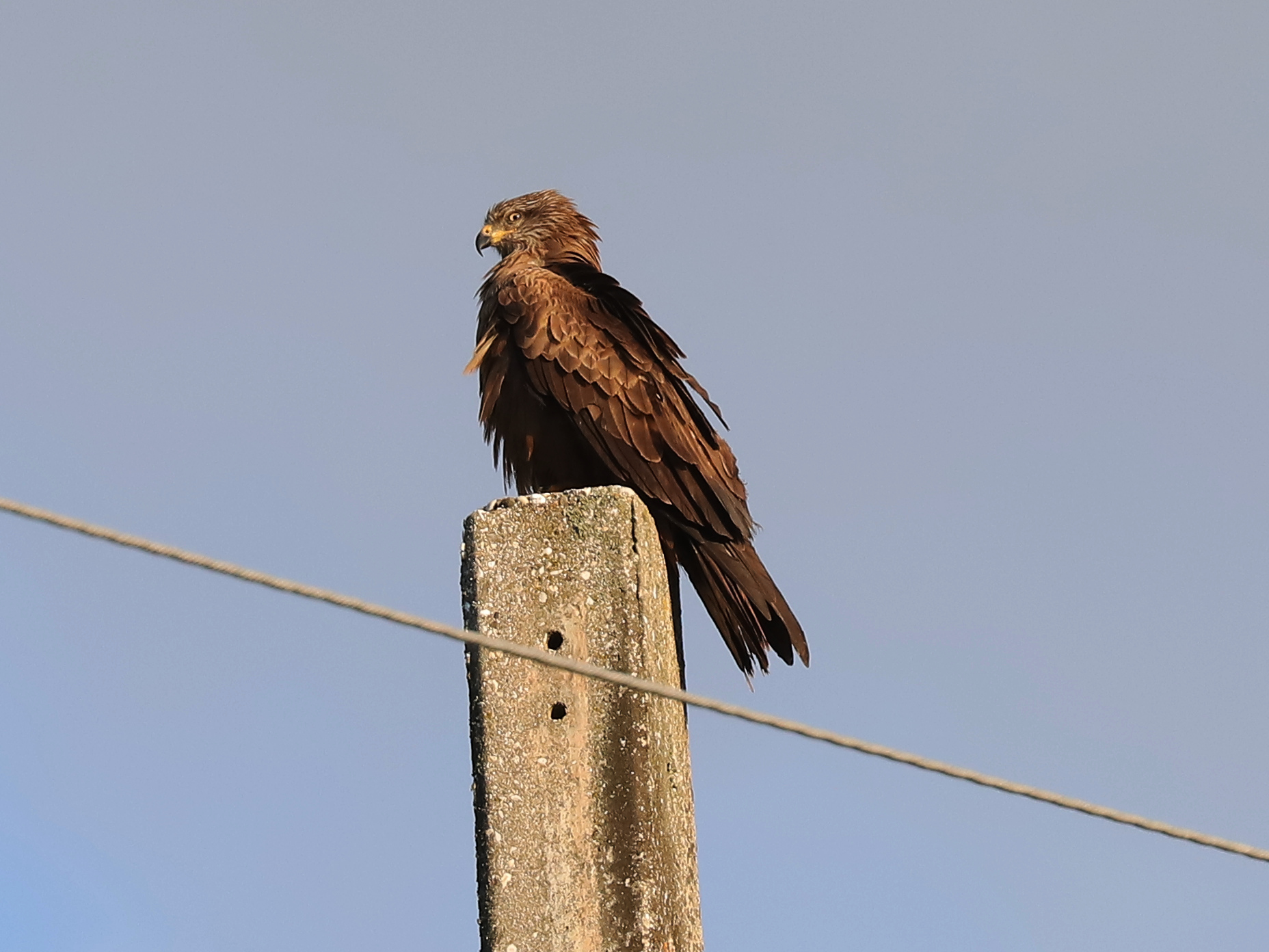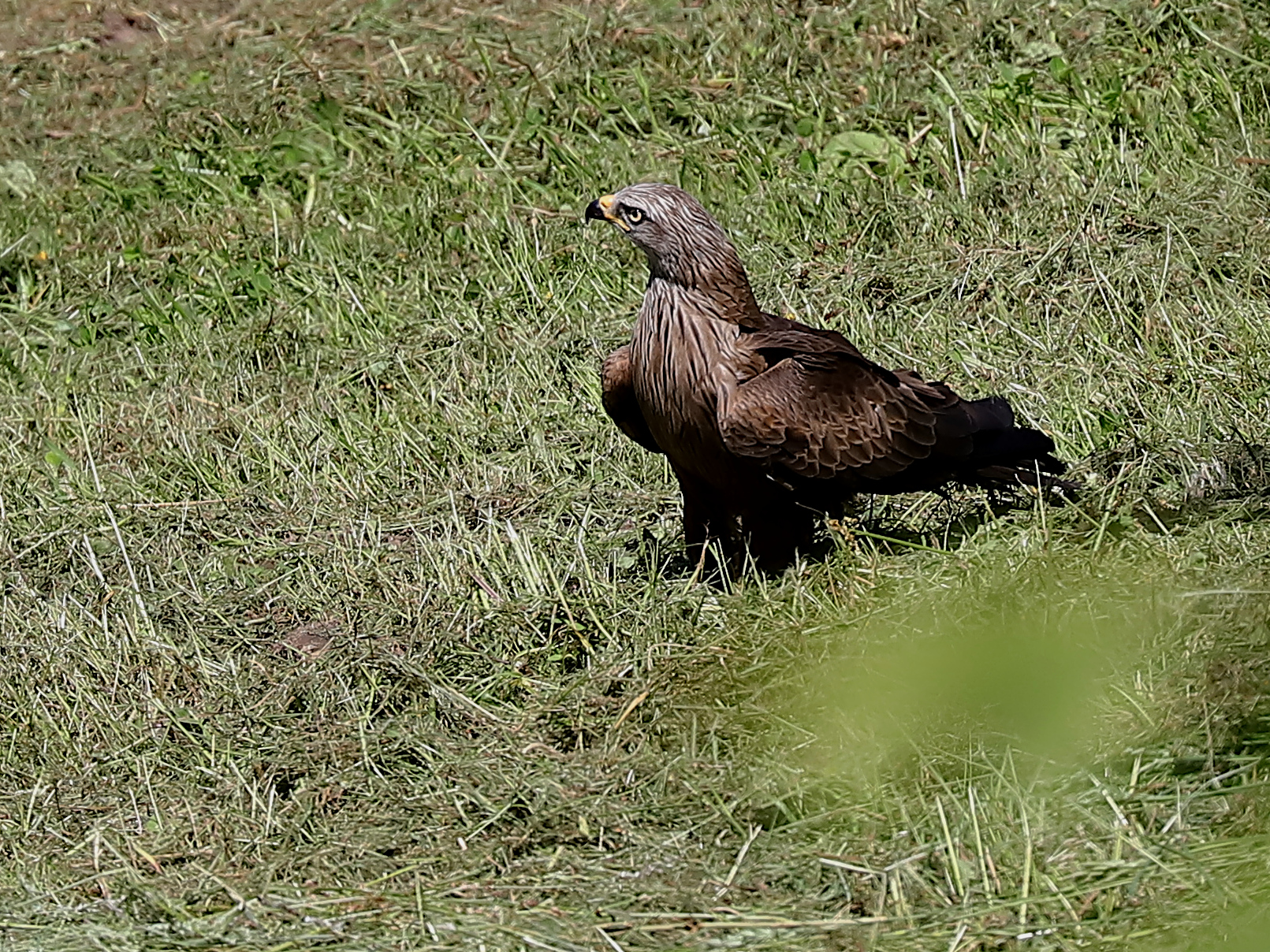Un agriculteur a fauché un pré et un Milan noir Milvus migrans est allé voir s’il y avait une opportunité de se nourrir. Déçu, il est reparti, probablement pour aller se percher plus loin dans une attitude très philosophique comme ses congénères.