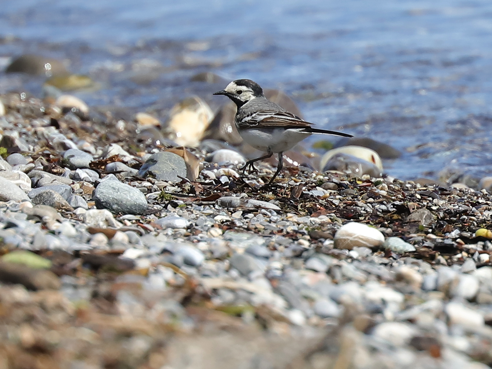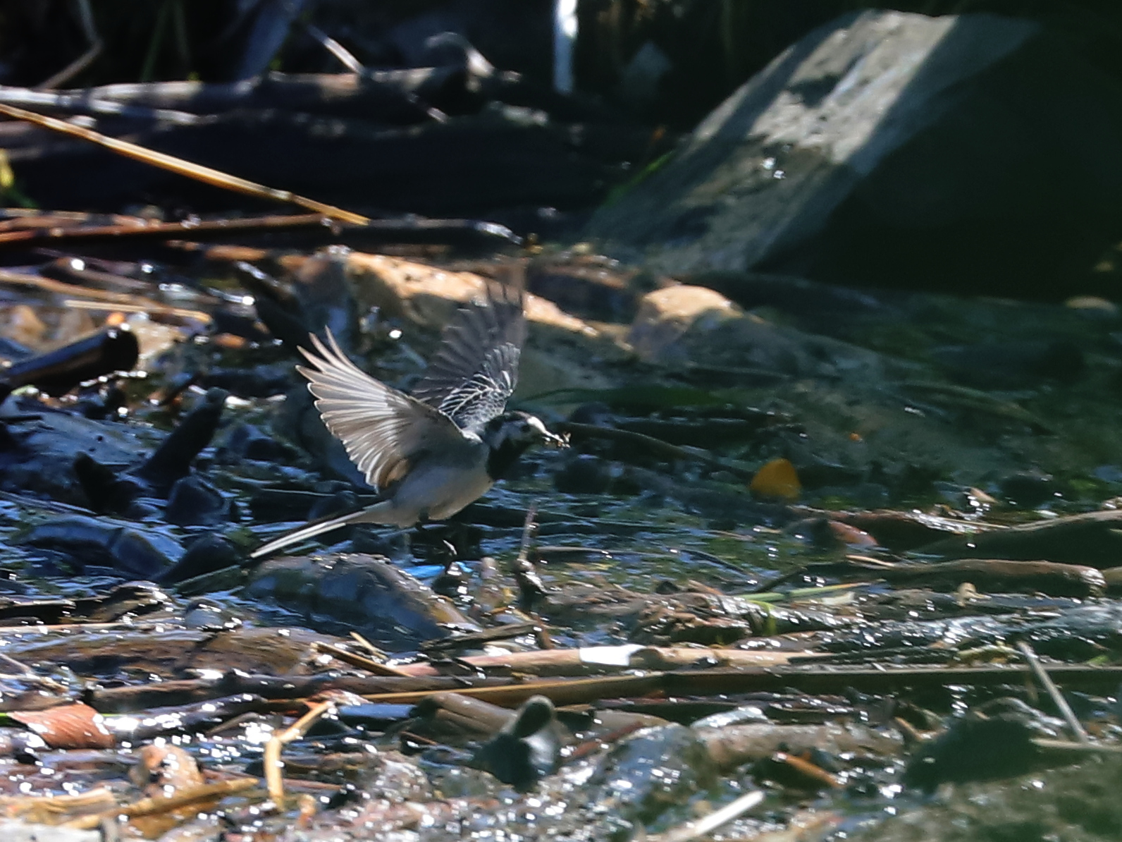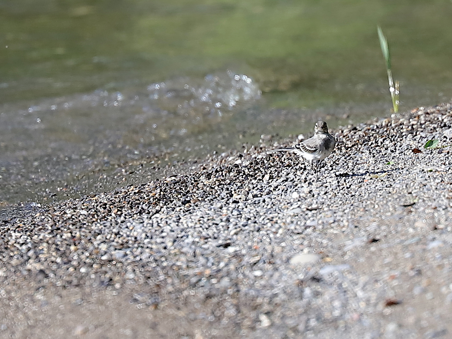 Au bord du lac, c’est une jeune Bergeronnette grise Motacilla alba qui picore les insectes sur la rive.