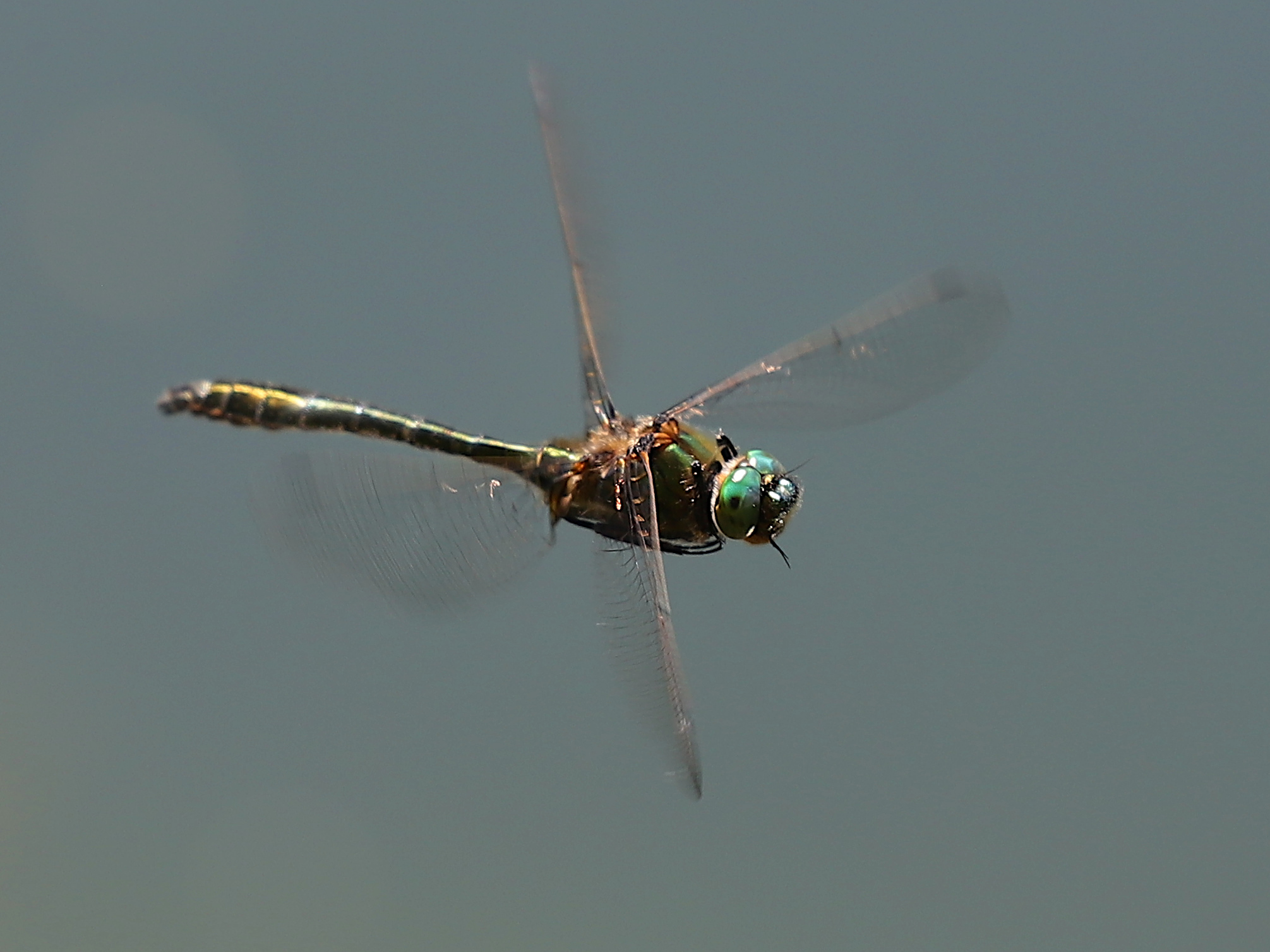 Dans les herbes humides au bas du point d’eau, une Aeschne Aeschna sp, mais je ne sais pas distinguer laquelle, est venue pondre dans la vase. La libellule vole en stationnaire et abaisse son abdomen pour déposer un oeuf et répète la manoeuvre quelques centimètres plus loin.