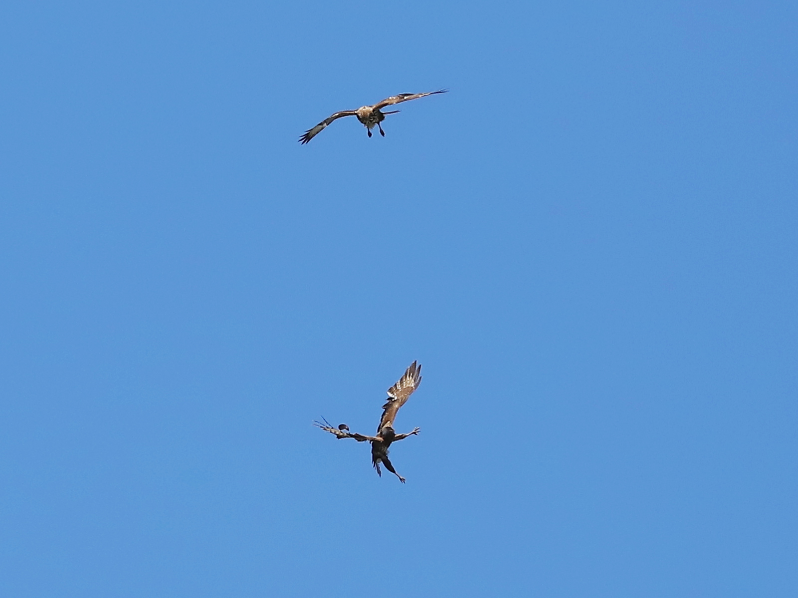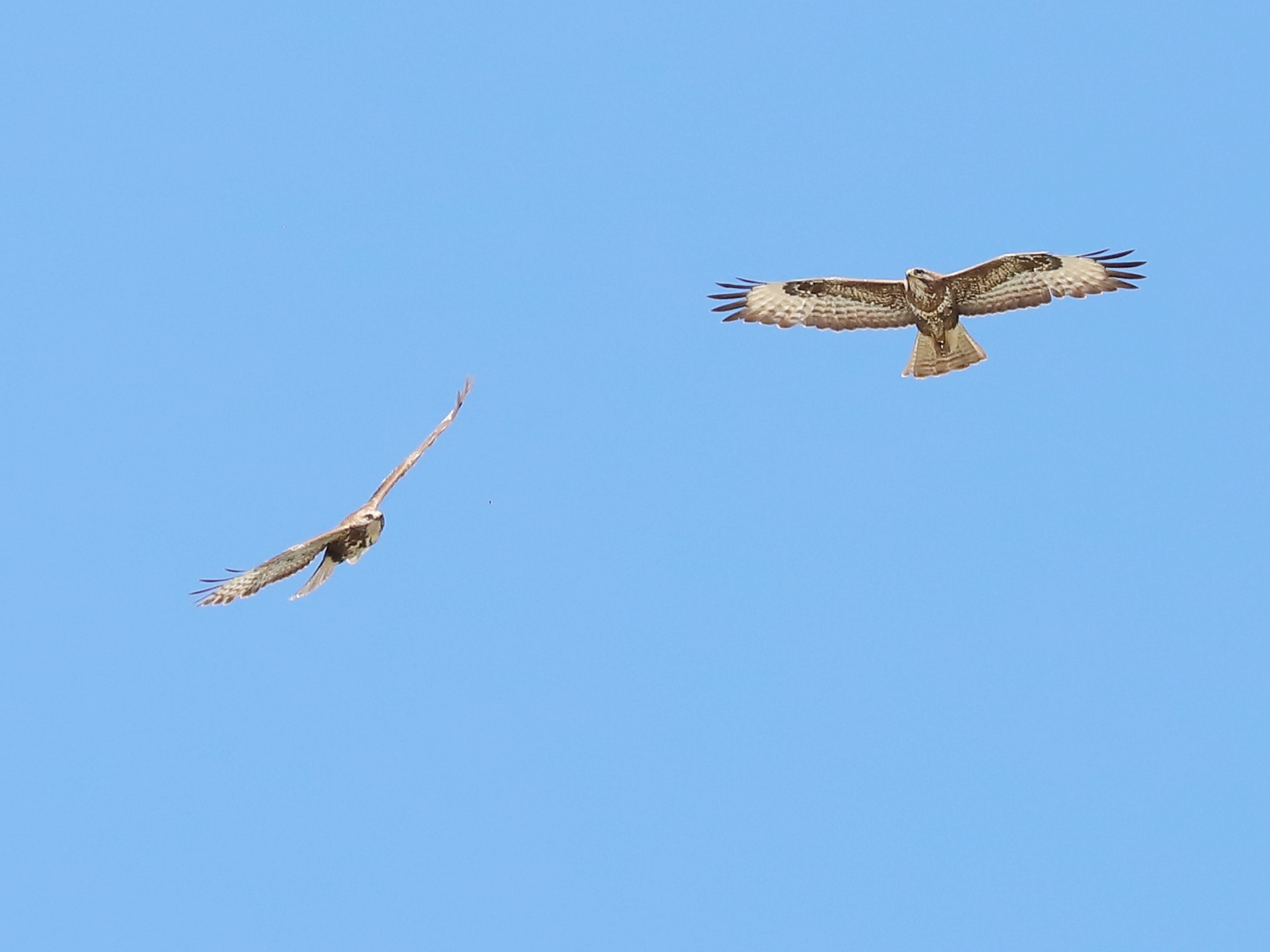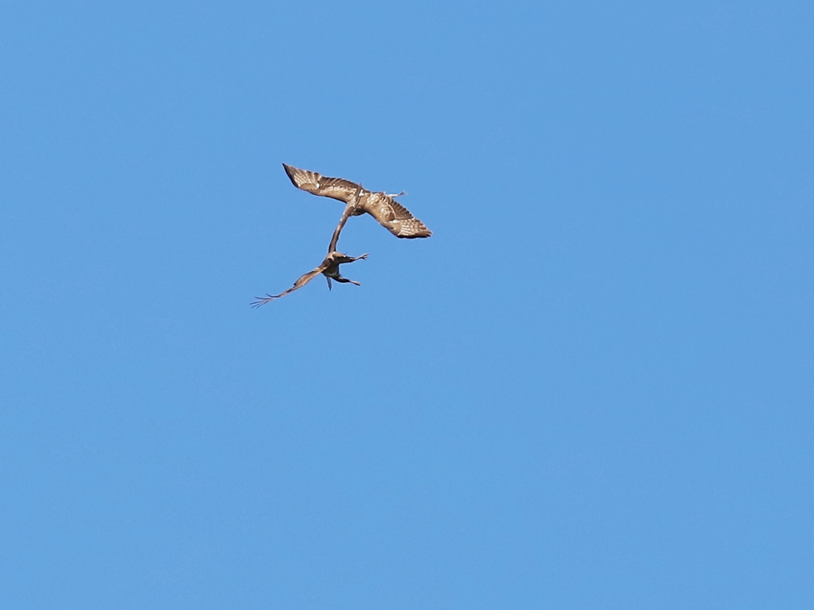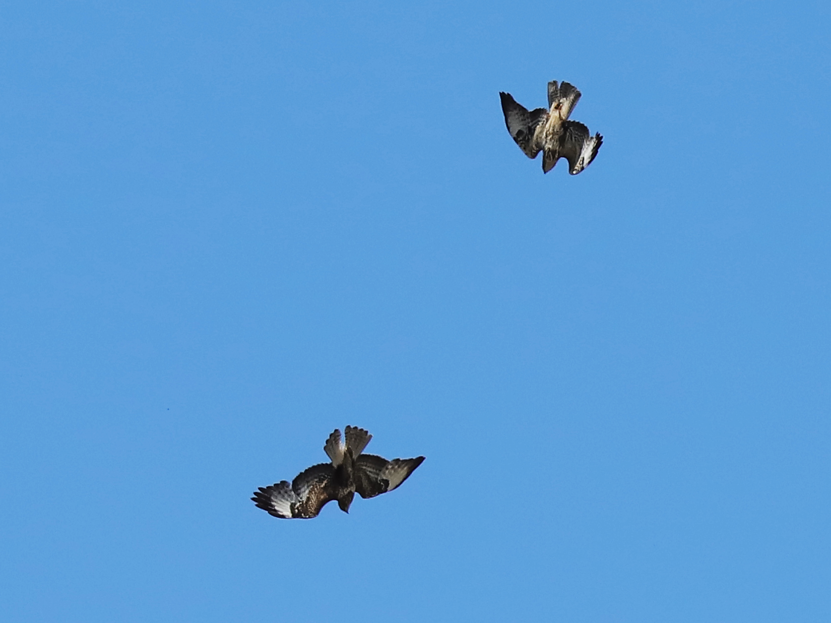 Du côté des Buses variables Buteo buteo, j’ai assisté à une joute aérienne de deux oiseaux aux caractéristiques juvéniles puisqu’ils n’ont pas de barre sombre terminale sur la queue.