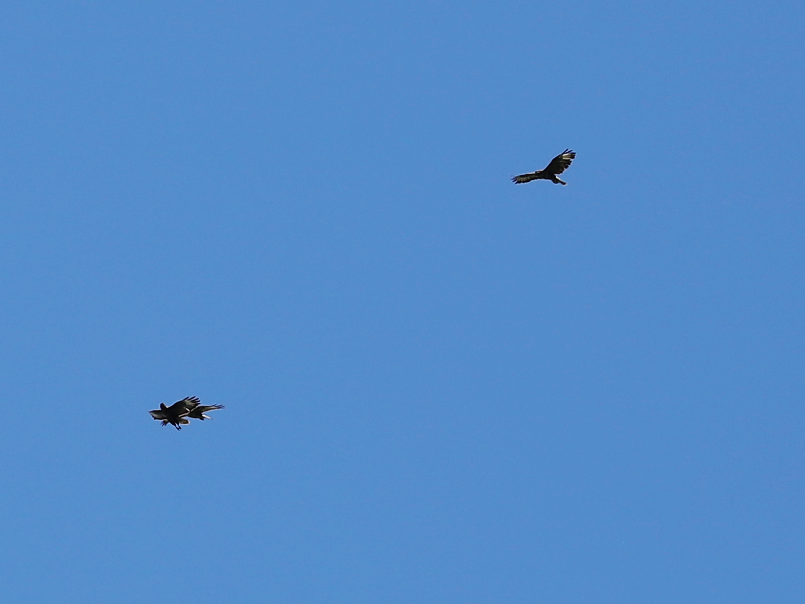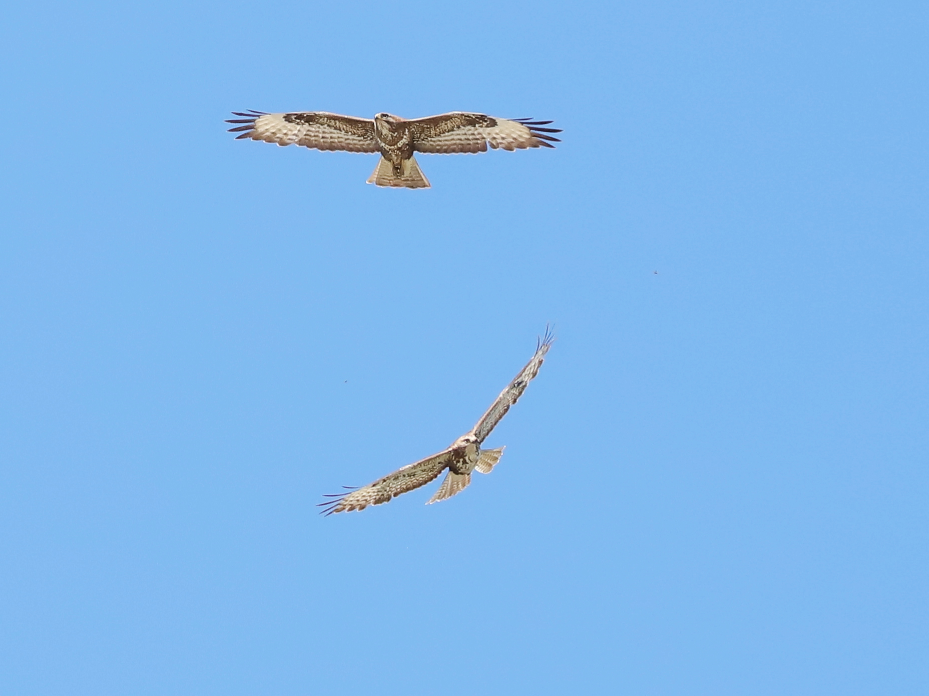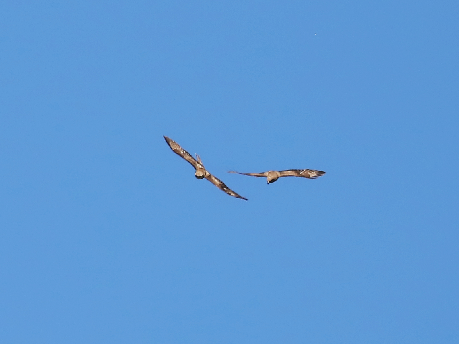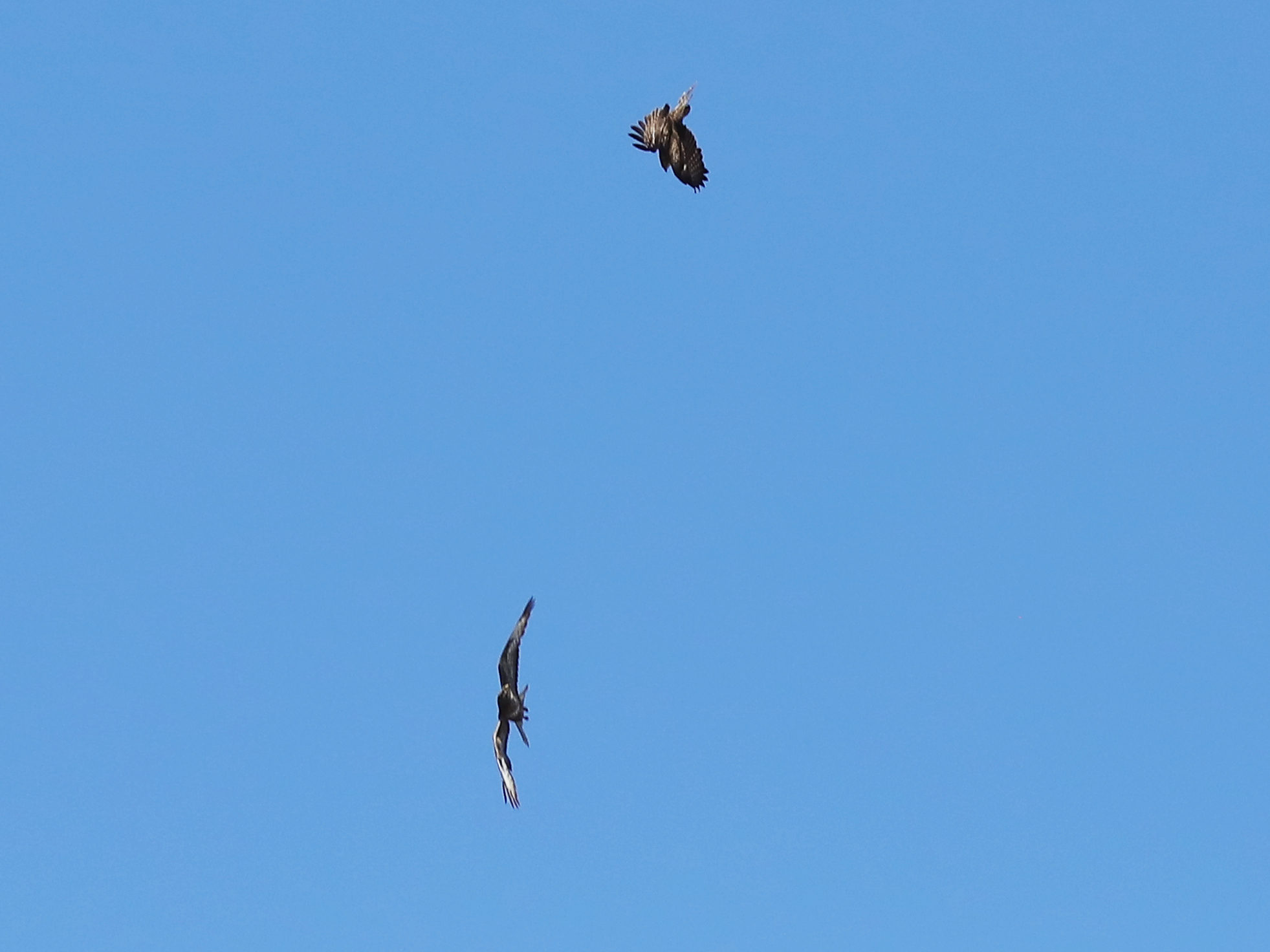 Du côté des Buses variables Buteo buteo, j’ai assisté à une joute aérienne de deux oiseaux aux caractéristiques juvéniles puisqu’ils n’ont pas de barre sombre terminale sur la queue.