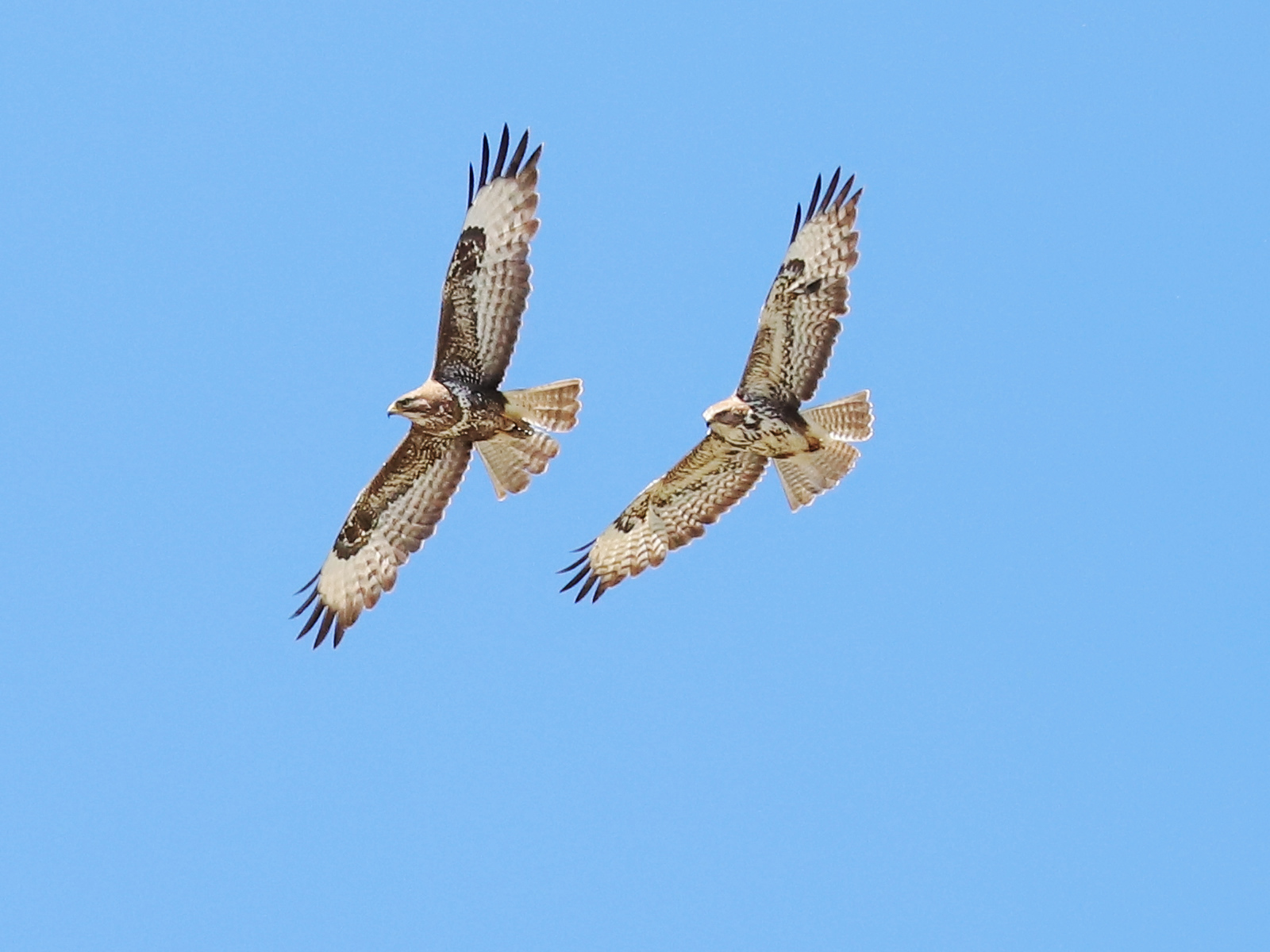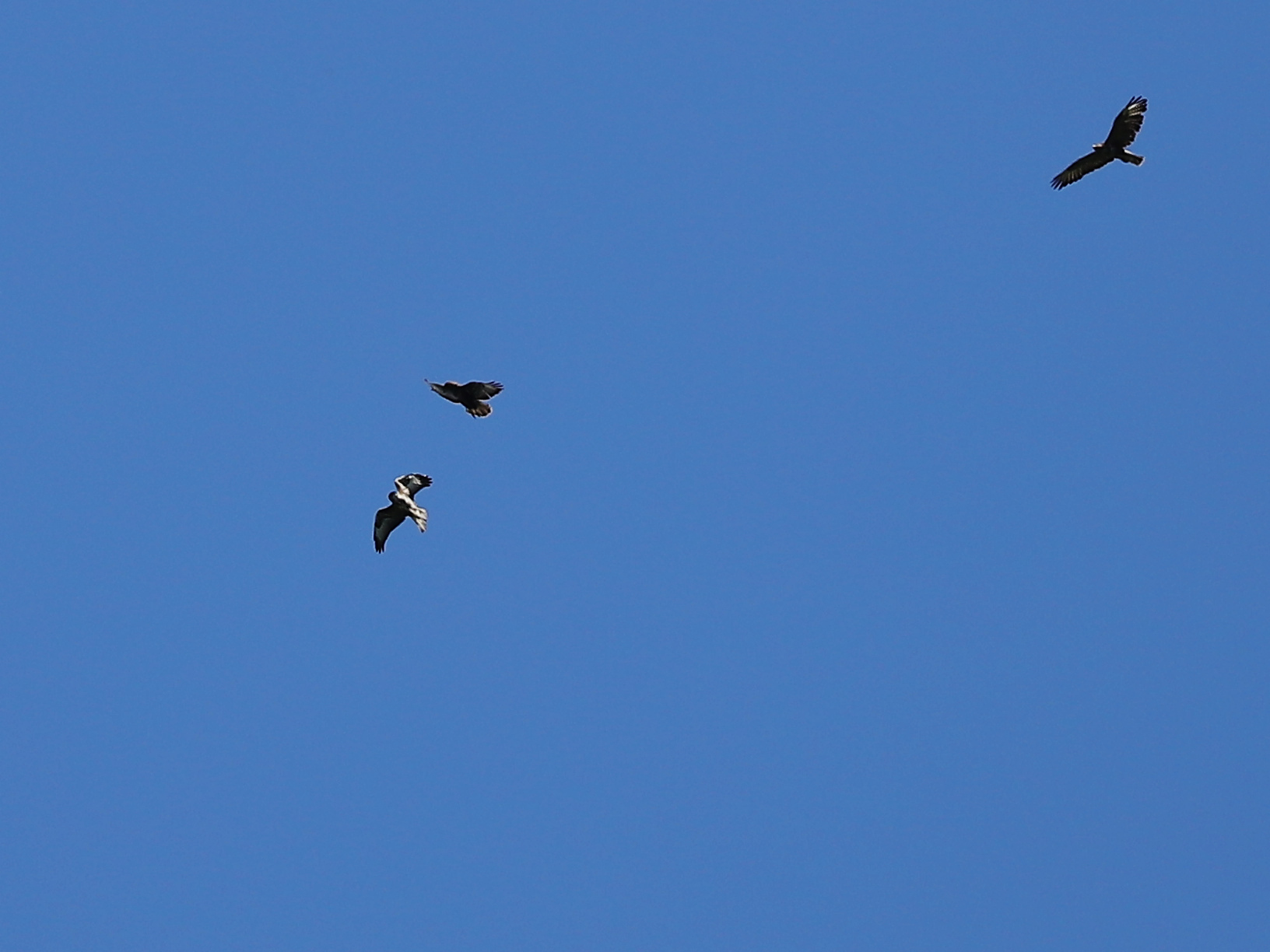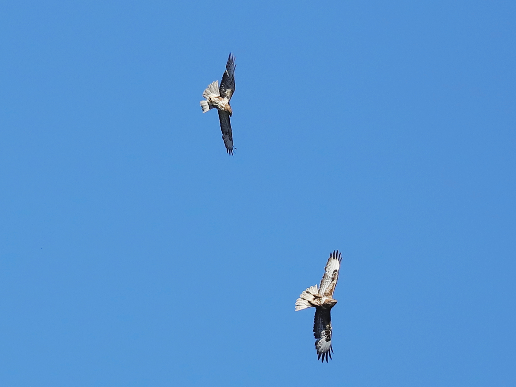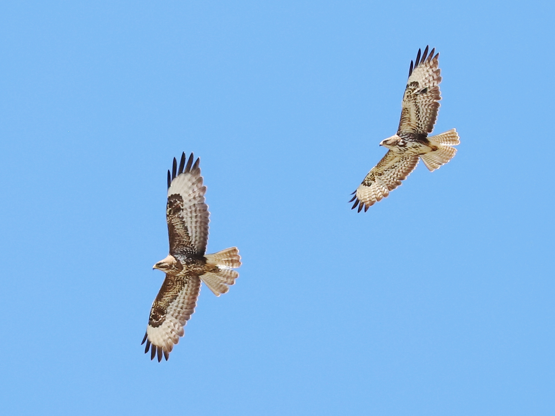 Du côté des Buses variables Buteo buteo, j’ai assisté à une joute aérienne de deux oiseaux aux caractéristiques juvéniles puisqu’ils n’ont pas de barre sombre terminale sur la queue.