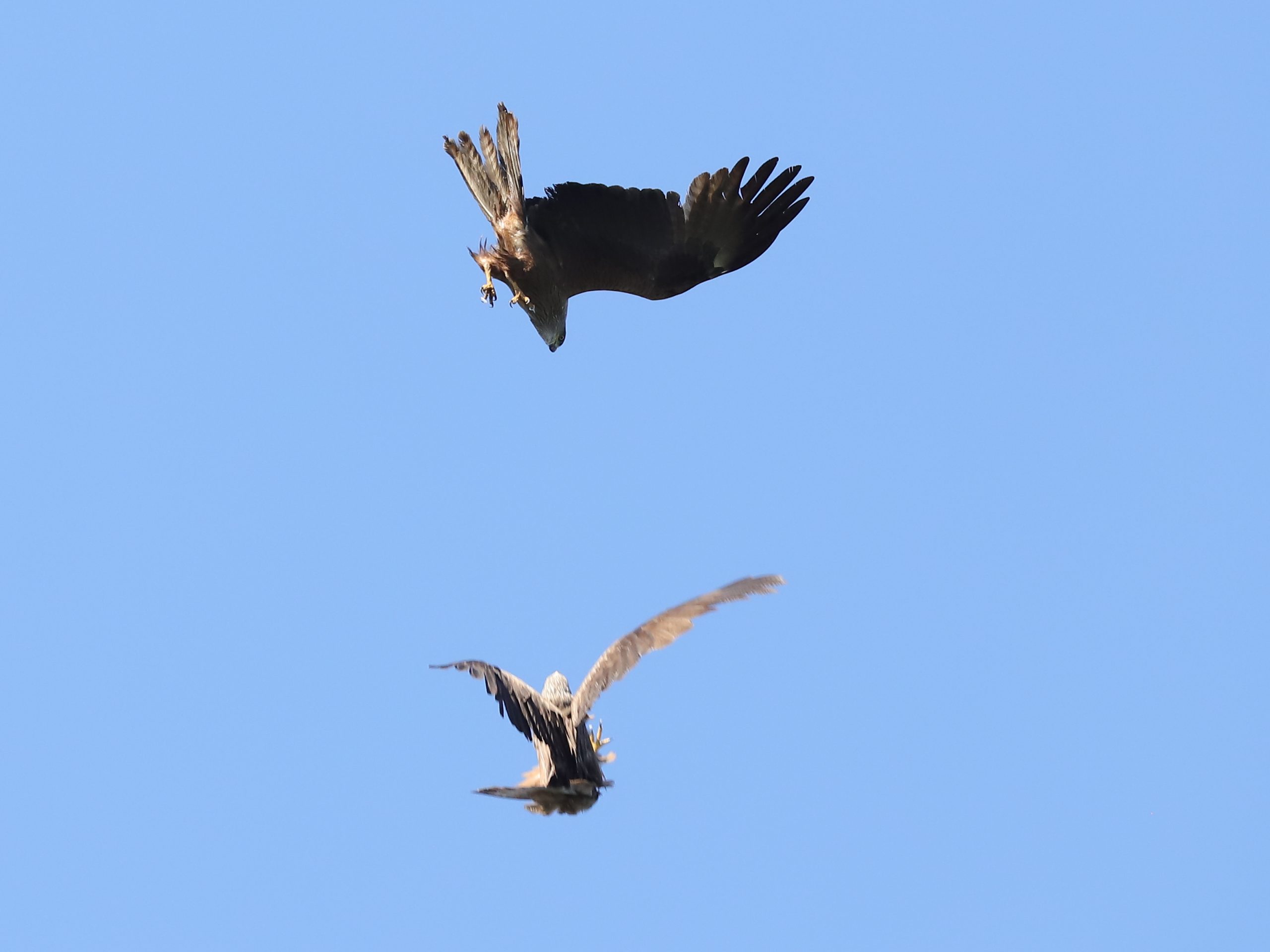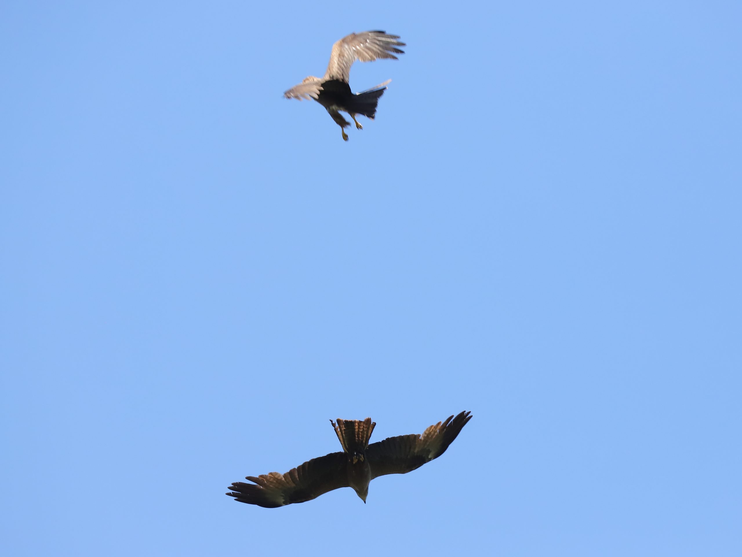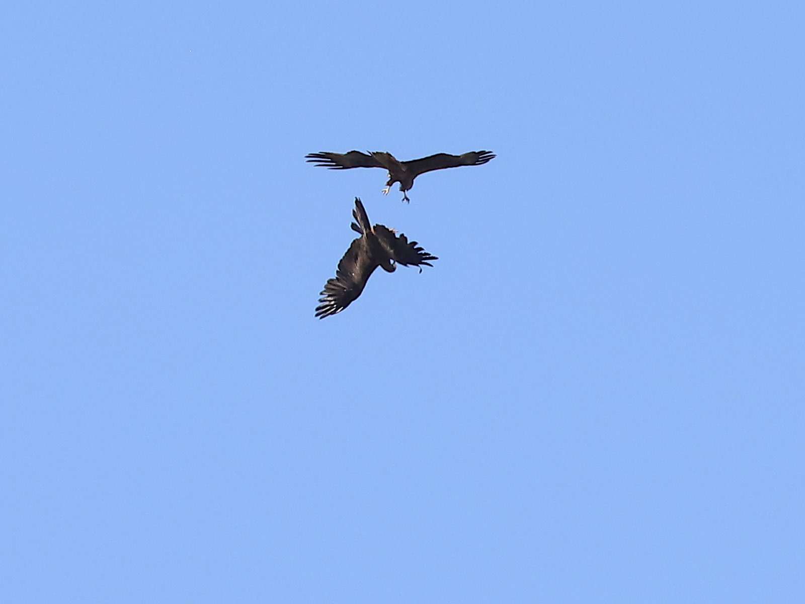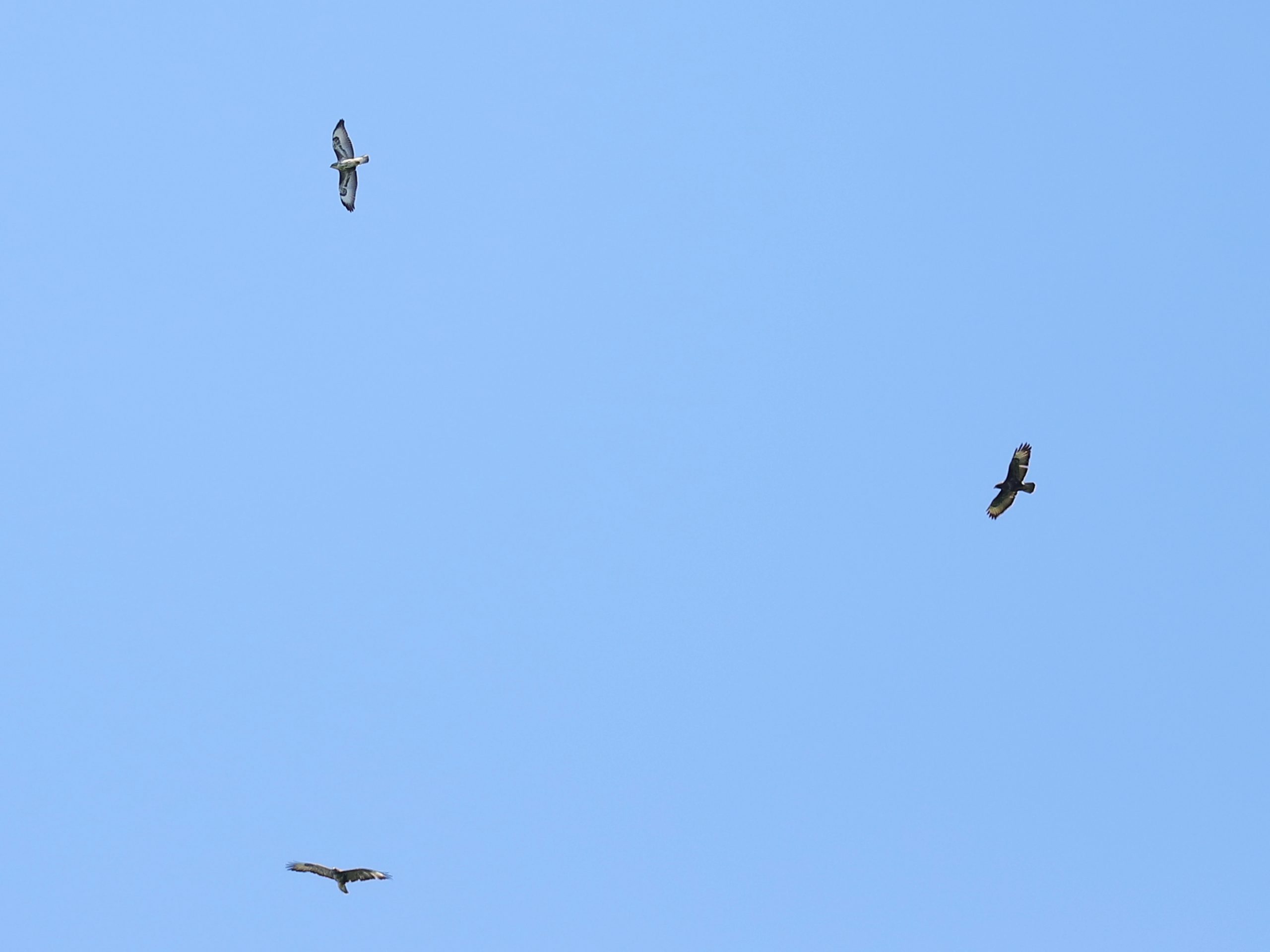 Du côté des Buses variables Buteo buteo, j’ai assisté à une joute aérienne de deux oiseaux aux caractéristiques juvéniles puisqu’ils n’ont pas de barre sombre terminale sur la queue.