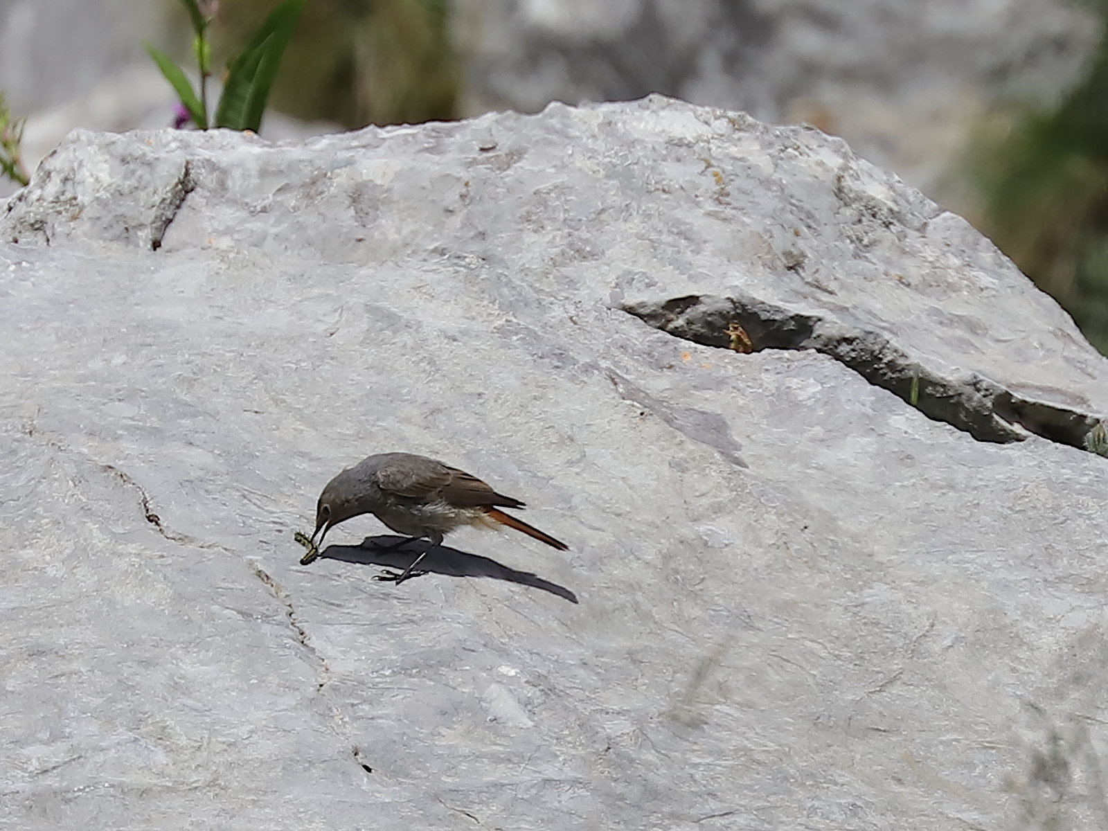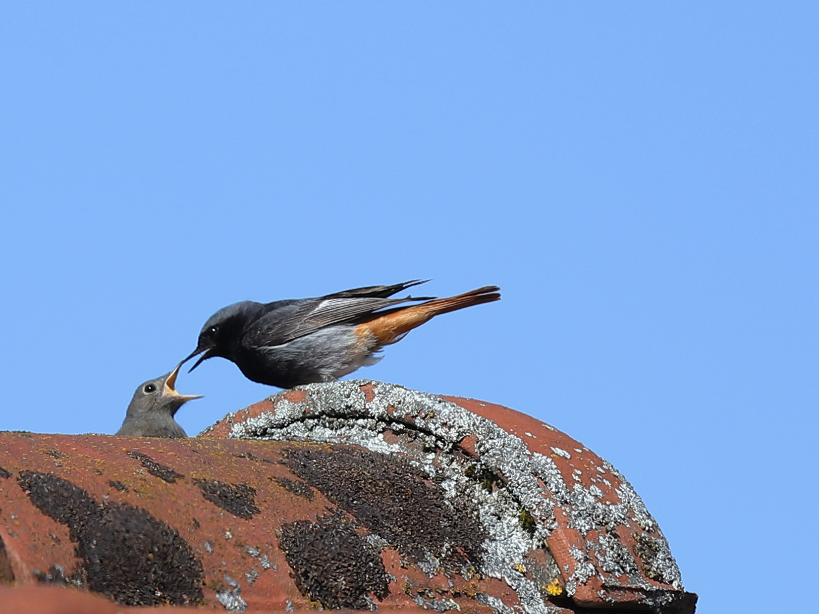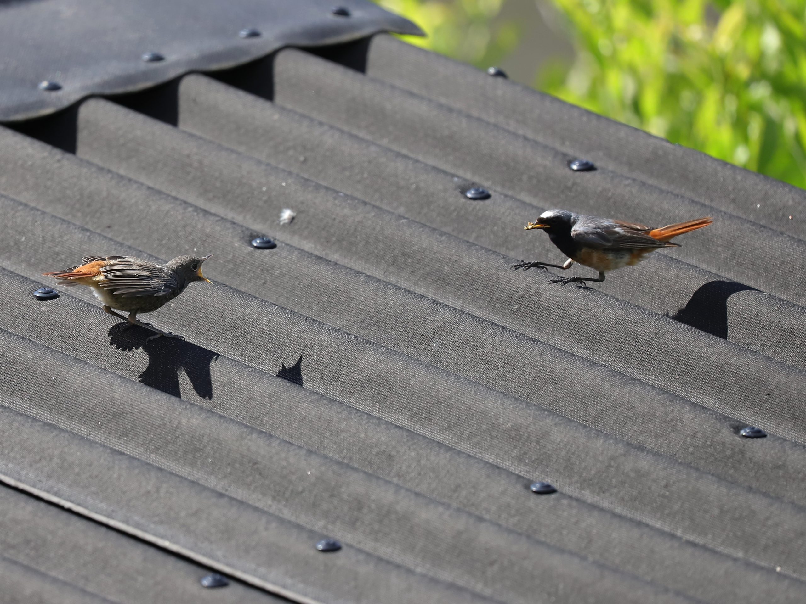… et le Rougequeuenoir Phoenicurus ochruros, une femelle en premier puis un mâle, qui file rechercher de la nourriture après avoir donné la becquée a un jeune presque autonome.