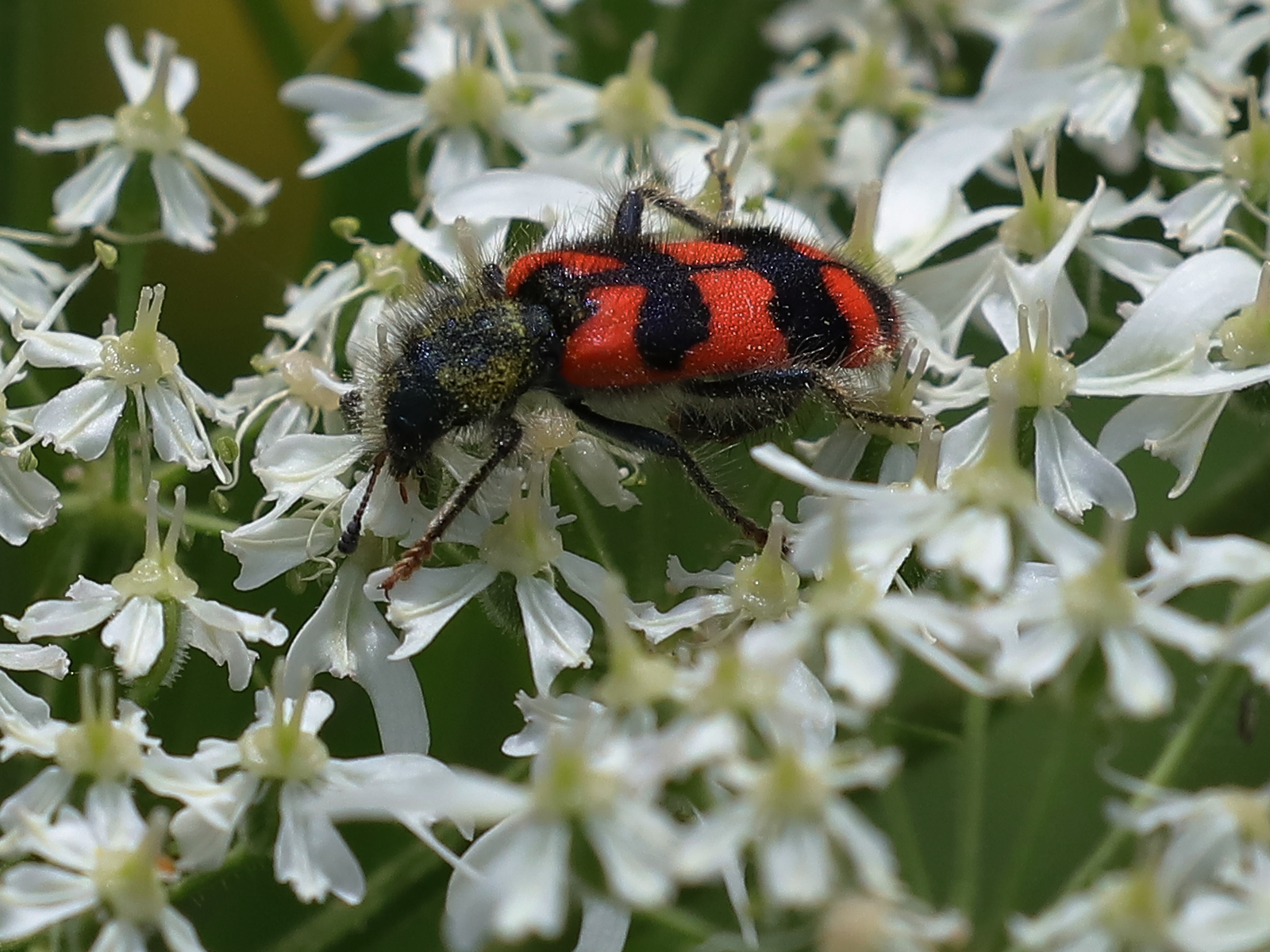 Ce joli petit coléoptère est le Clairon des abeilles Trichodes apiarus. Il se nourrit de pollen et d’insectes puis pond dans nids d’abeilles solitaires mais aussi dans les ruches d’abeilles domestiques. Ses larves se nourrissent des larves d’abeilles.