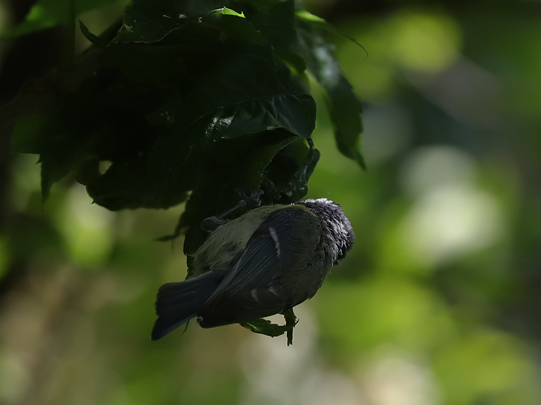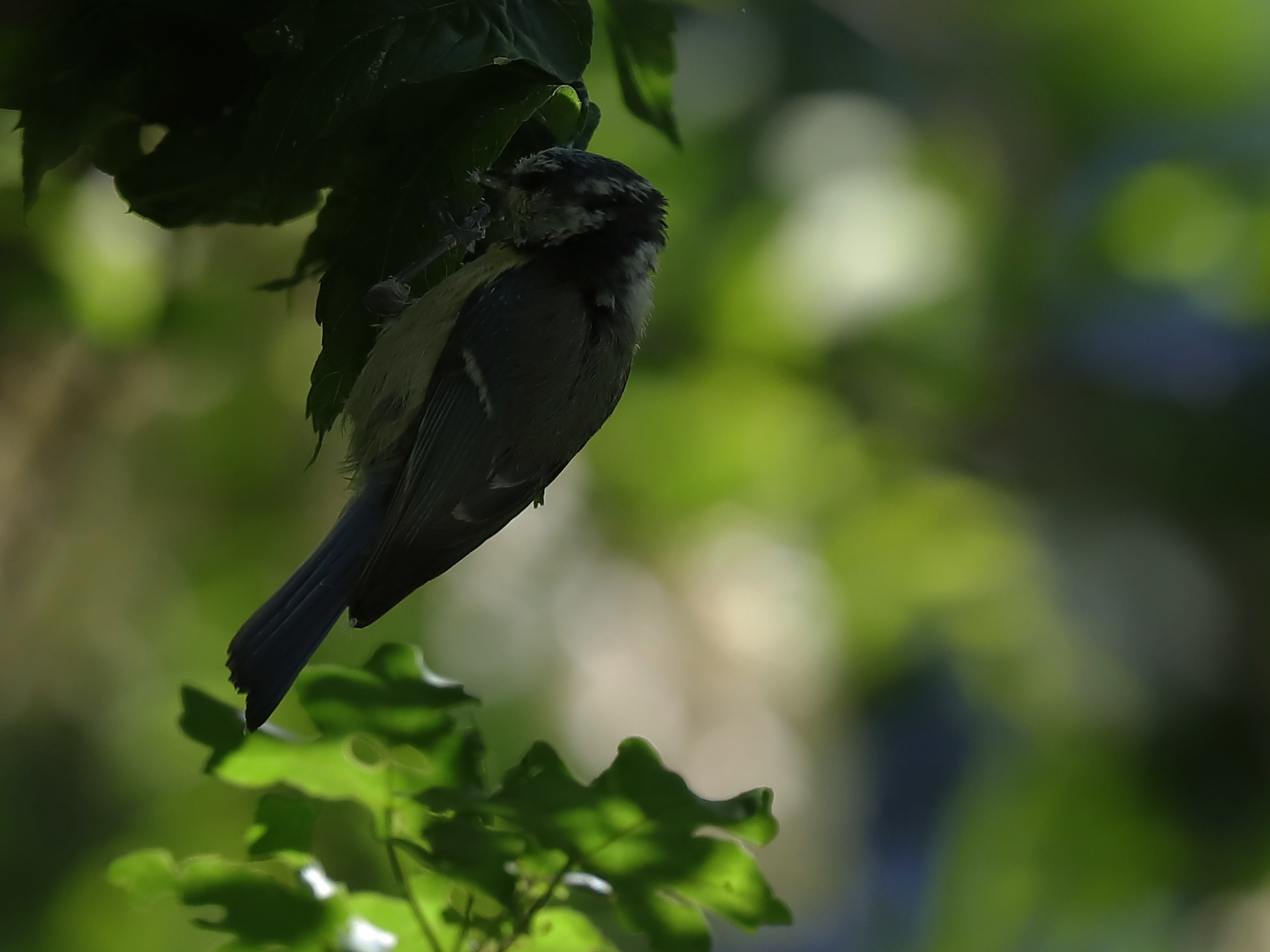 Maintenant un grand consommateur d’insectes, présent toute l’année : la Mésange bleue Cyanistes caeruleus. Elle mange les pucerons dans les feuilles enroulées par ces parasites …