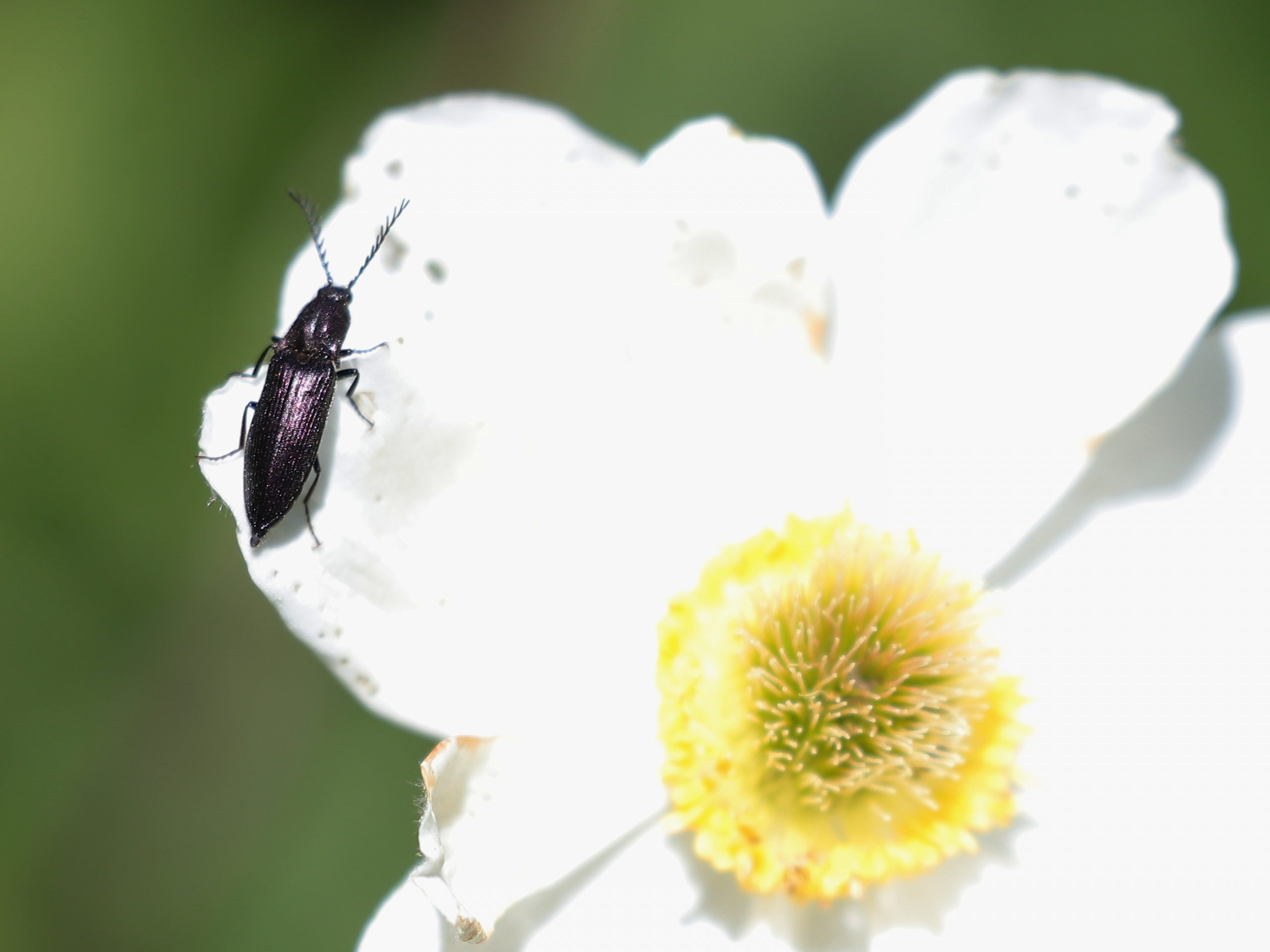 Encore un insecte avec ce coléoptère aux antennes en brosse et doont la carapace a des reflets rose-mauve.